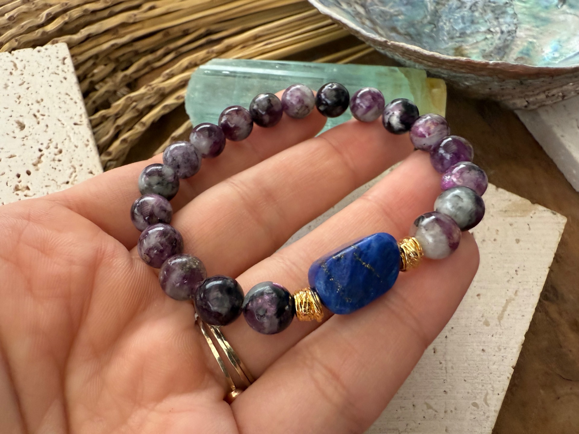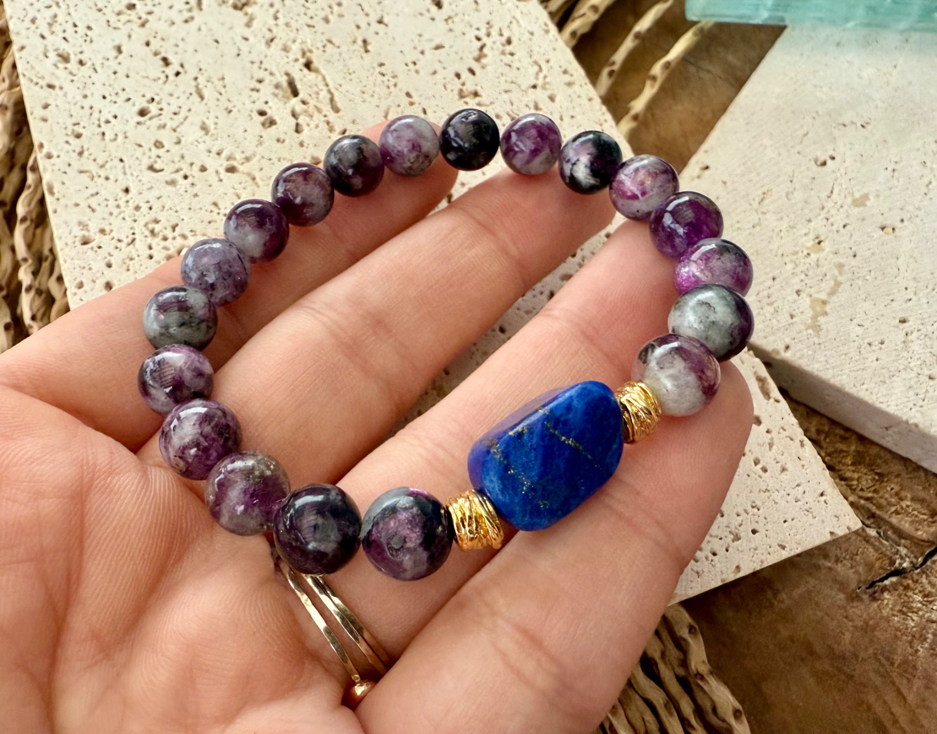 Tento náramok je stvorený pre chvíle, keď túžiš po tichu, pokoji a spojení so svojou vnútornou múdrosťou. Kombinácia lepidolitu AAA a lapisu lazuli prináša energiu rovnováhy – medzi mysľou a srdcom, medzi nebom a Zemou.