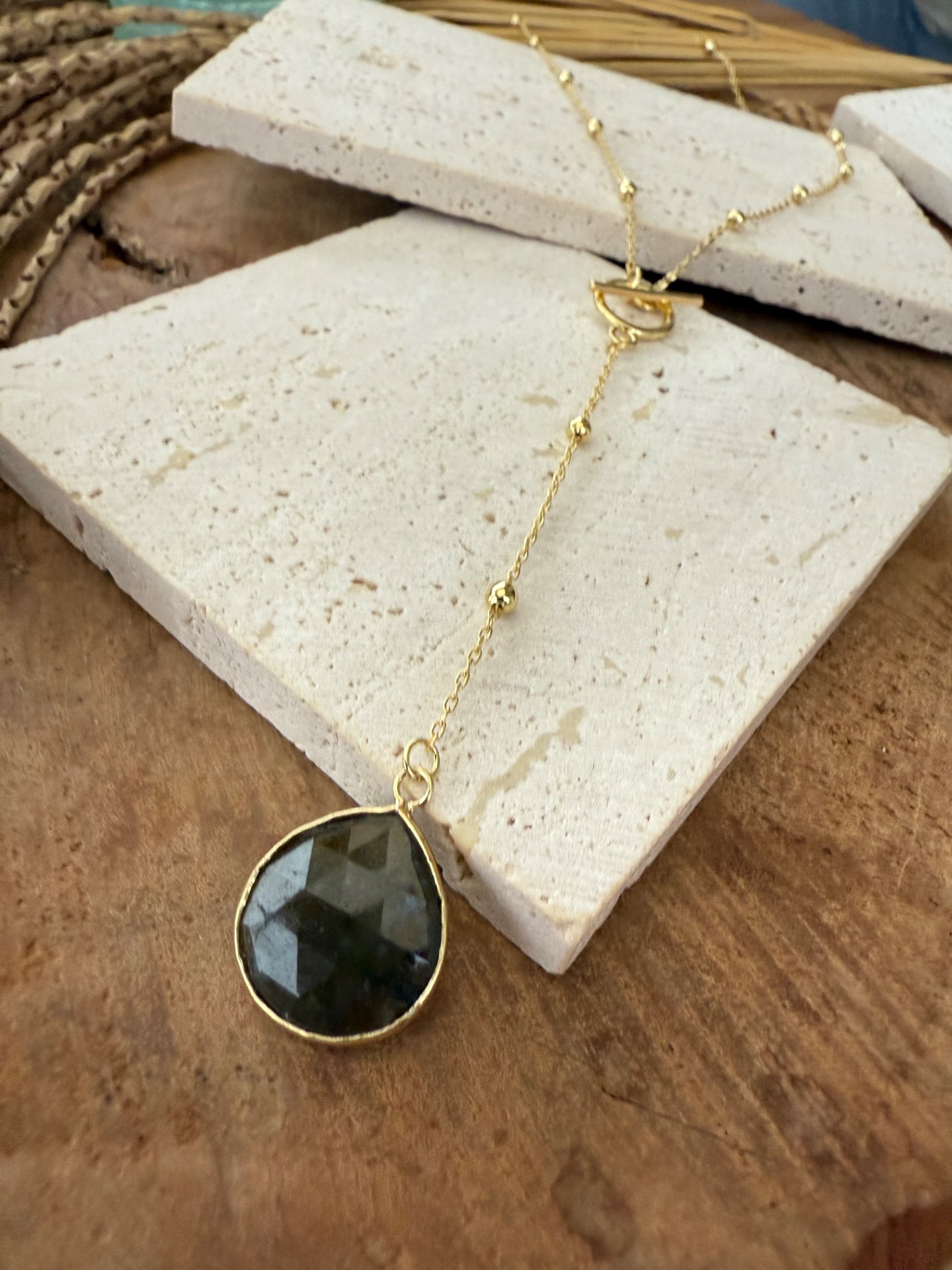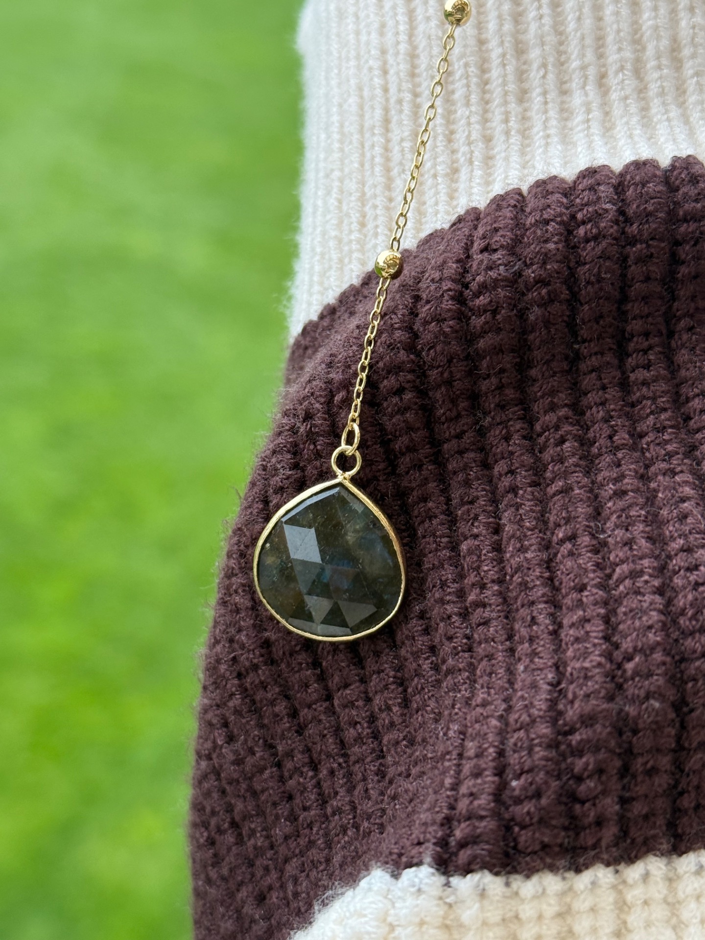 (18k gold plated Y retiazka, 45,7 cm, prívesok labradorit slza, fazetovaný výbrus)