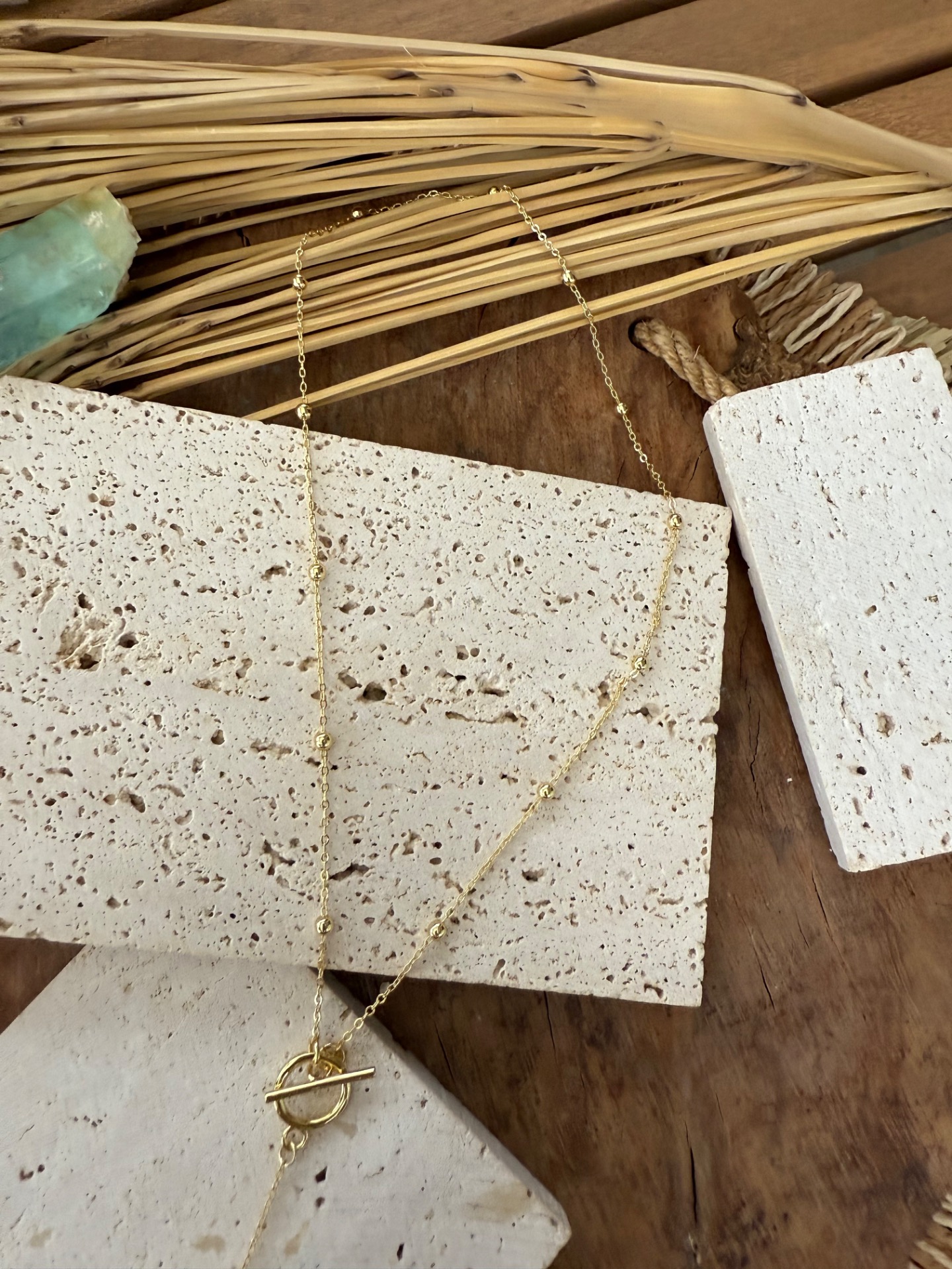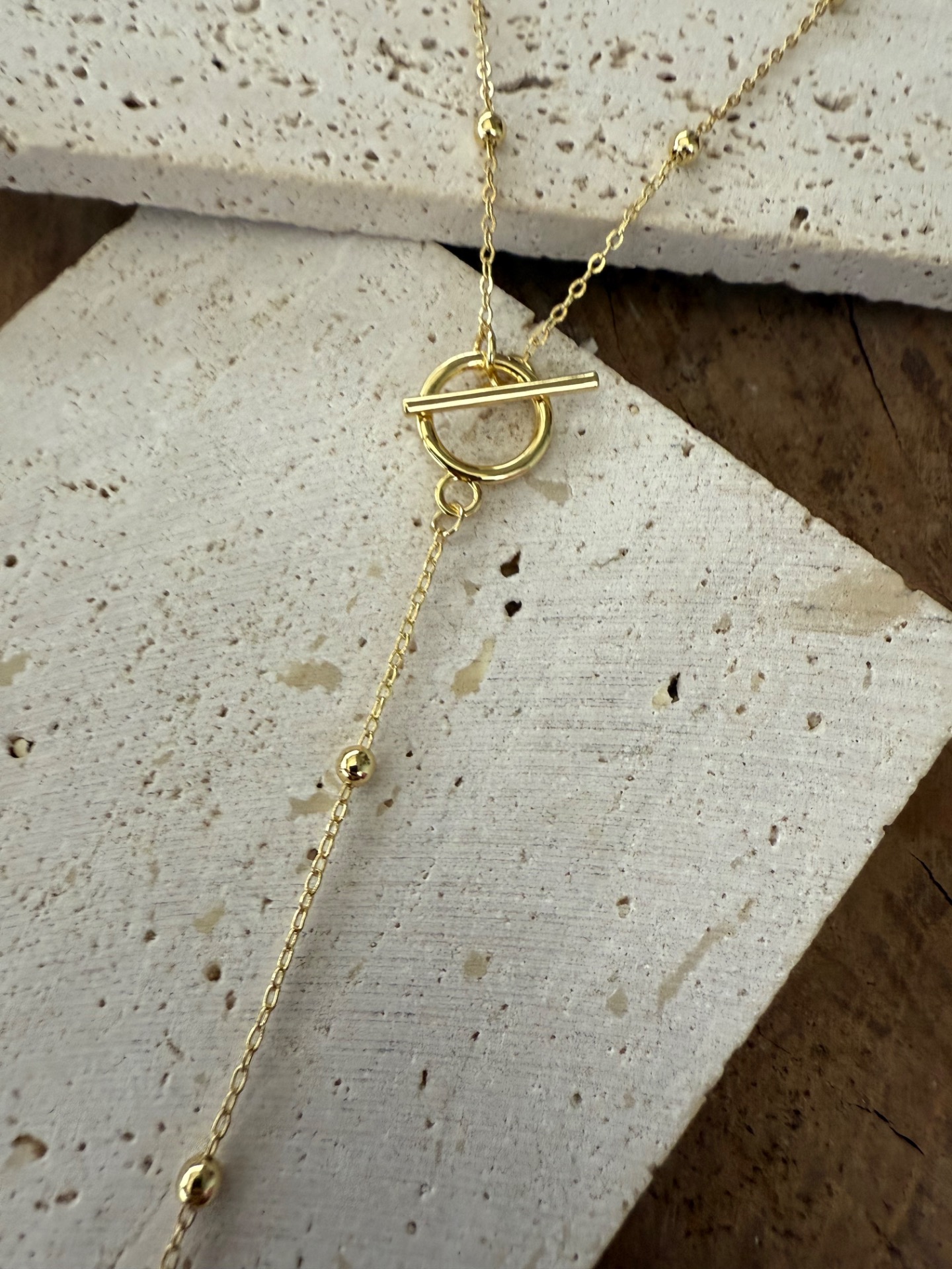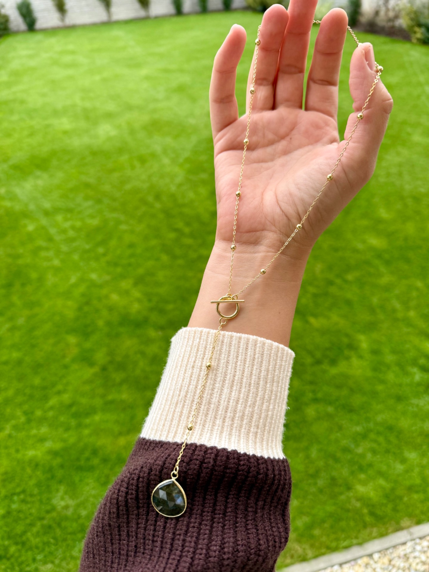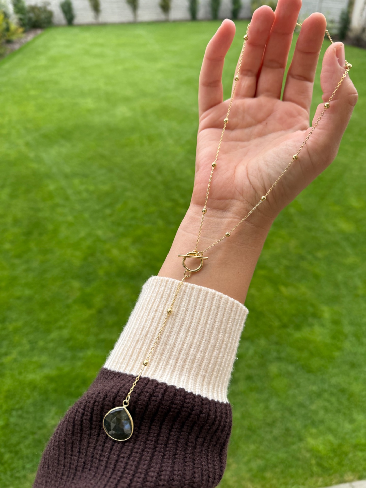 Elegantná Y retiazka s jemným zlatým leskom 18k gold plated spája nadčasovú eleganciu s mystickou energiou labradoritu. Na jej konci visiaca fázetovaná slza labradoritu prináša ochranu, vnútornú silu a podporuje spojenie s intuíciou.