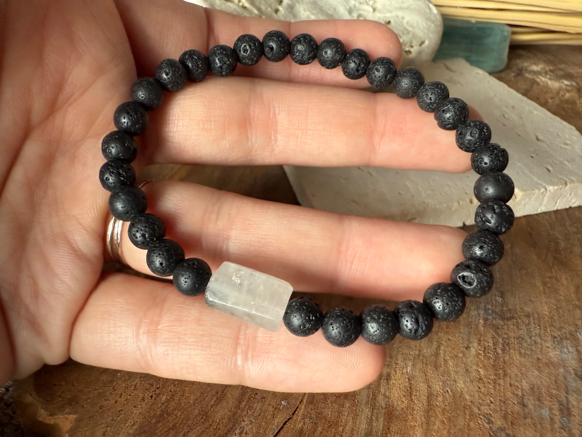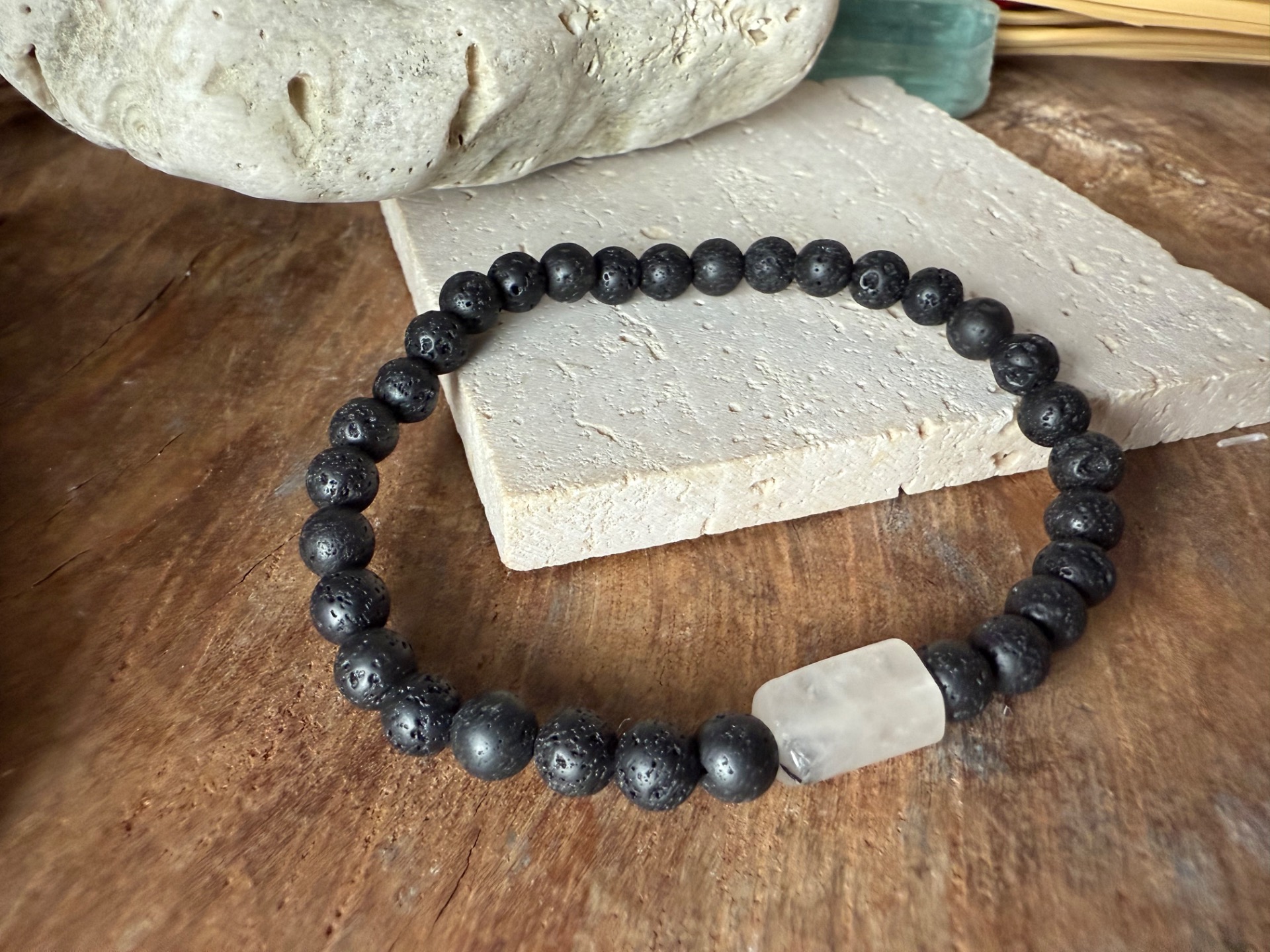 Náramok je vyrobený z lávového kameňa s veľkosťou korálok 6 mm. Dominantným prvkom je horský krištáľ v tvare obdĺžnika, ktorý dodáva šperku čistý a moderný vzhľad. Dĺžka náramku je 19 cm. Ide o jedinečný kus, dostupný ako kusovka.