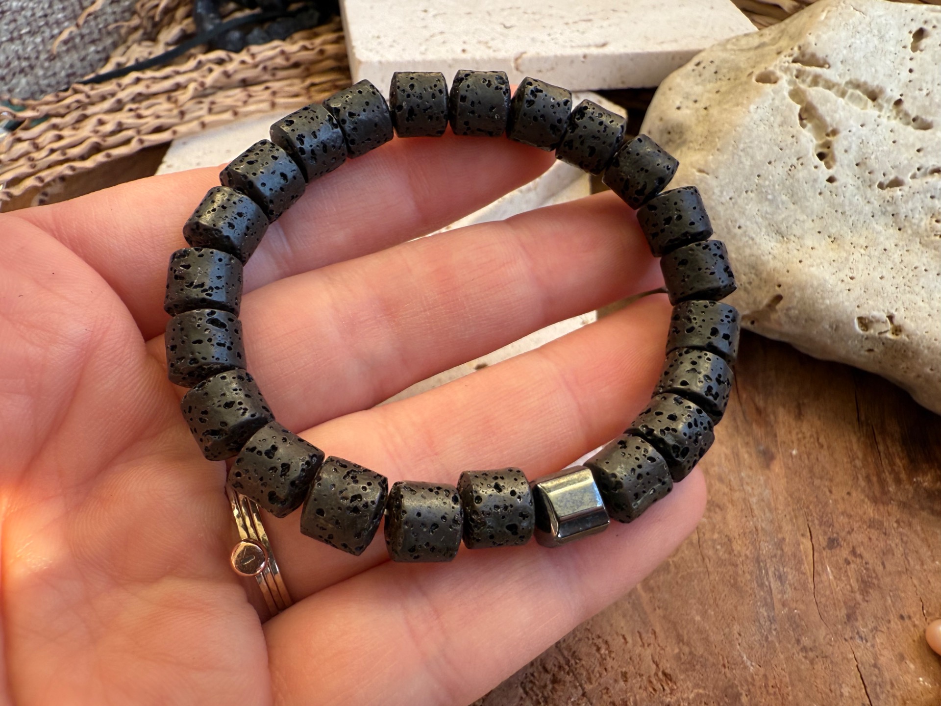 Minimalistický, zemitý náramok s hlbokou, upokojujúcou energiou je vytvorený z lávového kameňa v tvare valčekov, doplnený jedným ochranným prvkom z hematitu. Tento náramok pôsobí ako tichý oporný bod v každodennom zhone – prináša vnútorný pokoj, stabilitu a pocit bezpečia.