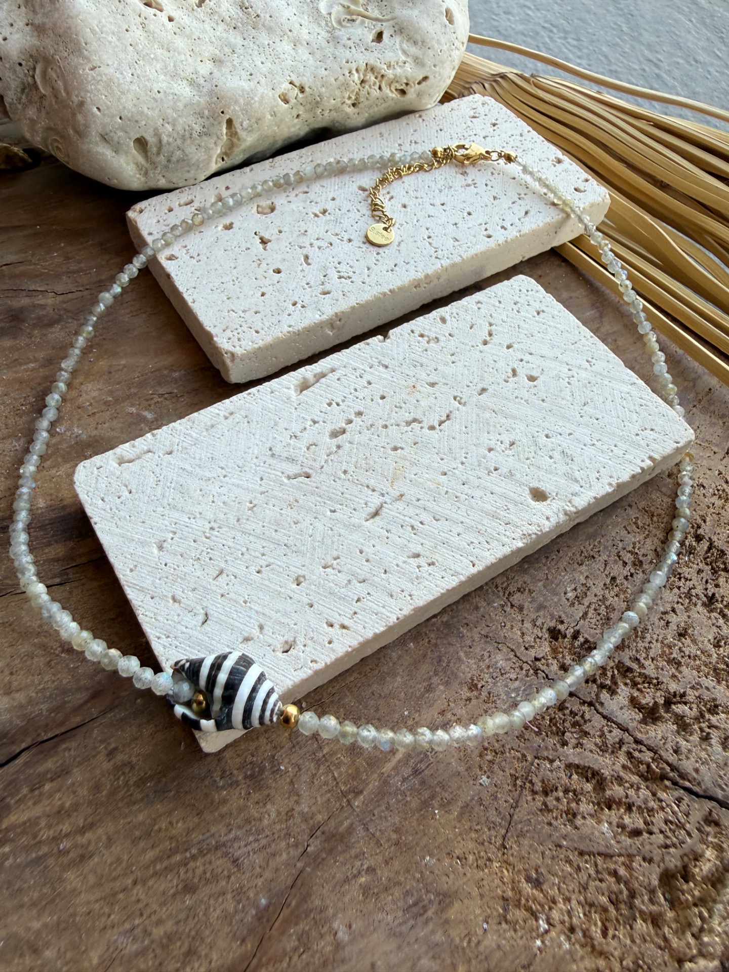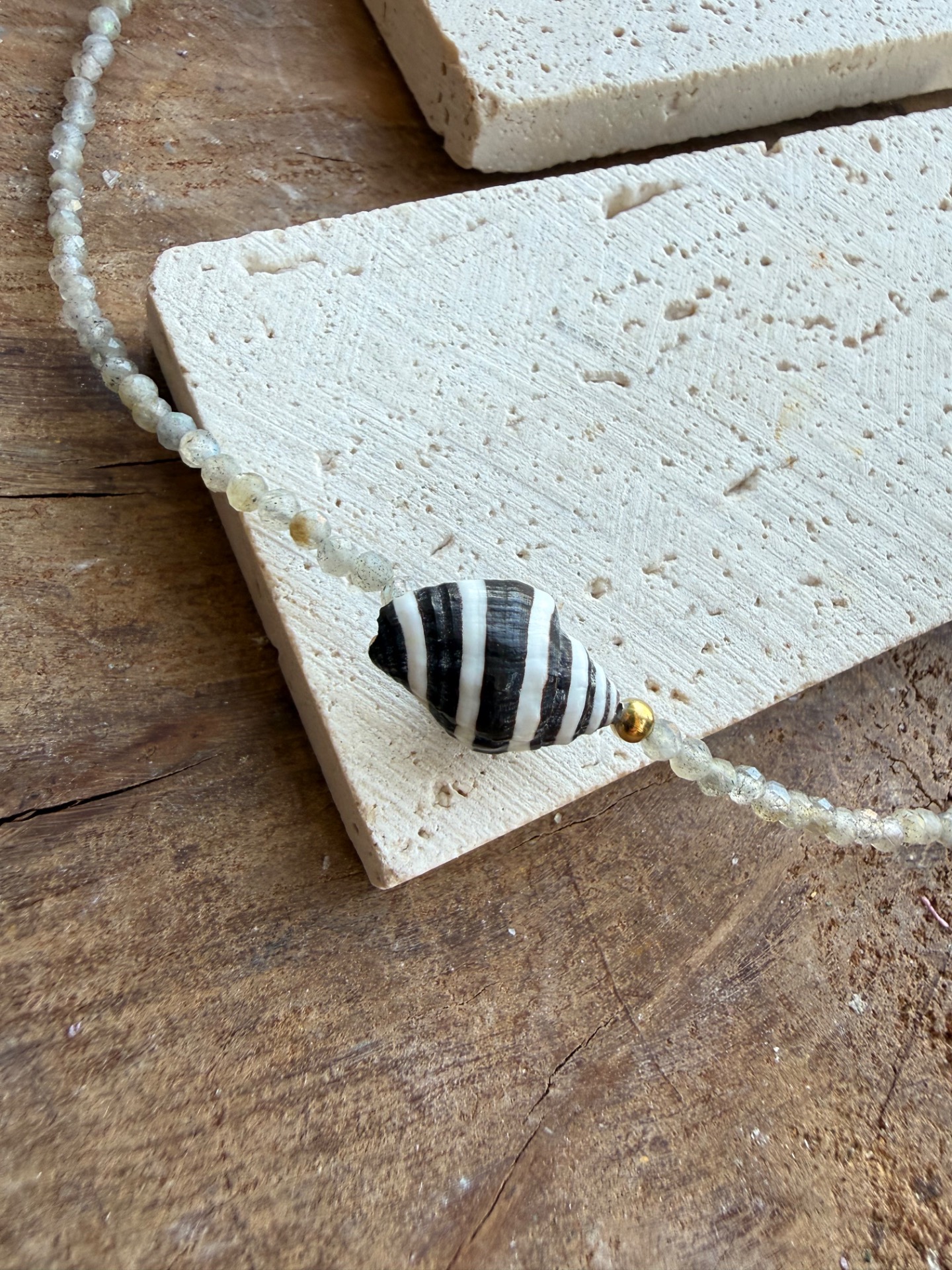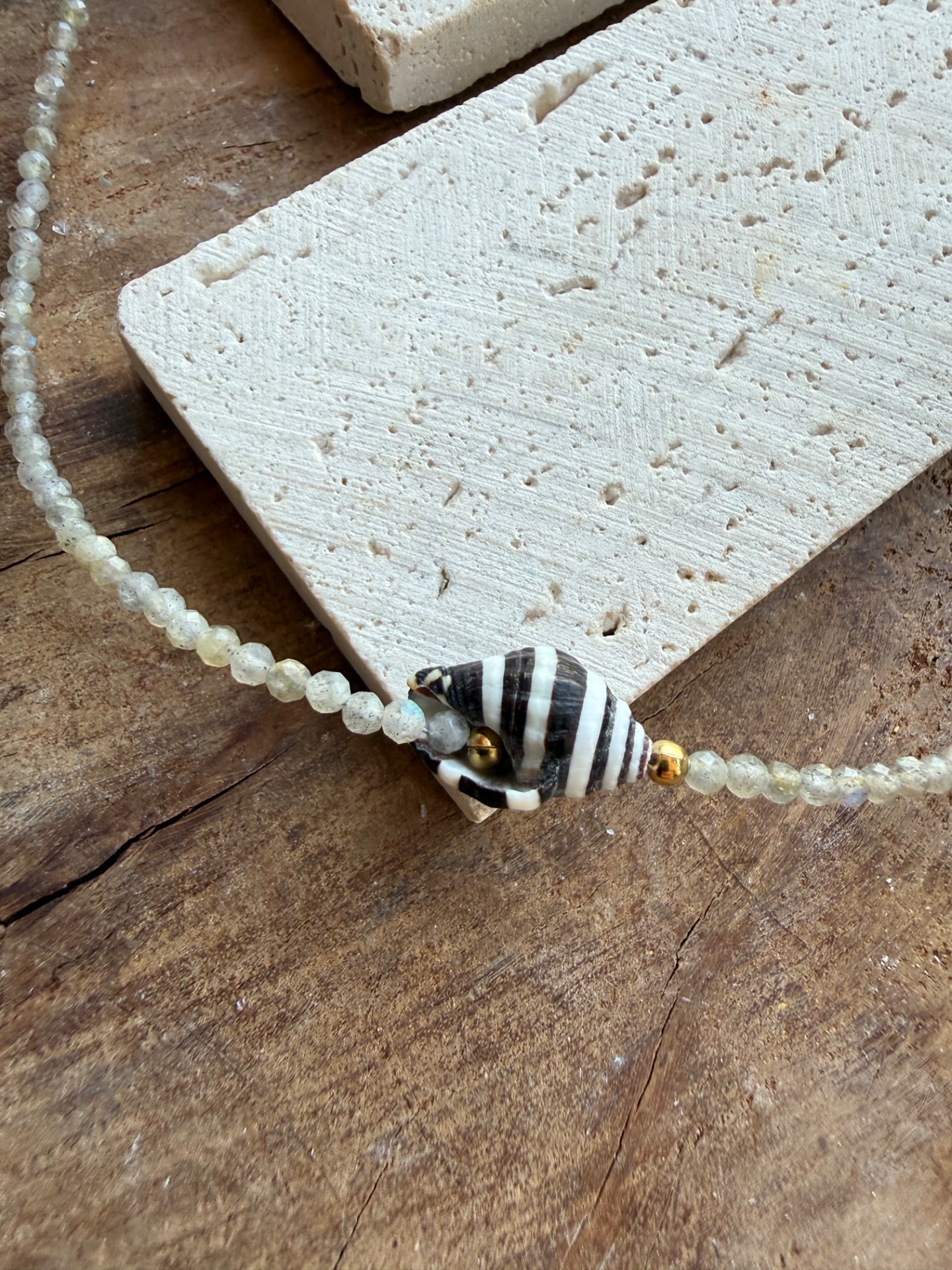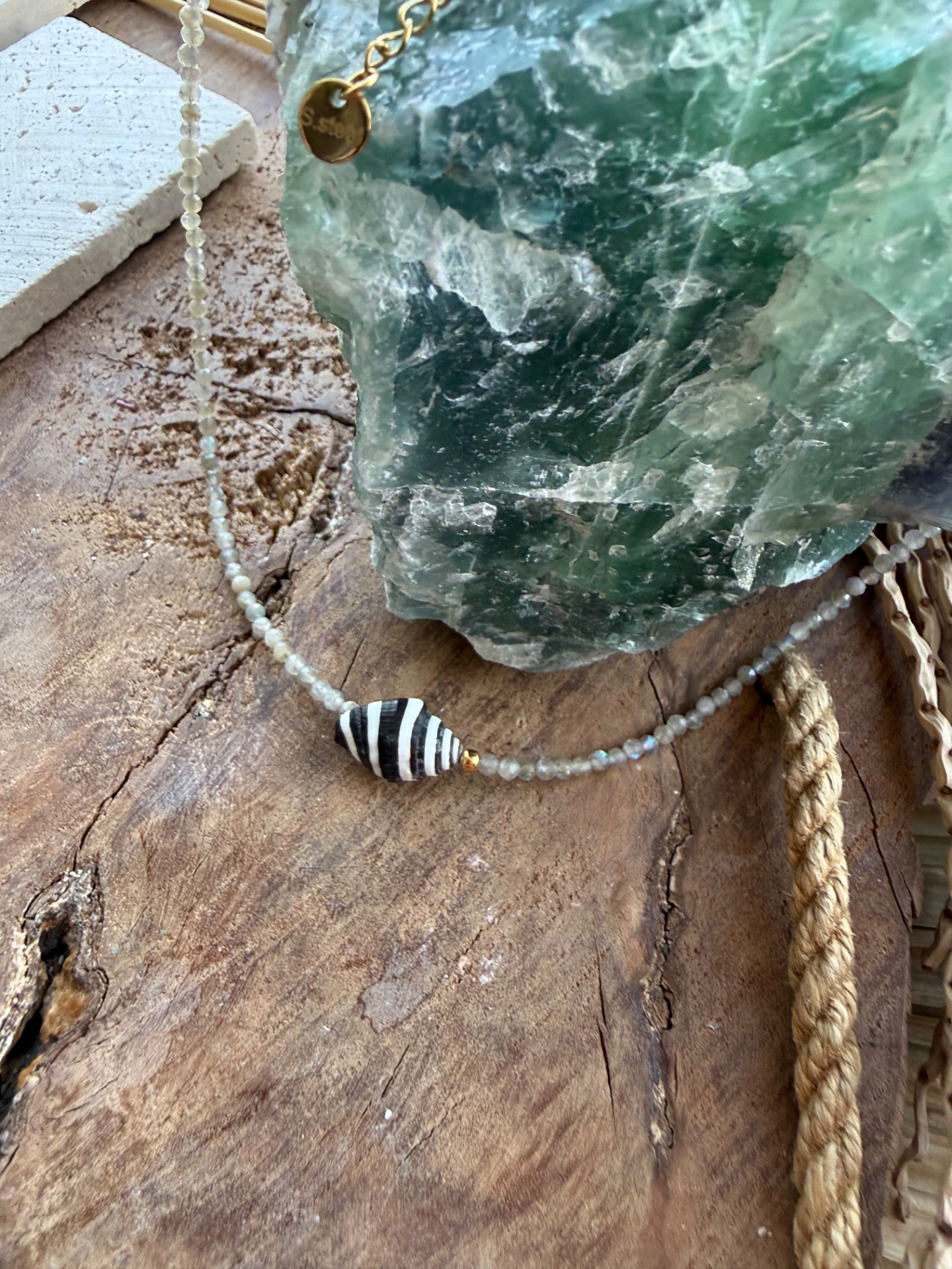 Jemný choker náhrdelník z fazetovaného labradoritu (2 mm) doplnený o čierno-bielu pásikavú mušličku v sebe nesie tajomstvo oceánu, hĺbku intuície a jemnú iskru, ktorá sa odhalí len pri správnom svetle.