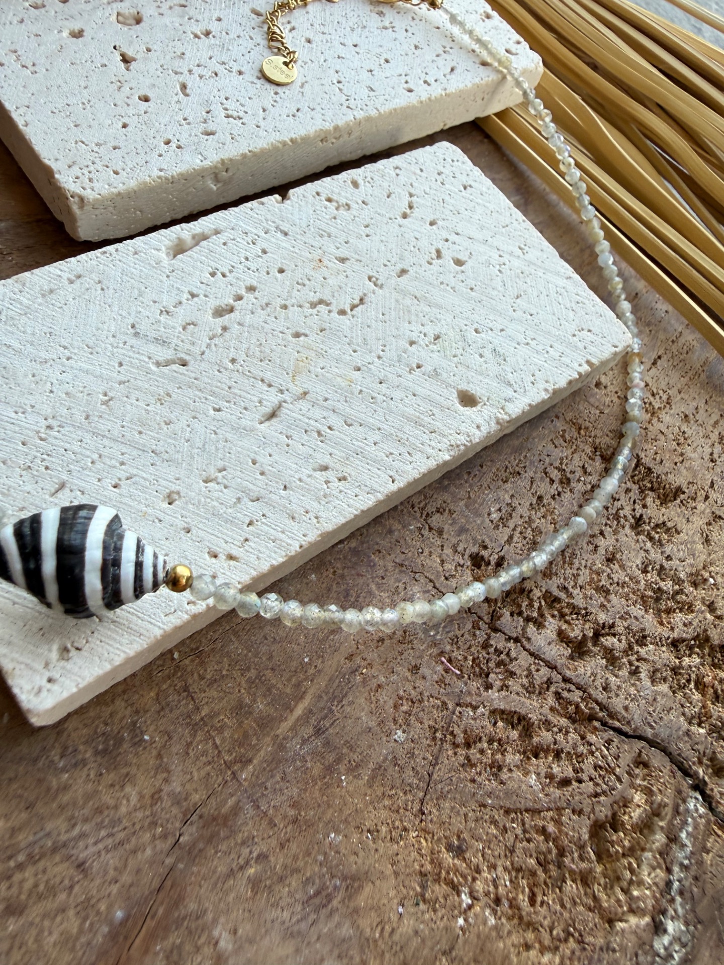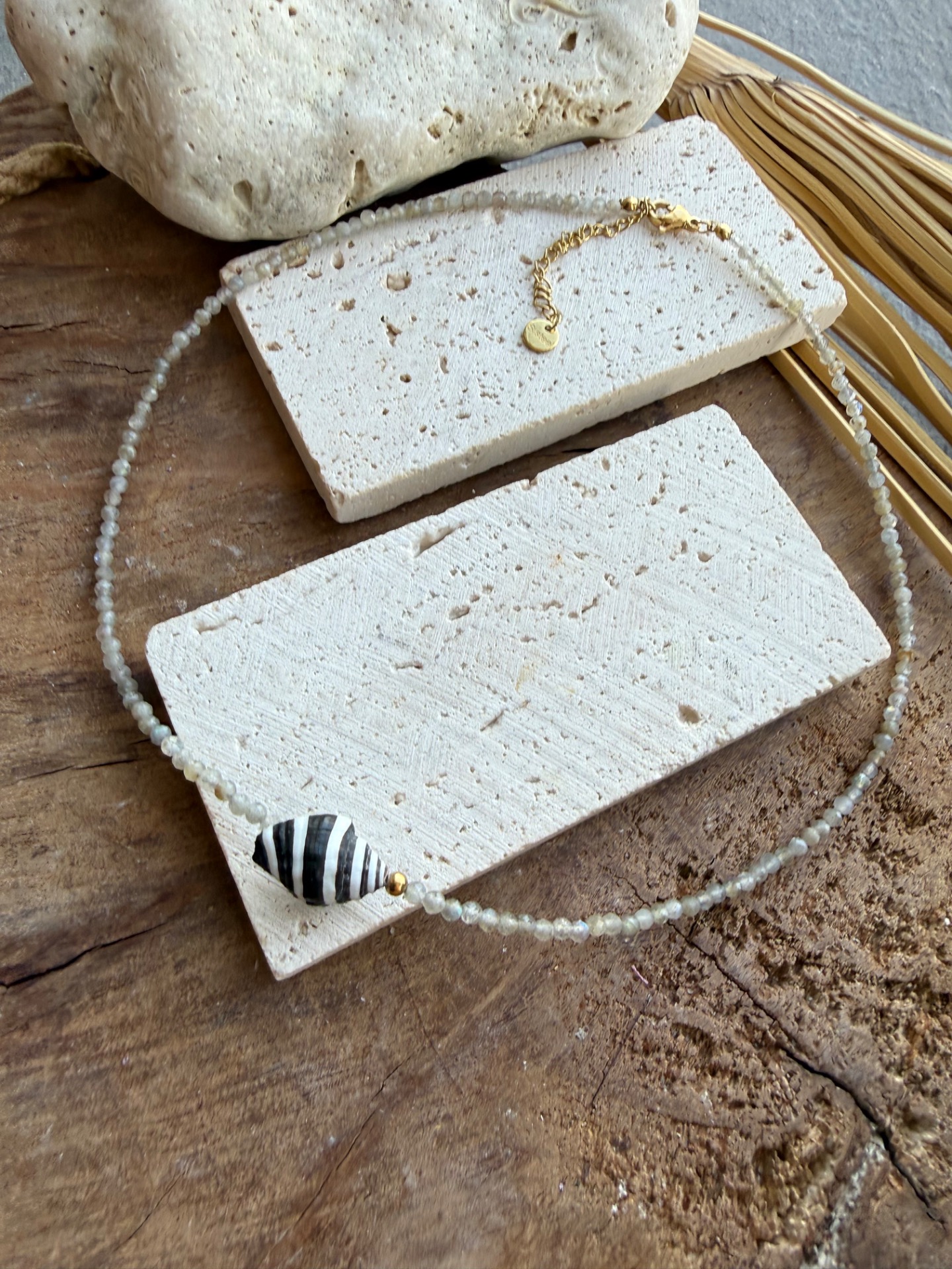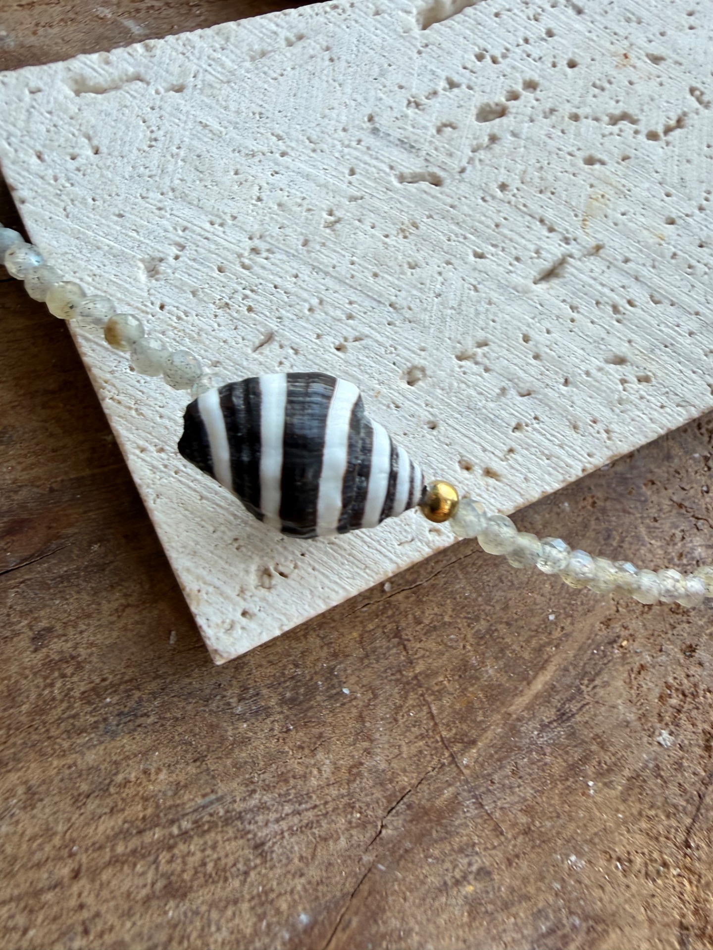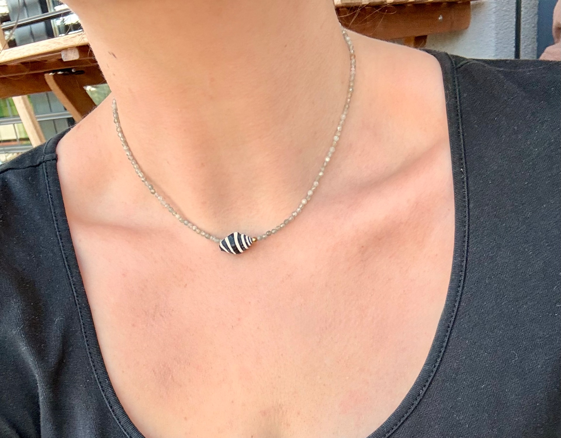 Jemný choker náhrdelník z fazetovaného labradoritu (2 mm) doplnený o čierno-bielu pásikavú mušličku v sebe nesie tajomstvo oceánu, hĺbku intuície a jemnú iskru, ktorá sa odhalí len pri správnom svetle.