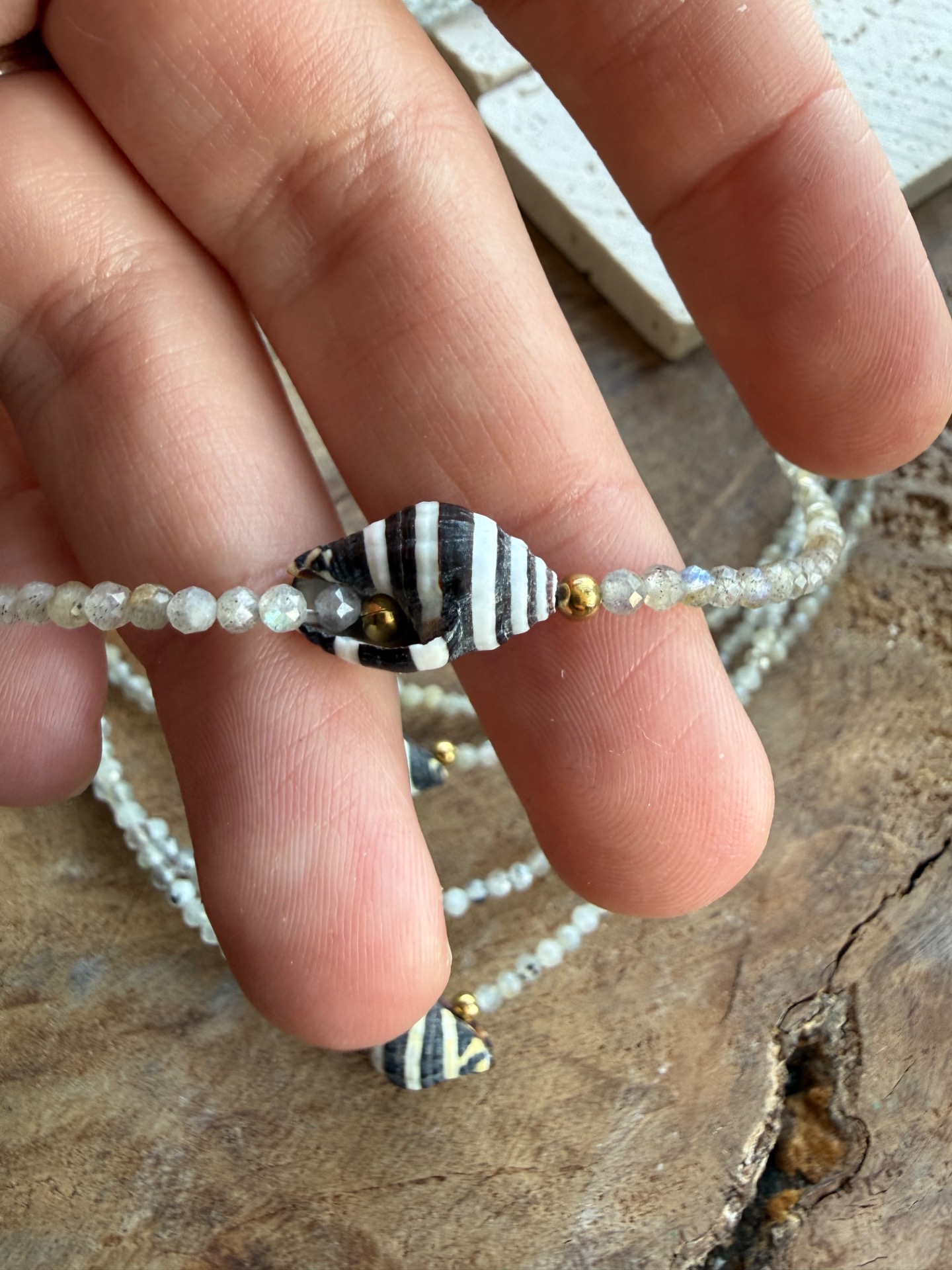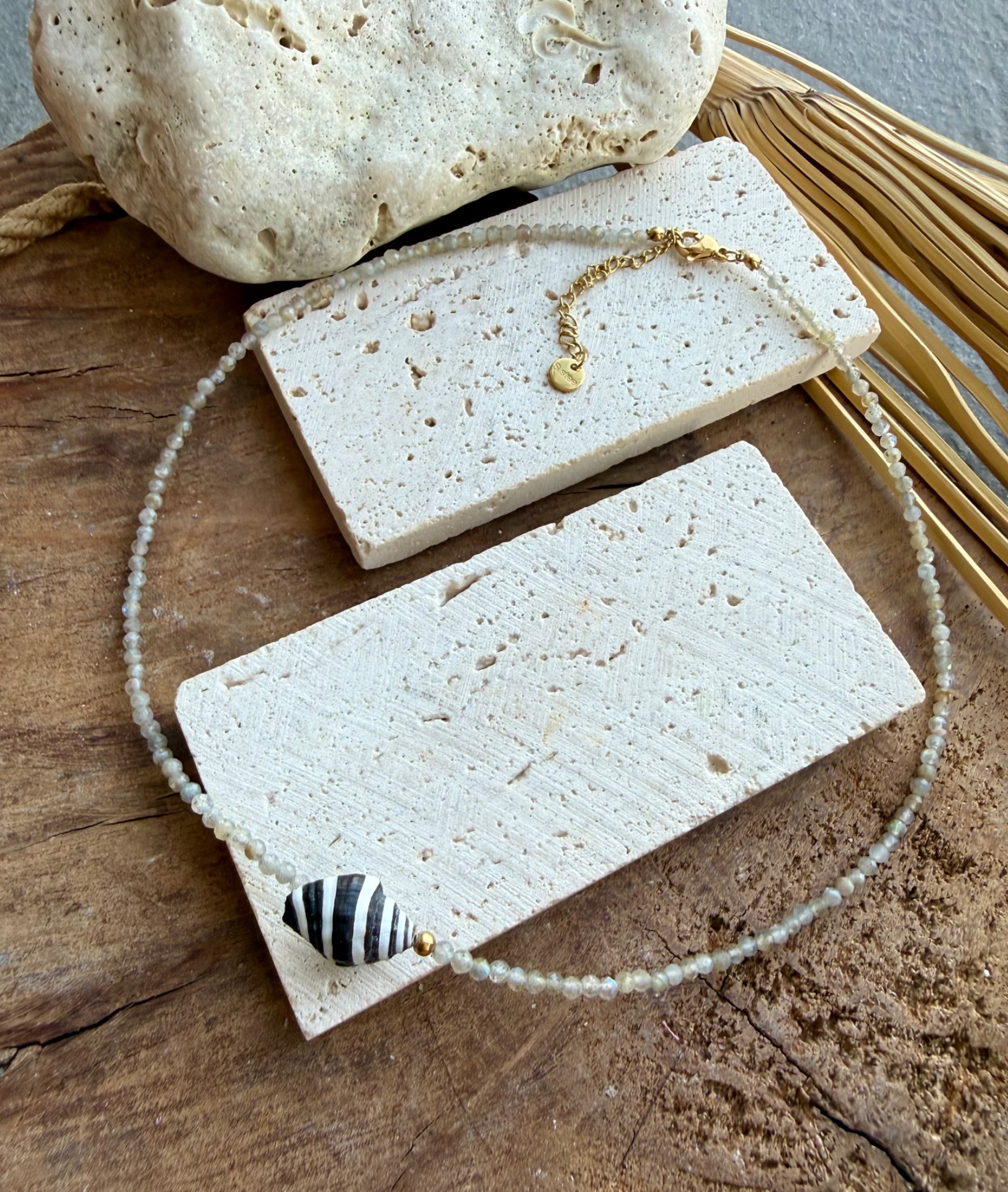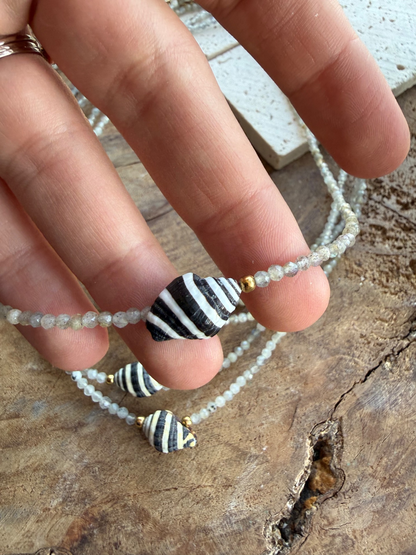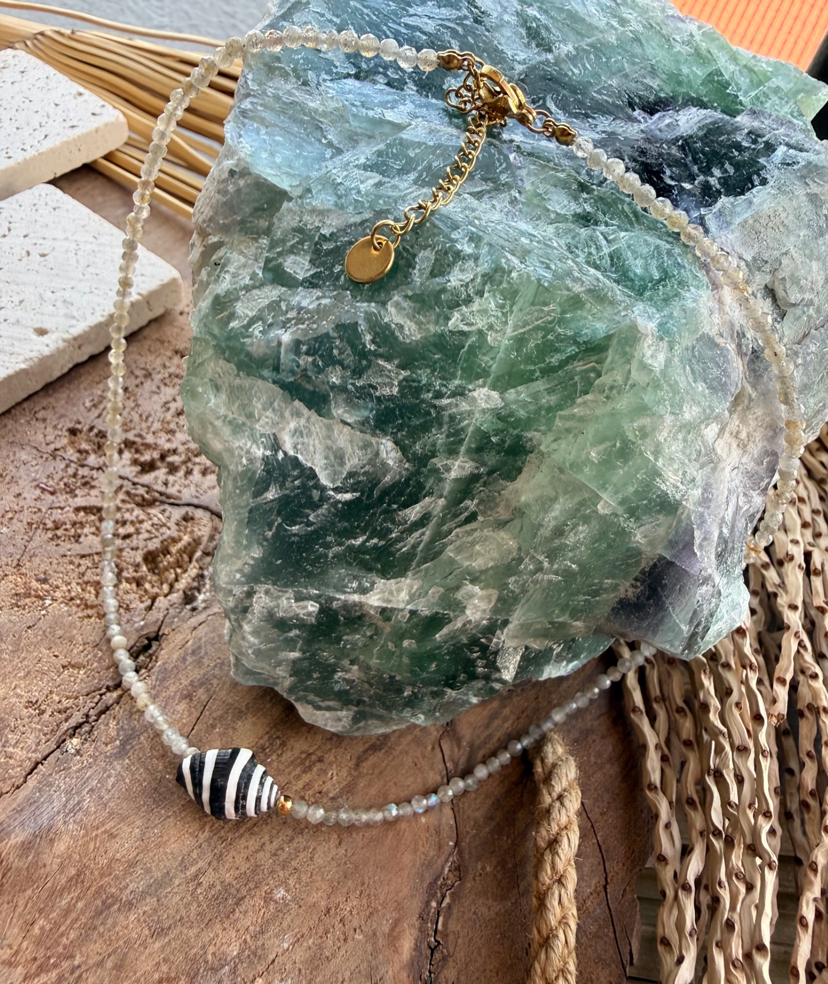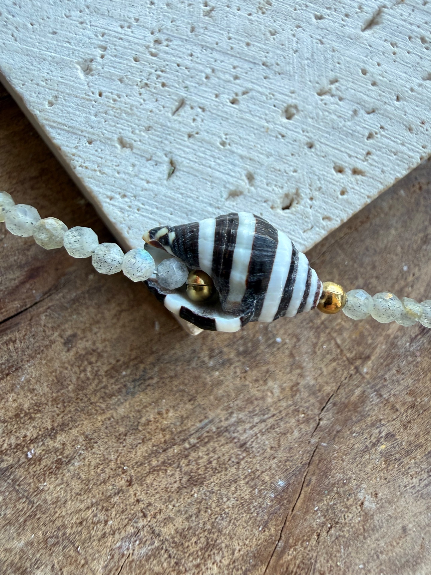 Jemný choker náhrdelník z fazetovaného labradoritu (2 mm) doplnený o čierno-bielu pásikavú mušličku v sebe nesie tajomstvo oceánu, hĺbku intuície a jemnú iskru, ktorá sa odhalí len pri správnom svetle.