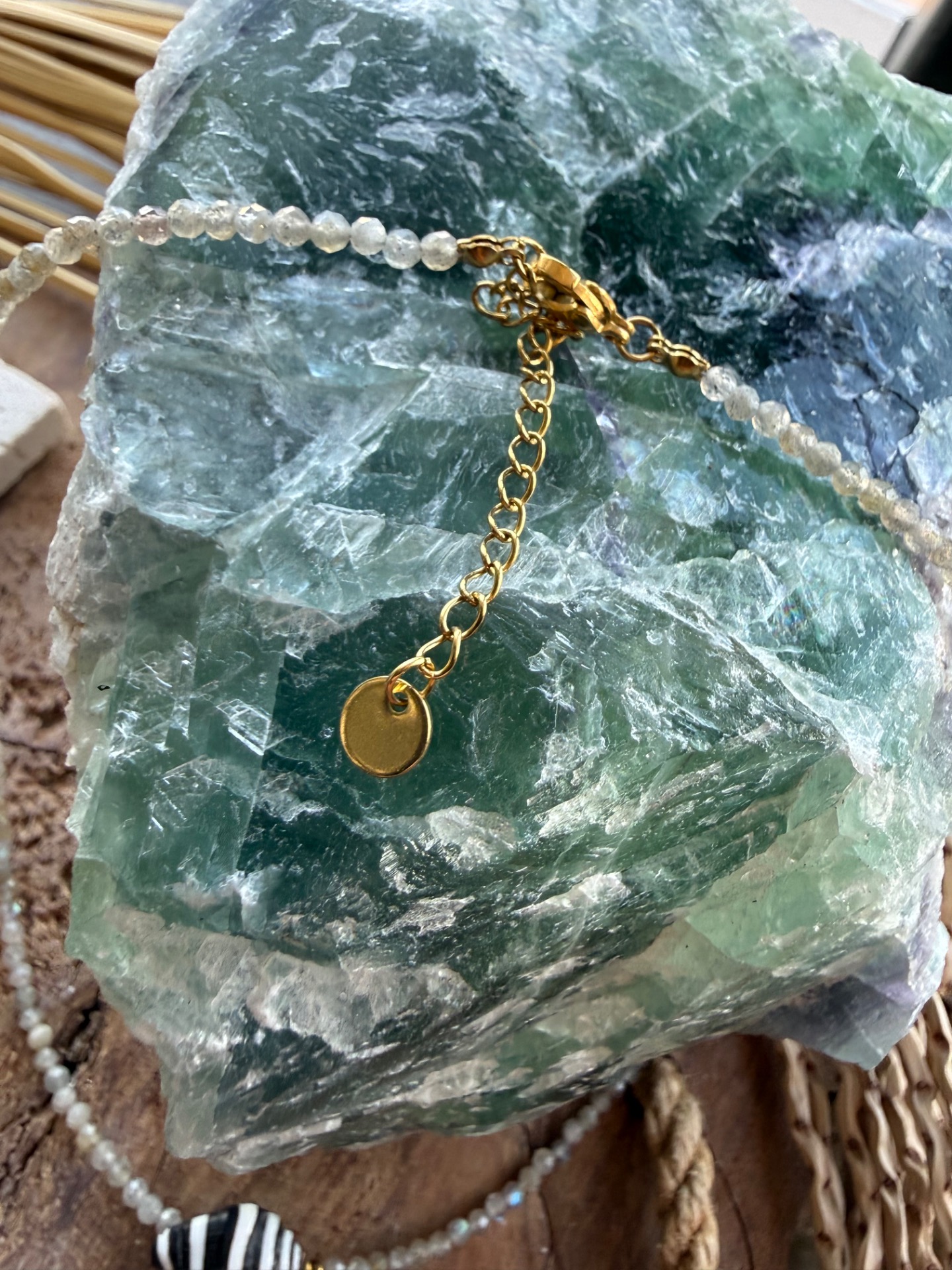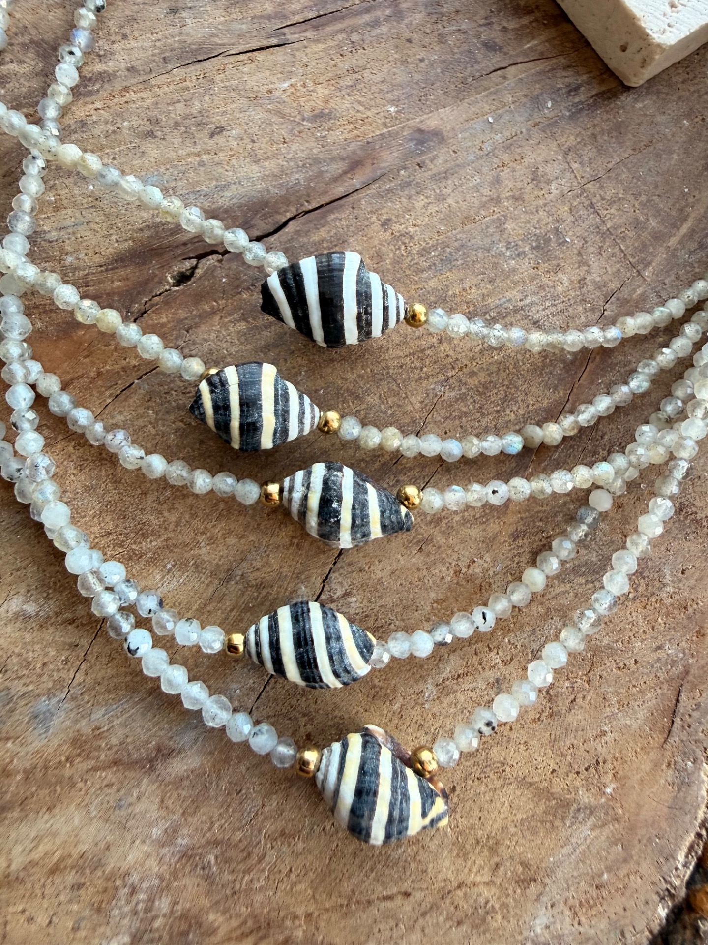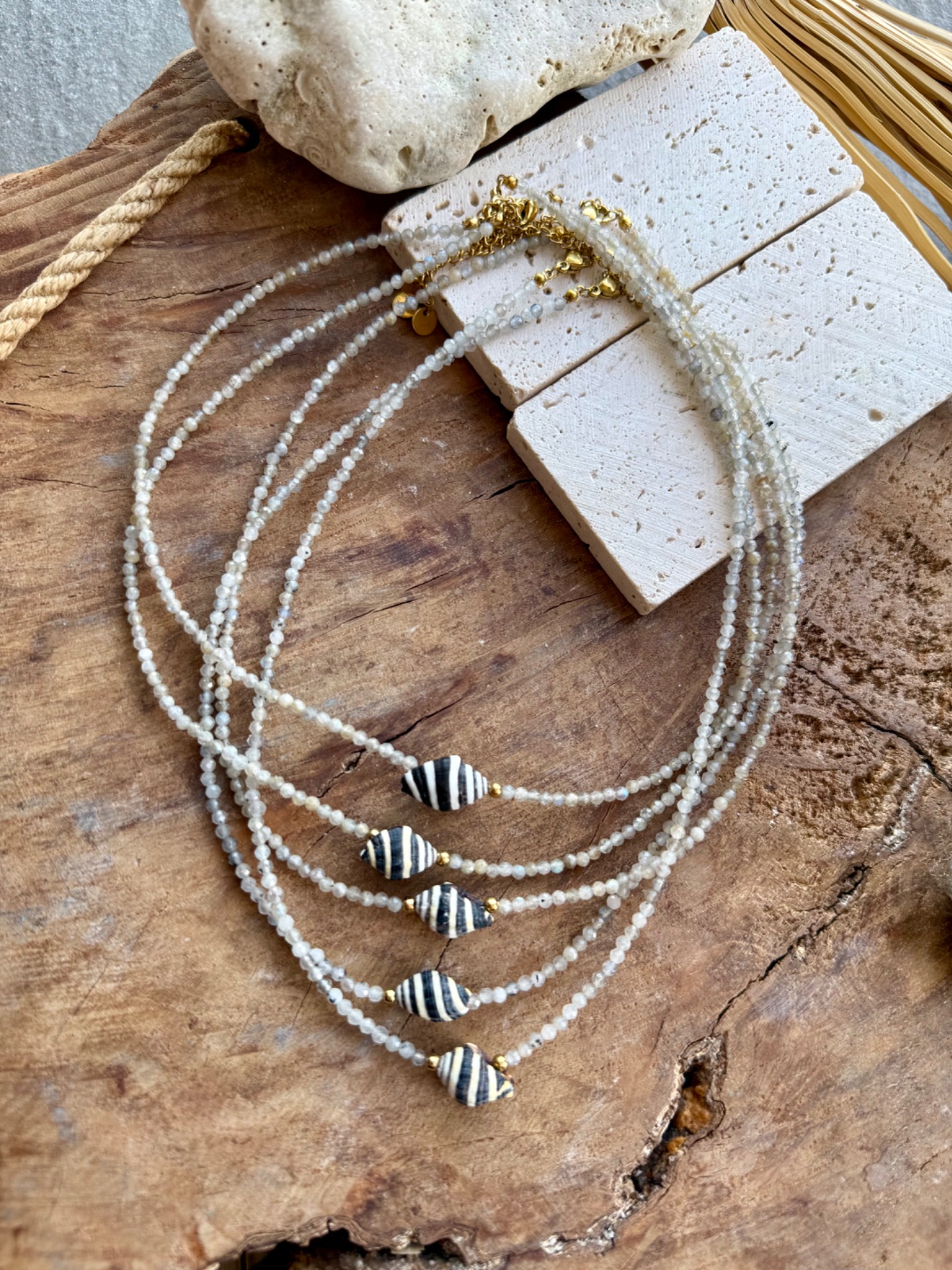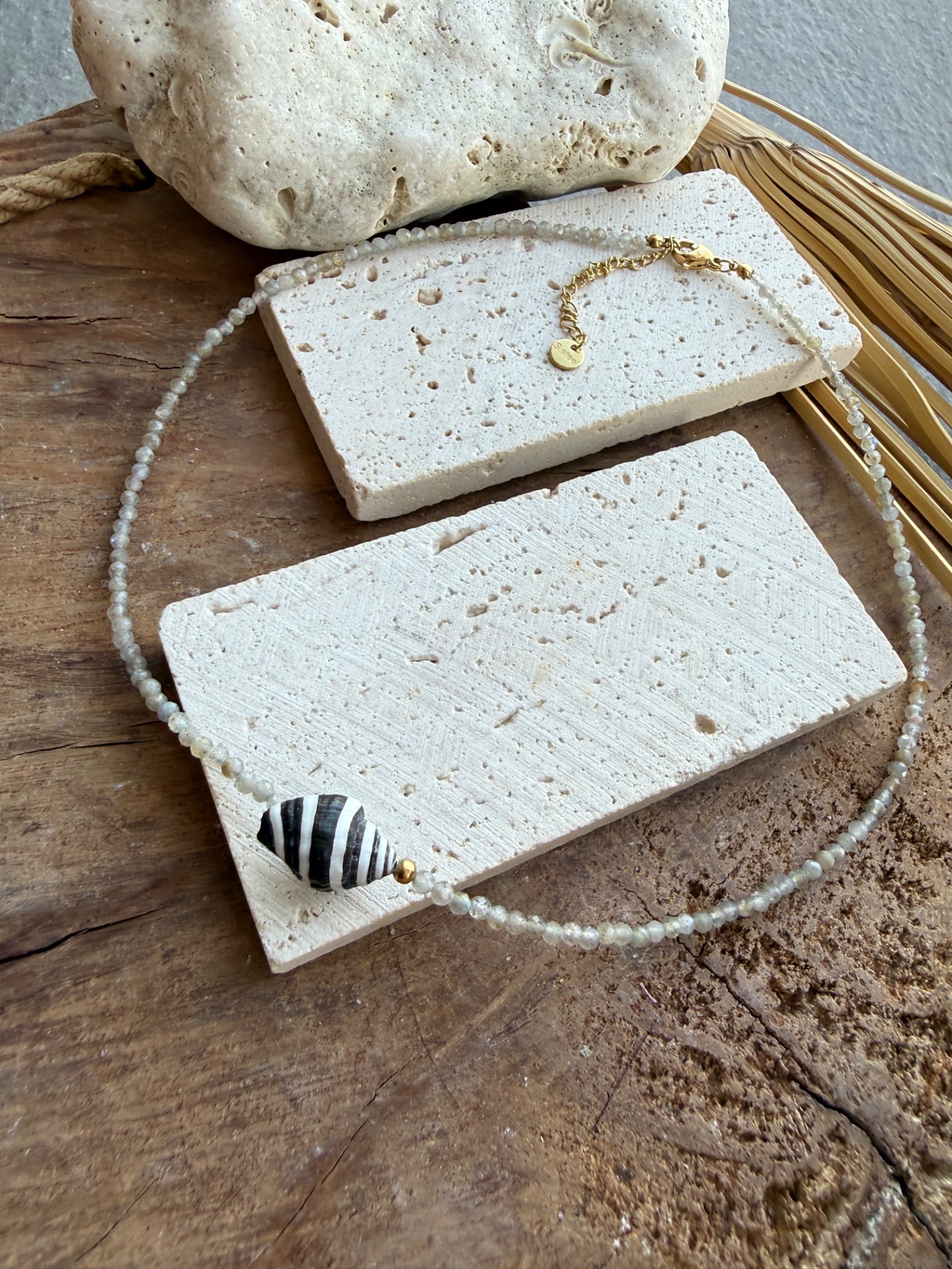 Jemný choker náhrdelník z fazetovaného labradoritu (2 mm) doplnený o čierno-bielu pásikavú mušličku v sebe nesie tajomstvo oceánu, hĺbku intuície a jemnú iskru, ktorá sa odhalí len pri správnom svetle.