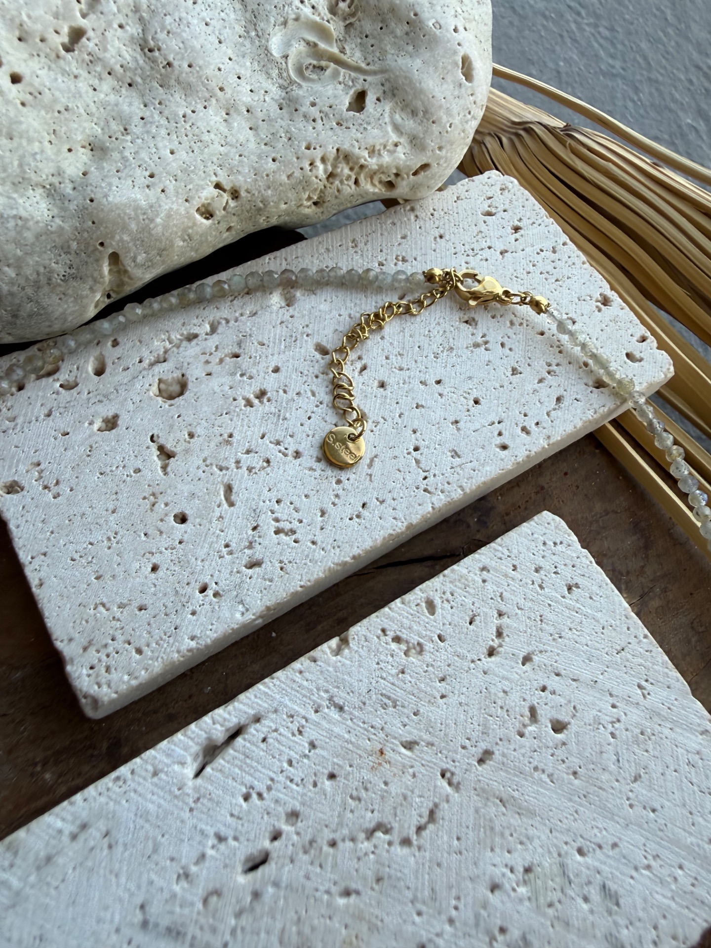 Fazetový výbrus dodáva drobným 2 mm korálkam jemný lesk a eleganciu, vďaka čomu náhrdelník pôsobí luxusne, no stále prirodzene. Každý pohyb zachytí svetlo a vytvára nenápadný, no očarujúci efekt.