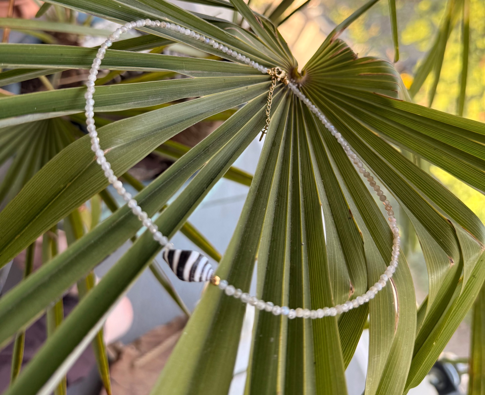 Čierno-biela pásikavá mušlička vnáša do šperku kontrast, rytmus a oceánsku energiu. Symbolizuje rovnováhu medzi svetlom a tieňom, medzi pokojom a silou – pripomína, že aj protiklady môžu existovať v harmónii.