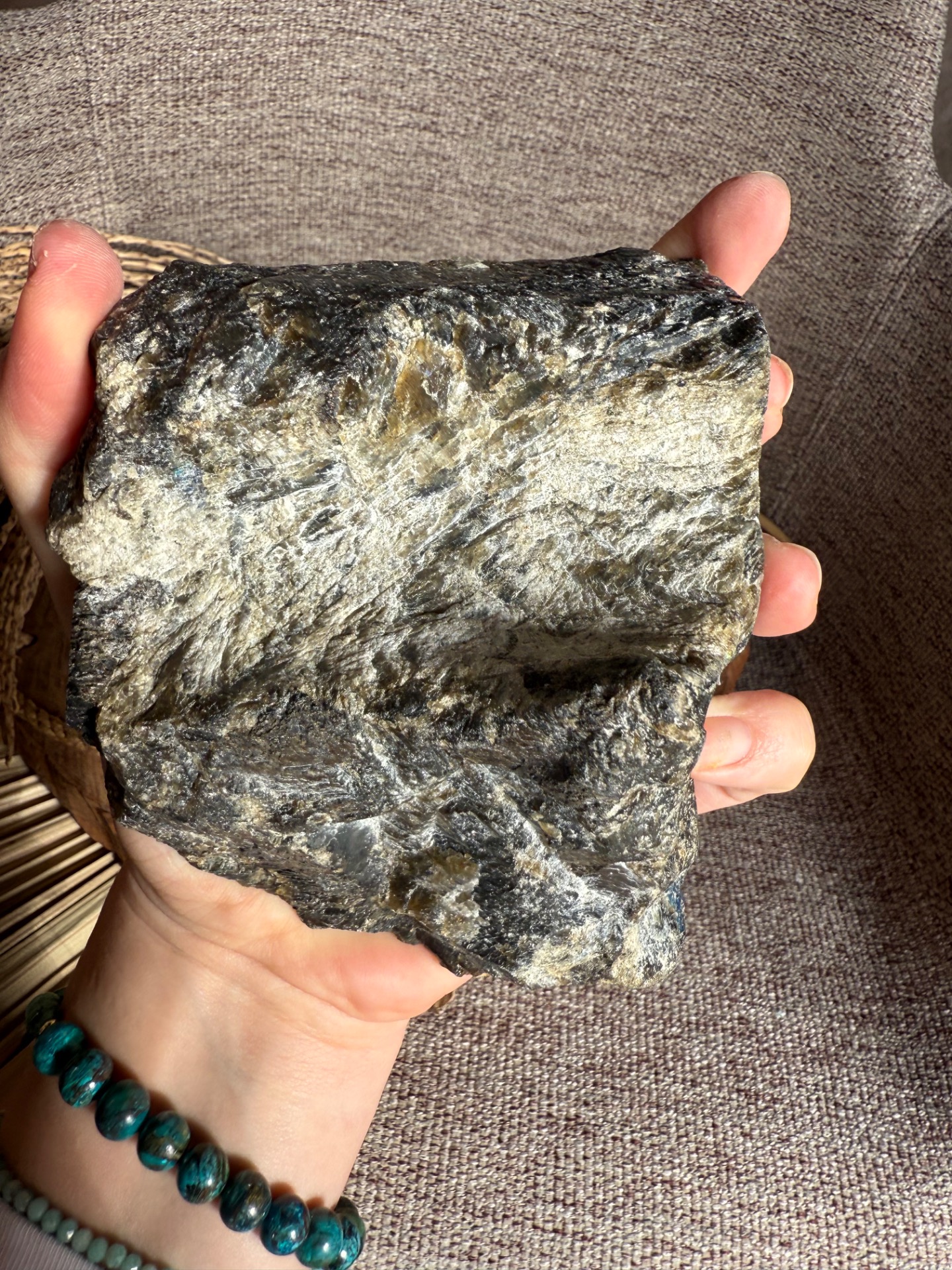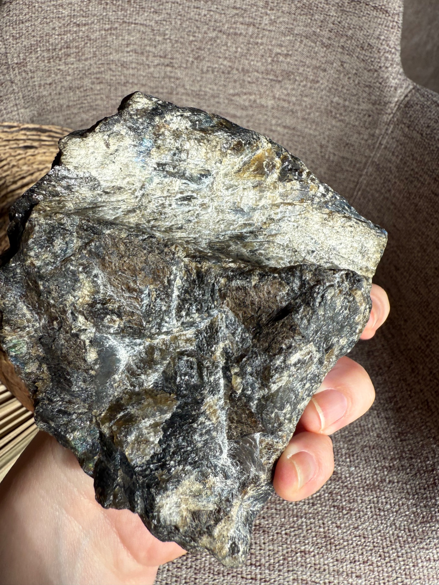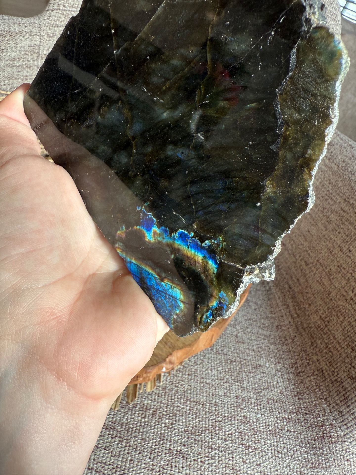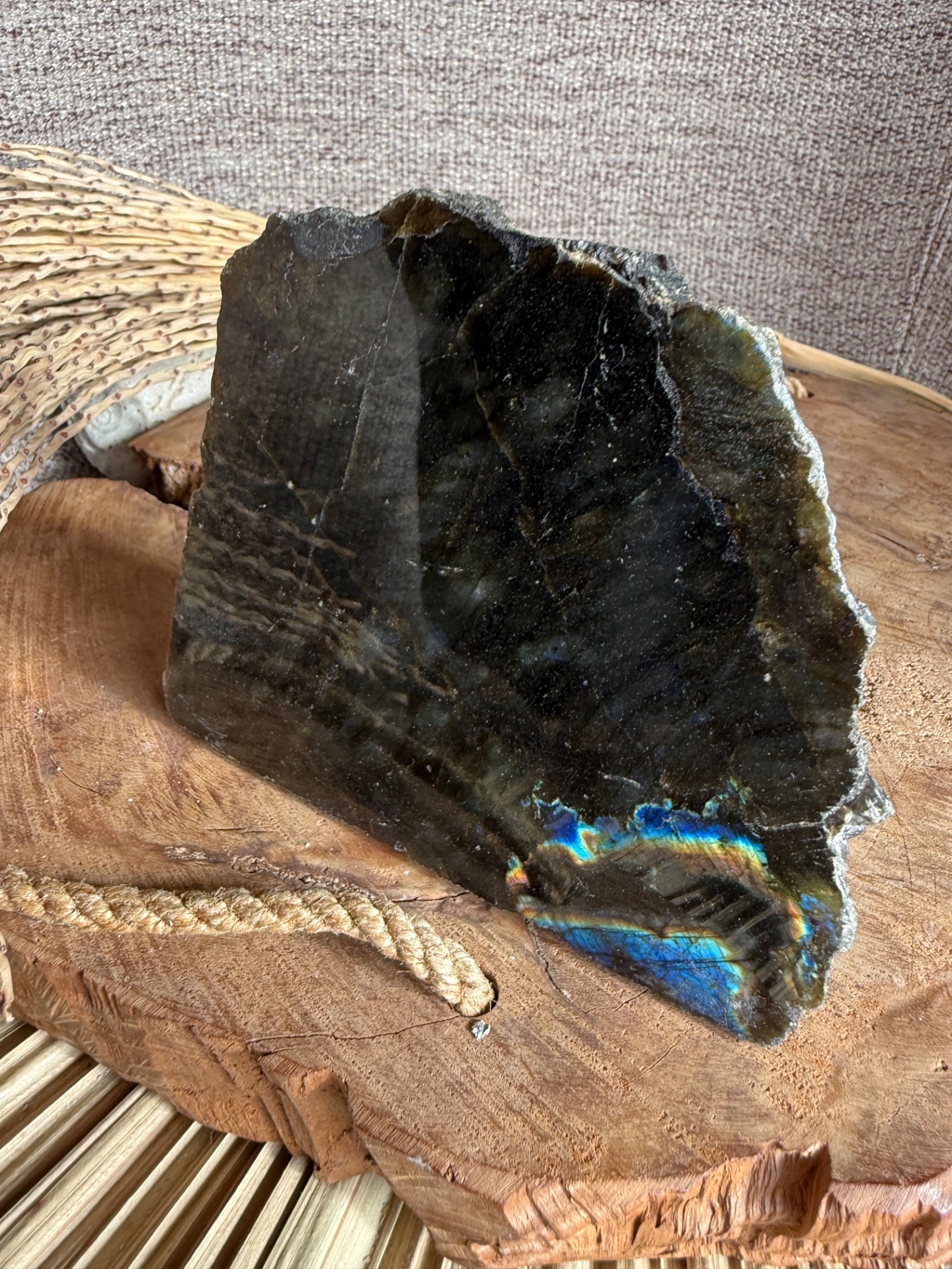 Vizualita a úprava: Jedna strana kameňa je leštená, aby zvýraznila labradorescenciu a farebné odlesky, druhá strana je ponechaná v surovom stave, čo zdôrazňuje jeho prirodzenú krásu a autenticitu. Každý kus je originál – presne tak, ako ho vidíte na fotografiách.