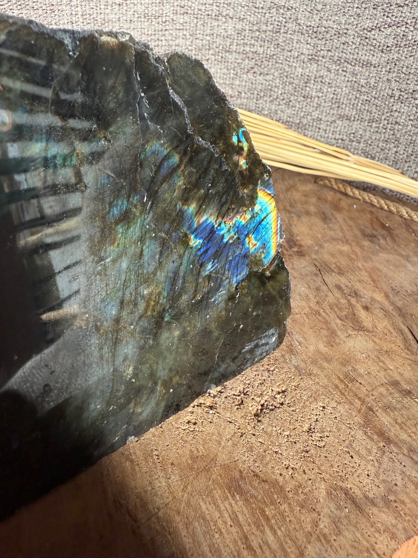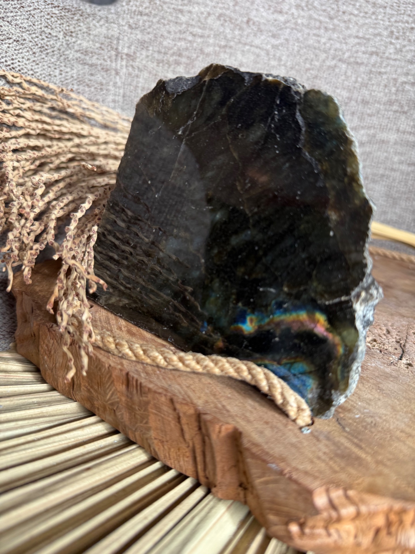 Prineste do svojho života silnú energiu premeny a očisty reality s týmto nádherným labradoritom free form. Tento kus je jedinečný – jedna strana je leštená, aby vynikli jeho nádherné odlesky a farebné hranoly, zatiaľ čo druhá strana je ponechaná v surovom stave, zachovávajúc autentickosť a prirodzenú krásu minerálu.