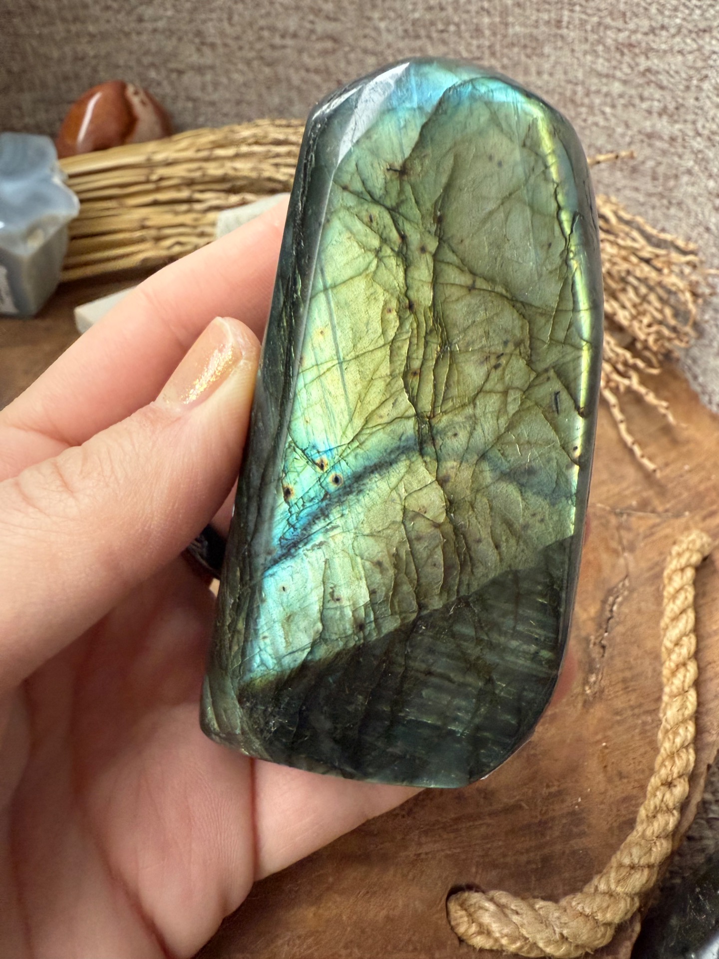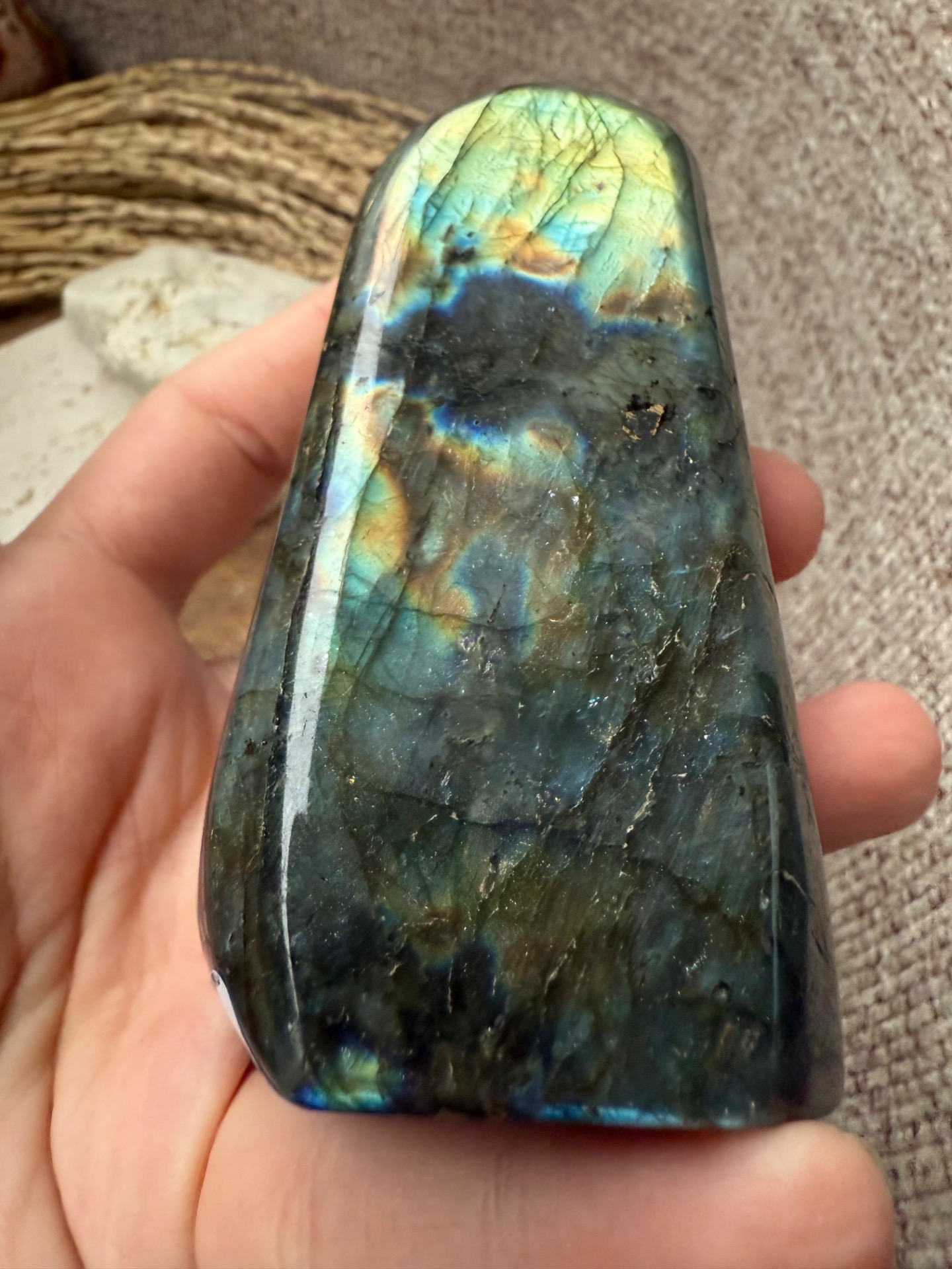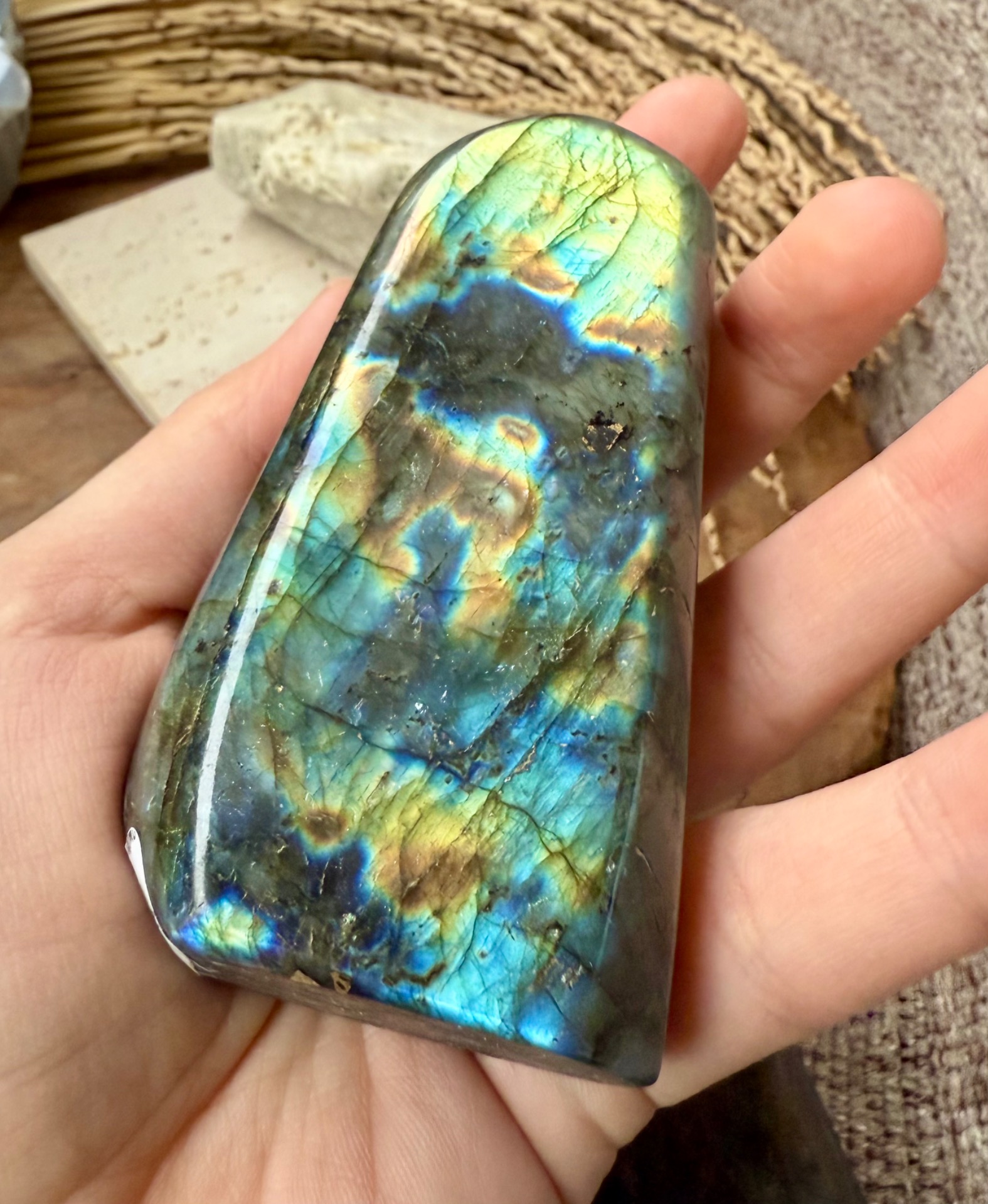 Tento extra dúhový labradorit očarí intenzívnou hrou farieb – od tyrkysovej, modrej a zlatej až po zelené a ohnivé odlesky. Každý pohyb svetla odhaľuje nový rozmer jeho mystickej krásy.