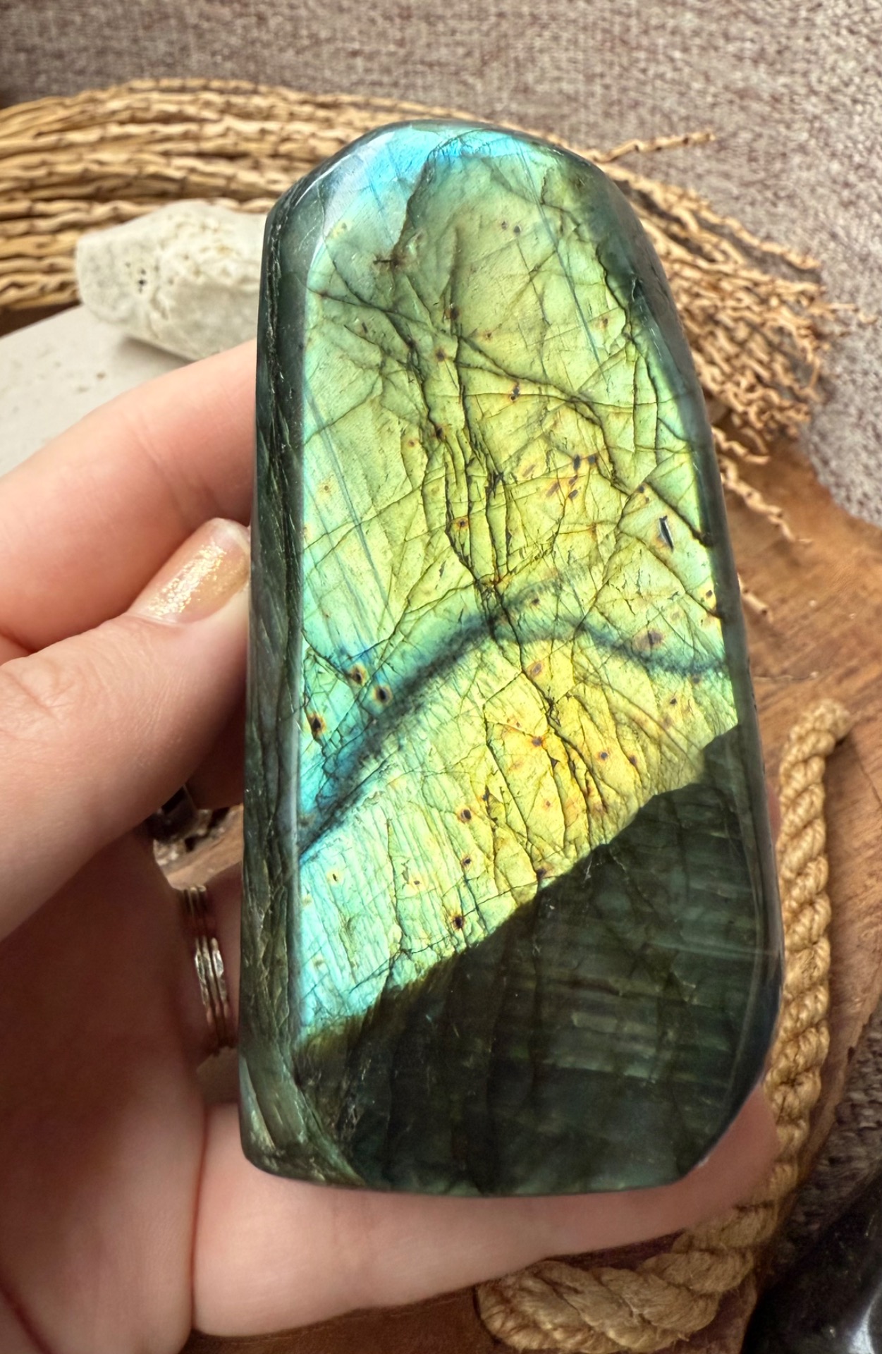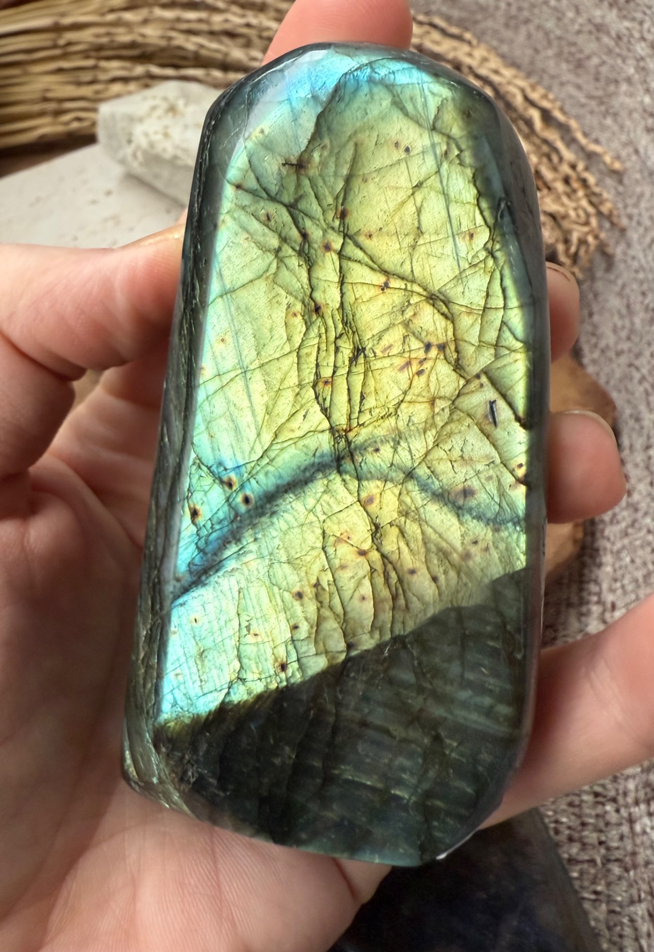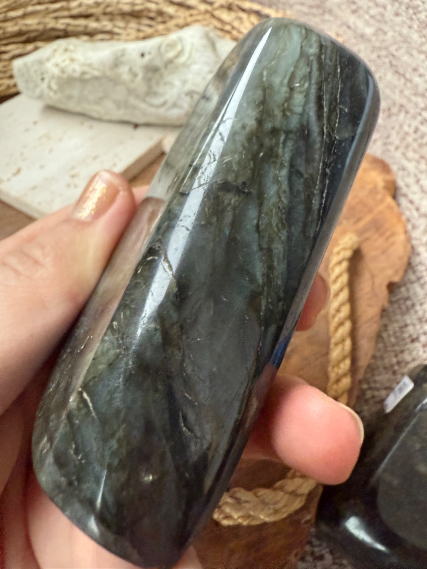 Tento extra dúhový labradorit očarí intenzívnou hrou farieb – od tyrkysovej, modrej a zlatej až po zelené a ohnivé odlesky. Každý pohyb svetla odhaľuje nový rozmer jeho mystickej krásy.
