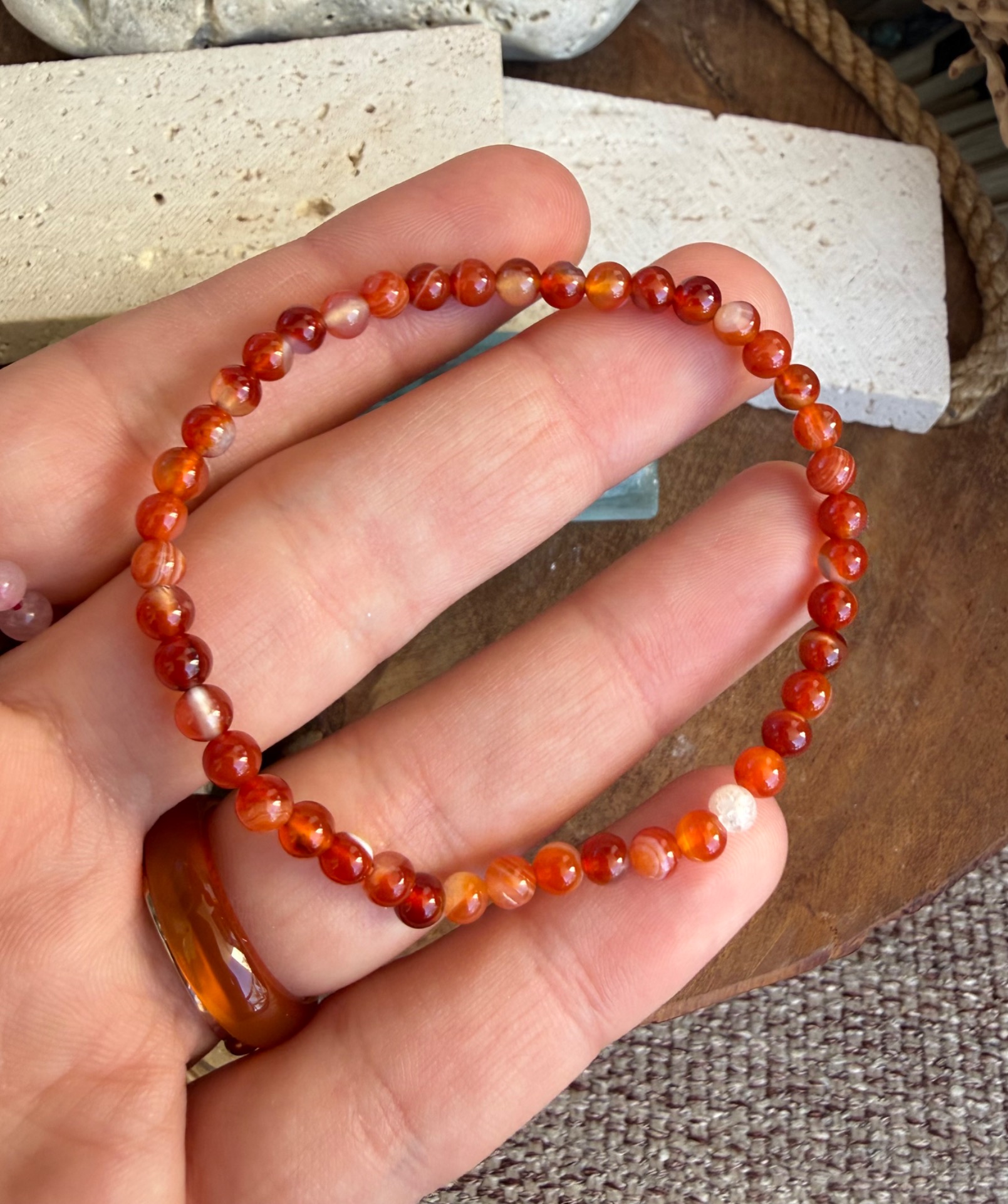 Tento jemný náramok z prírodného karneolu je minimalistický šperk z drobných 4 mm korálok v teplých oranžových až oranžovo-červených tónoch. Pôsobí živo, slnečne a energicky – ako malý zdroj každodennej motivácie a pohybu.