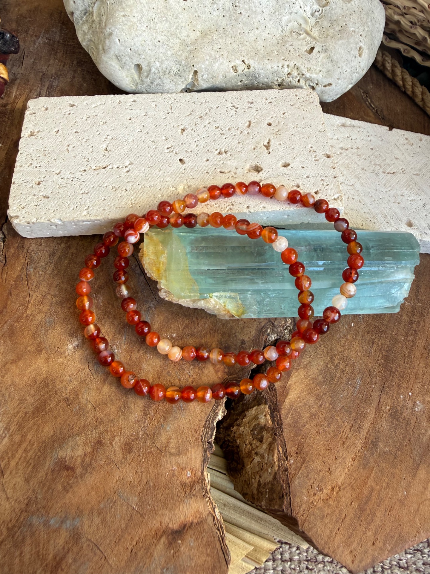 Karneol je odroda chalcedónu, ktorá vzniká v horninách postupným ukladaním kremičitanov. Jeho teplé oranžové sfarbenie je spôsobené prirodzenými oxidmi železa, ktoré mu dodávajú typickú žiarivú energiu.