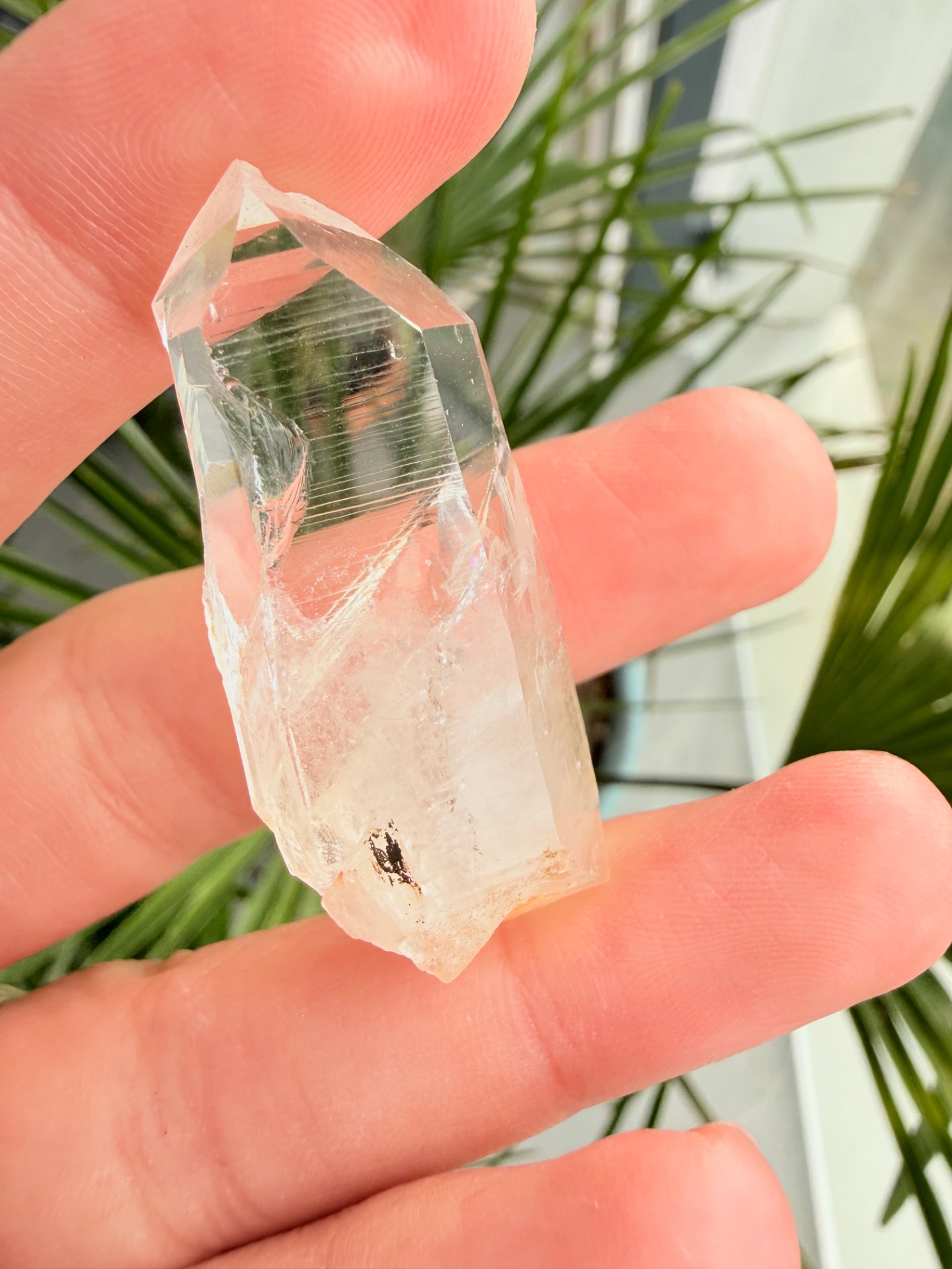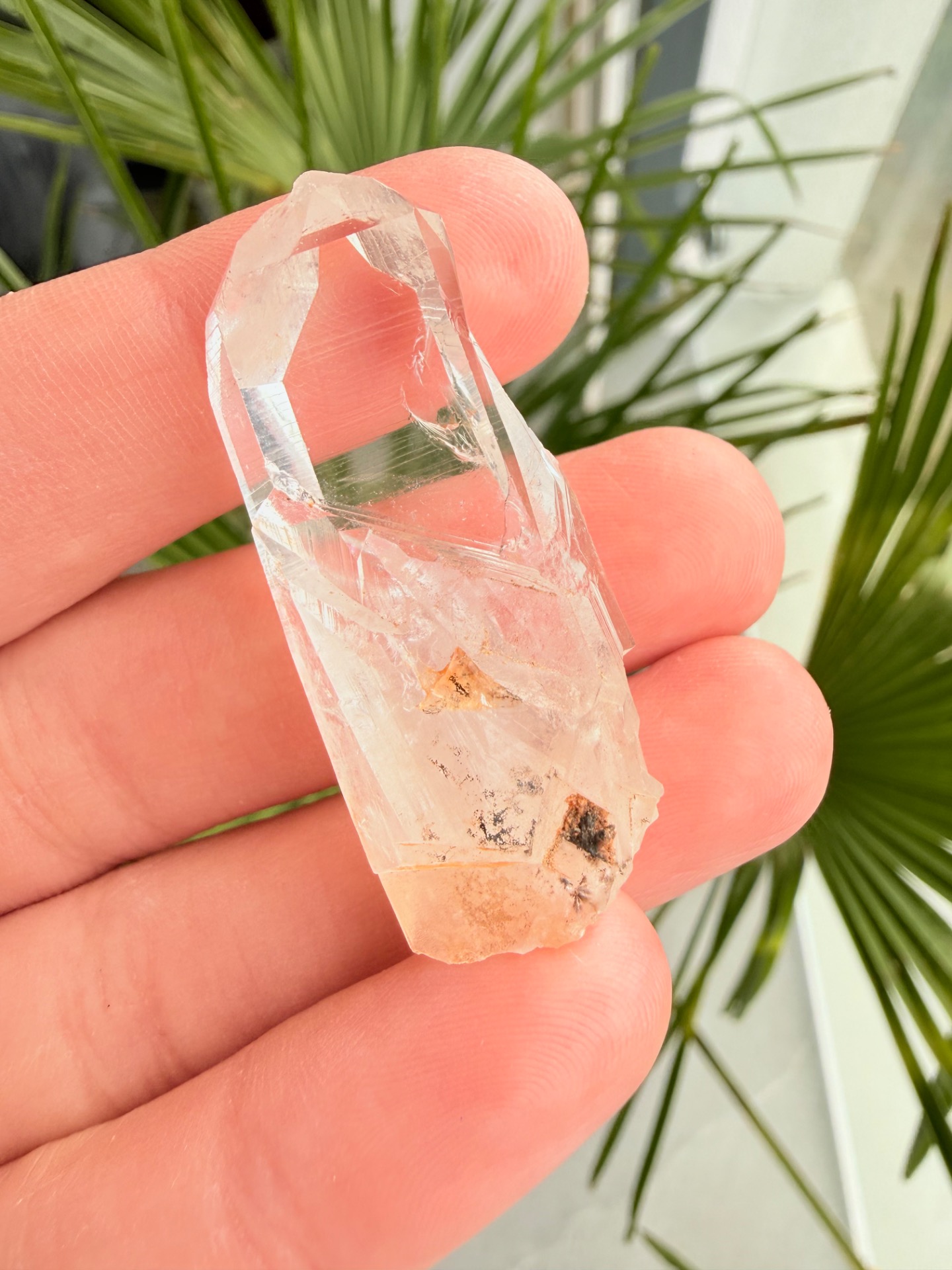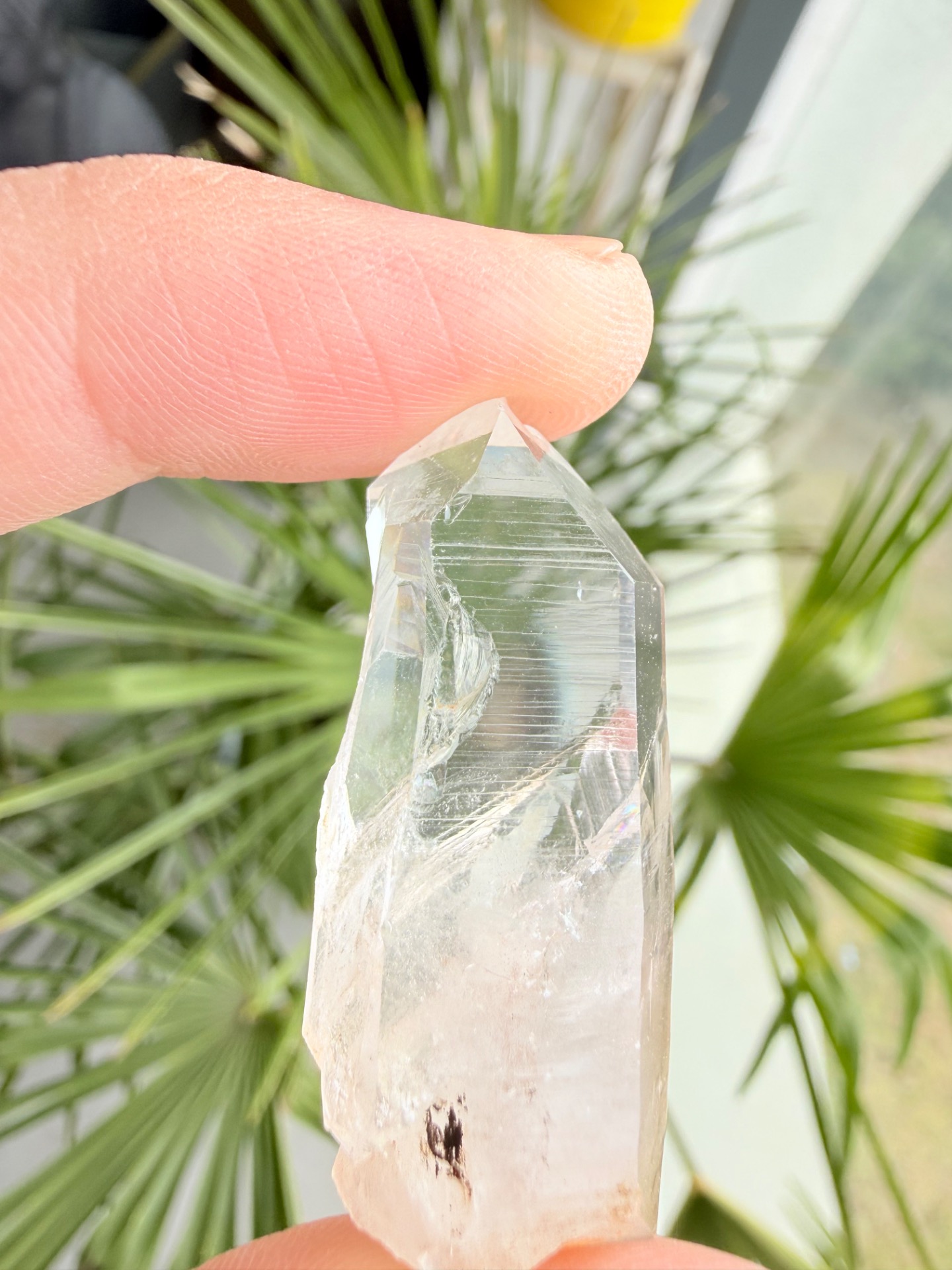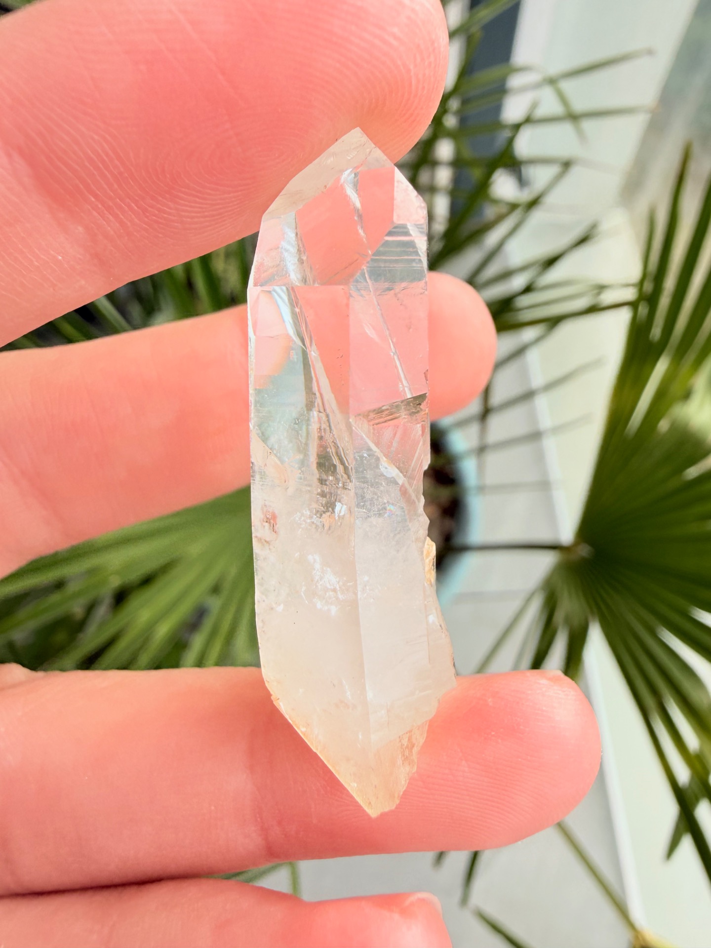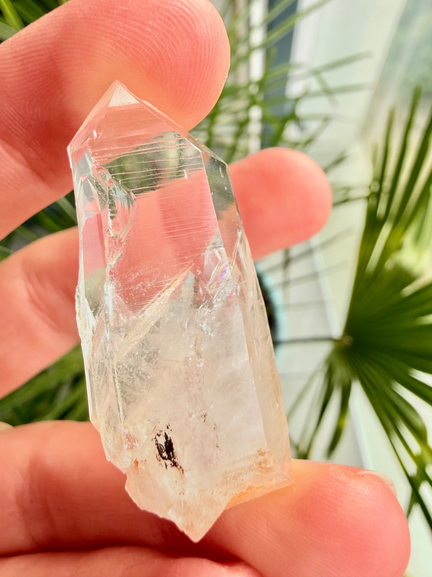 Tento výnimočný lemurský krištálik, známy aj ako Lemurian Seed Quartz, je nádherným príkladom prírodného majstrovstva. Jeho typickým znakom sú jemné horizontálne ryhy (tzv. "lemurské kódy") na povrchu kryštálu, ktoré mu dodávajú jedinečný vzhľad aj hlboký symbolický význam.