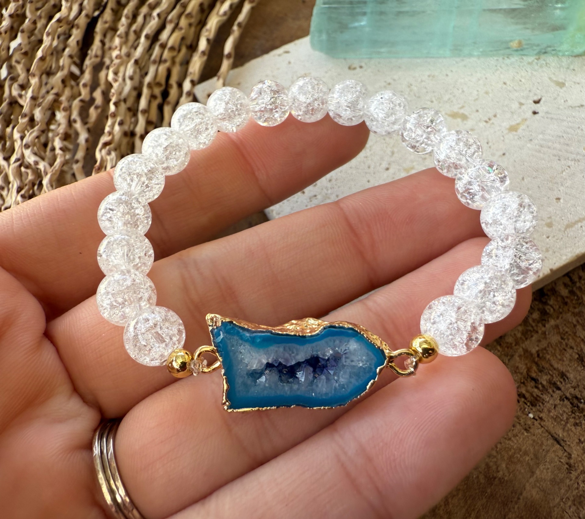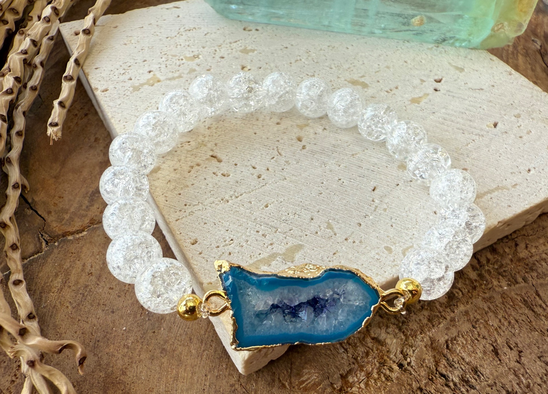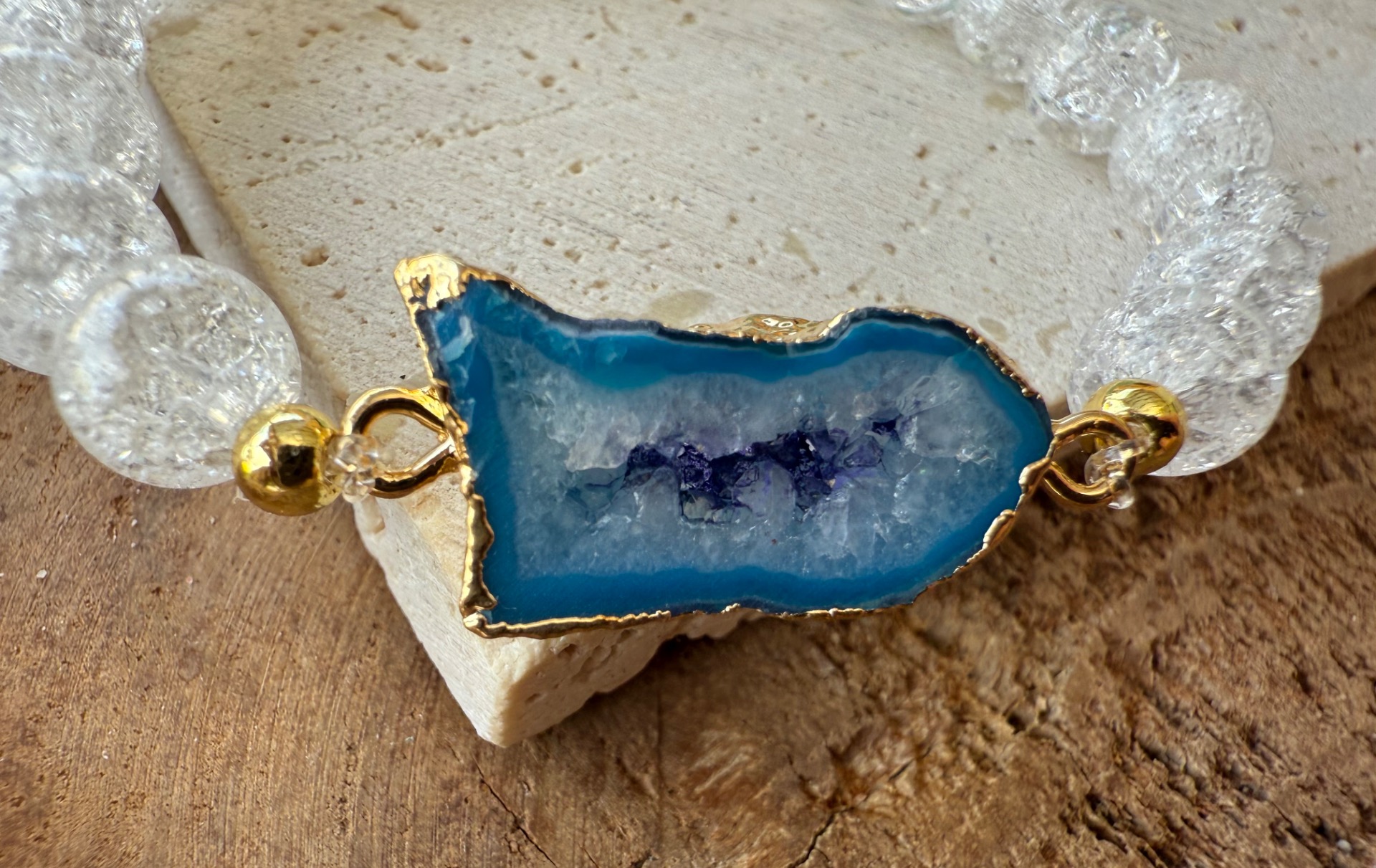 Objavte eleganciu v jej prirodzenej podobe. Tento náramok je ručne vyrobený z praskaného bieleho krištáľu (8 mm), doplnený o nádhernú modrú achátovú drúzu vsadenú do zlatého okova. Kombinácia jemného krištáľového lesku a intenzívnej modrej farby pôsobí luxusne, no zároveň veľmi žensky a jemne.