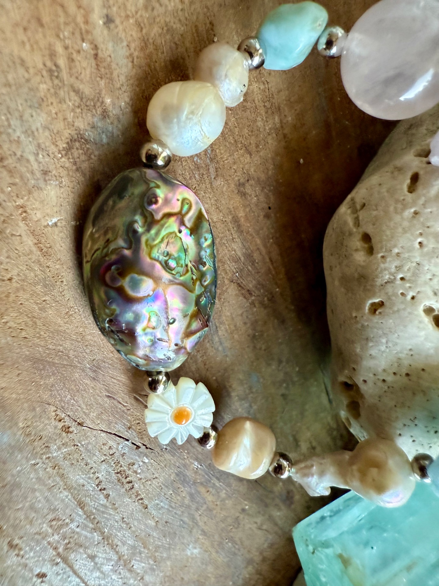 Materiály: mix surových minerálov, paua mušľa, baroková perla, perleť, mušľovina
