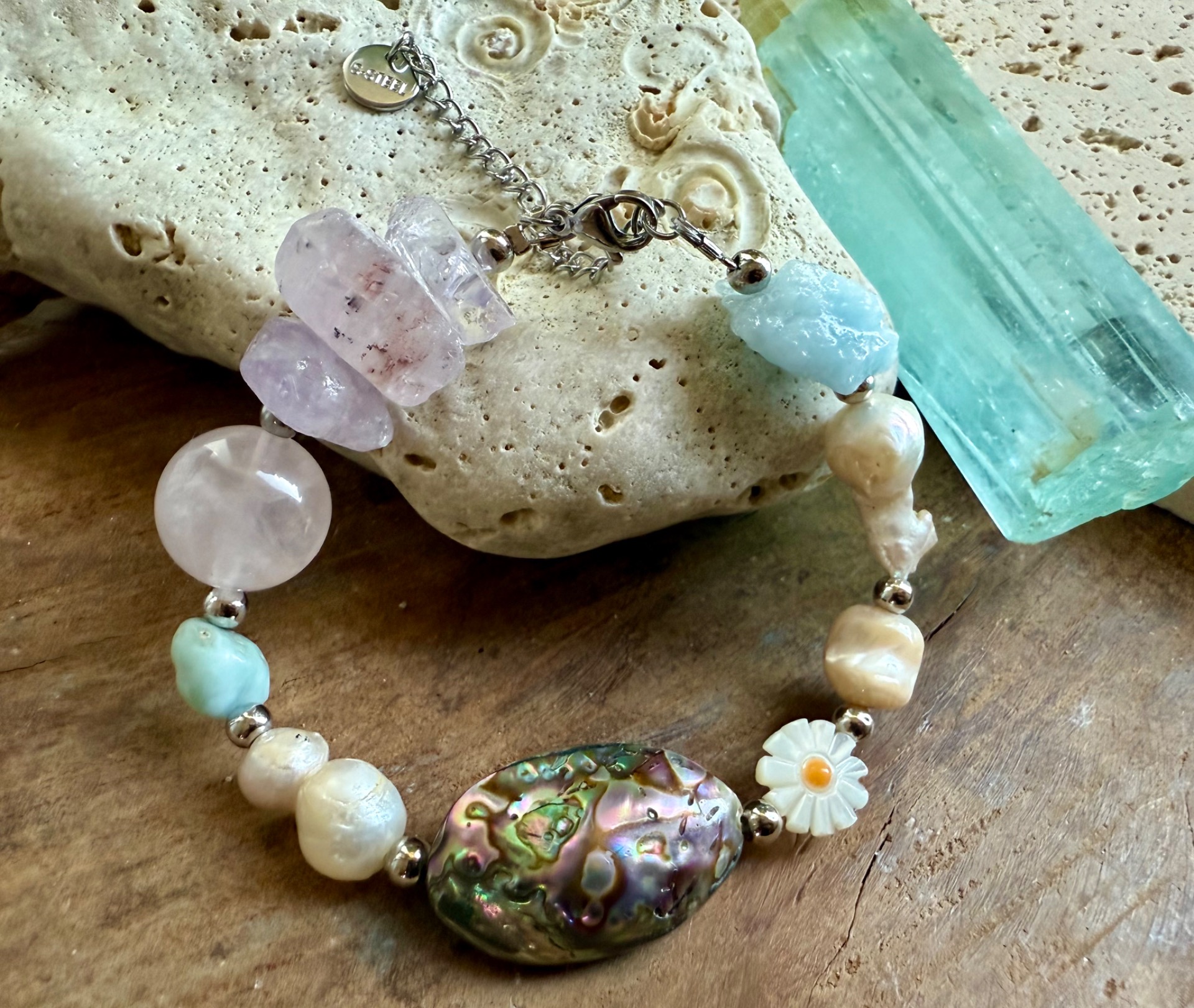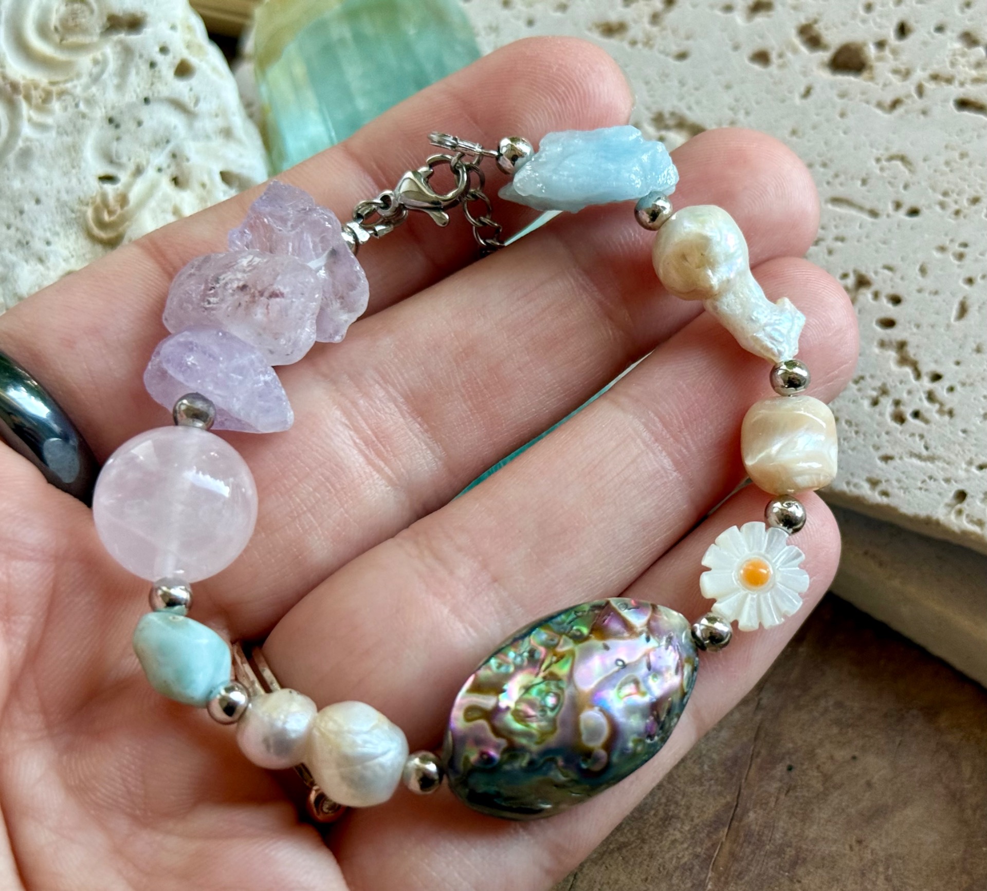 Medzi nimi sa striedajú larimar, ruženín, surový ametyst, surový akvamarín, perleť a mušľovina v tvare kvetu – nežné kamene v prírodných tvaroch, ktoré spolu vytvárajú harmonický, intuitívny rytmus.