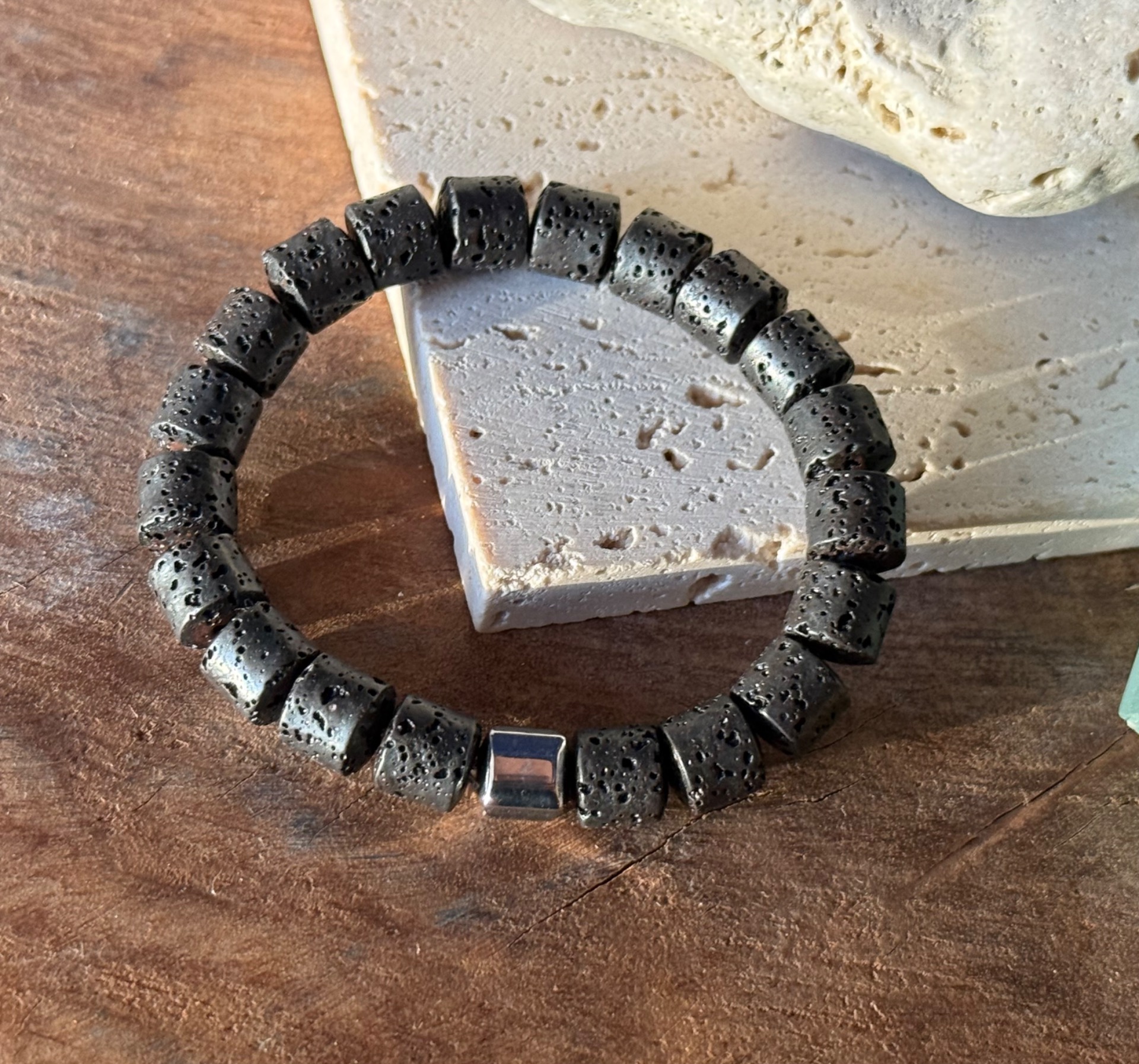 Minimalistický, zemitý náramok s hlbokou, upokojujúcou energiou je vytvorený z lávového kameňa v tvare valčekov, doplnený jedným ochranným prvkom z hematitu. Tento náramok pôsobí ako tichý oporný bod v každodennom zhone – prináša vnútorný pokoj, stabilitu a pocit bezpečia.