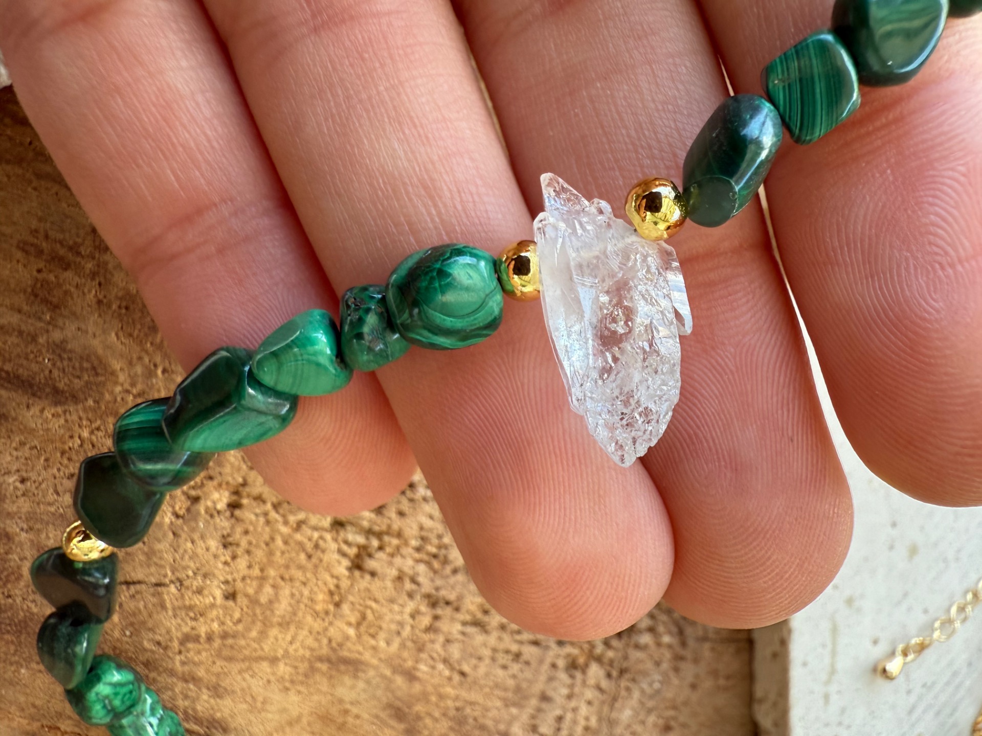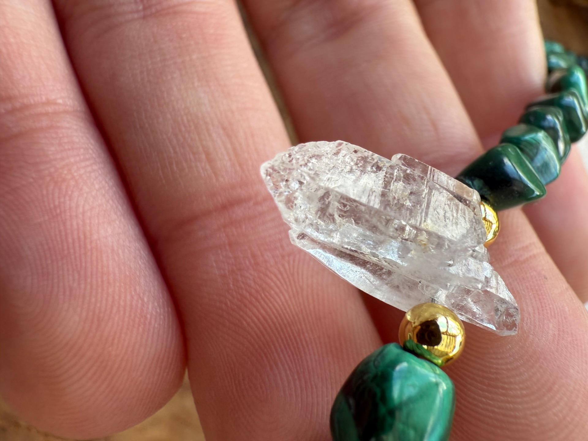 Minerály: prírodný malachit (nepravidelné nugety) • lemurský krištáľ