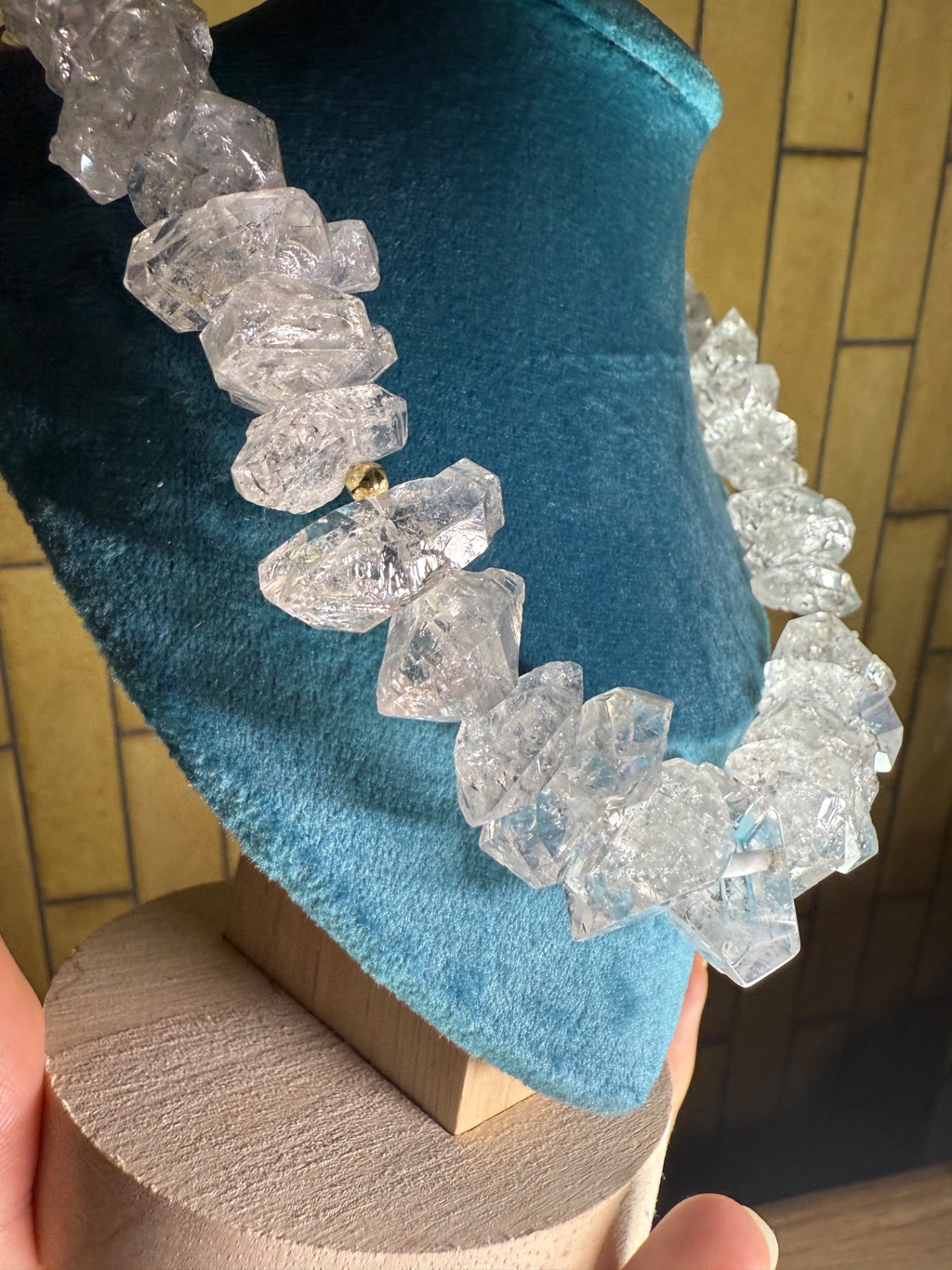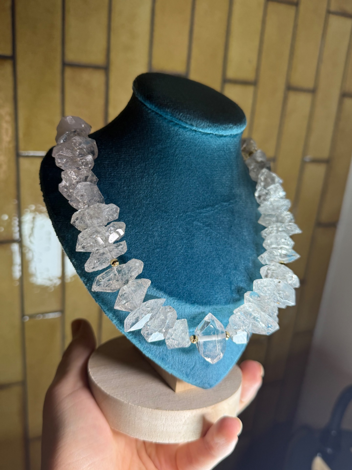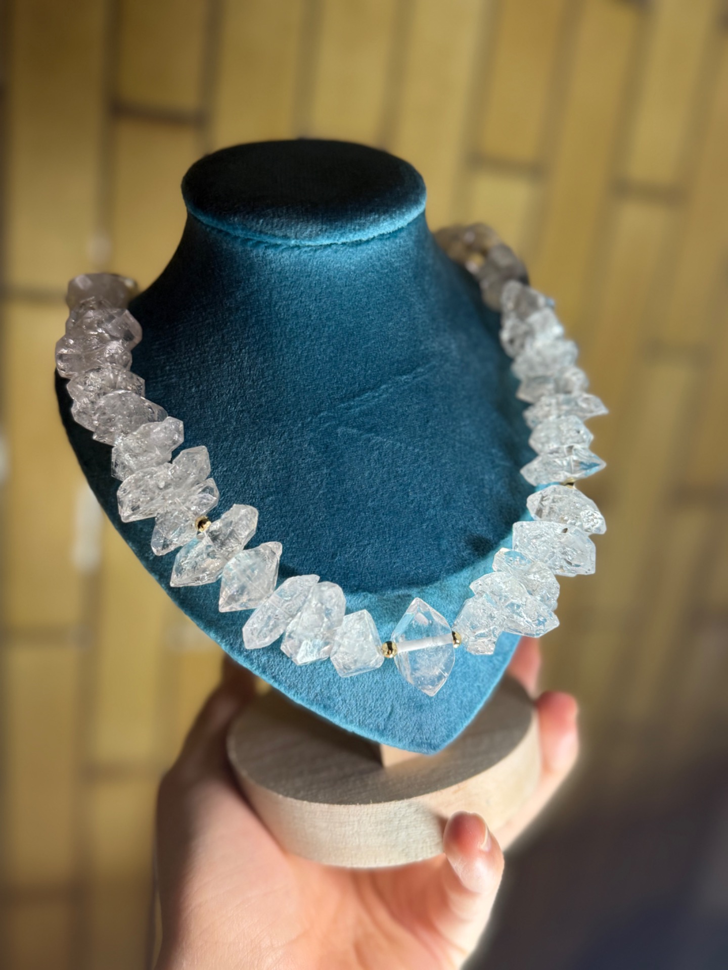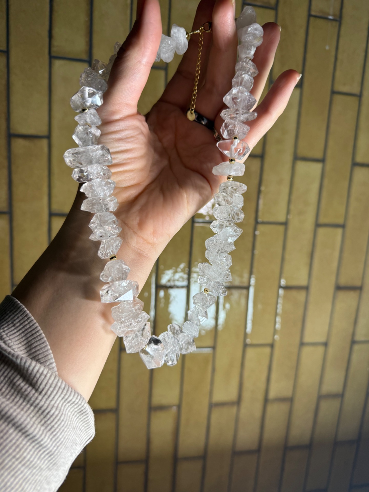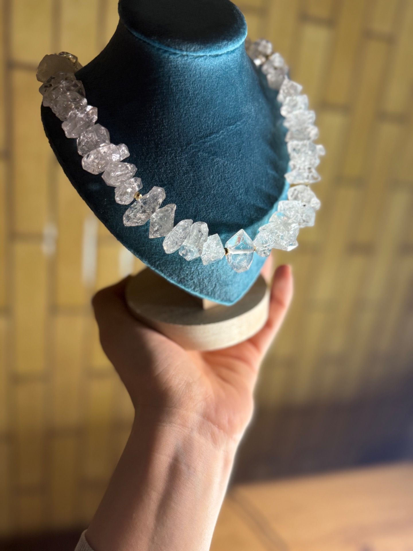 Masívny, surový a zároveň výnimočne čistý. Tento statement náhrdelník je oslavou svetla v jeho najčistejšej podobe. Ručne vytvorený šperk z pravých herkimer diamantov s veľkosťou približne 1,5 – 3 cm kombinuje autentickú silu prírody s jemnou eleganciou zlatého ladenia. Každý kryštál bol starostlivo vybraný tak, aby spolu vytvárali harmonický, no výrazný celok, ktorý pôsobí prirodzene, luxusne a nadčasovo.