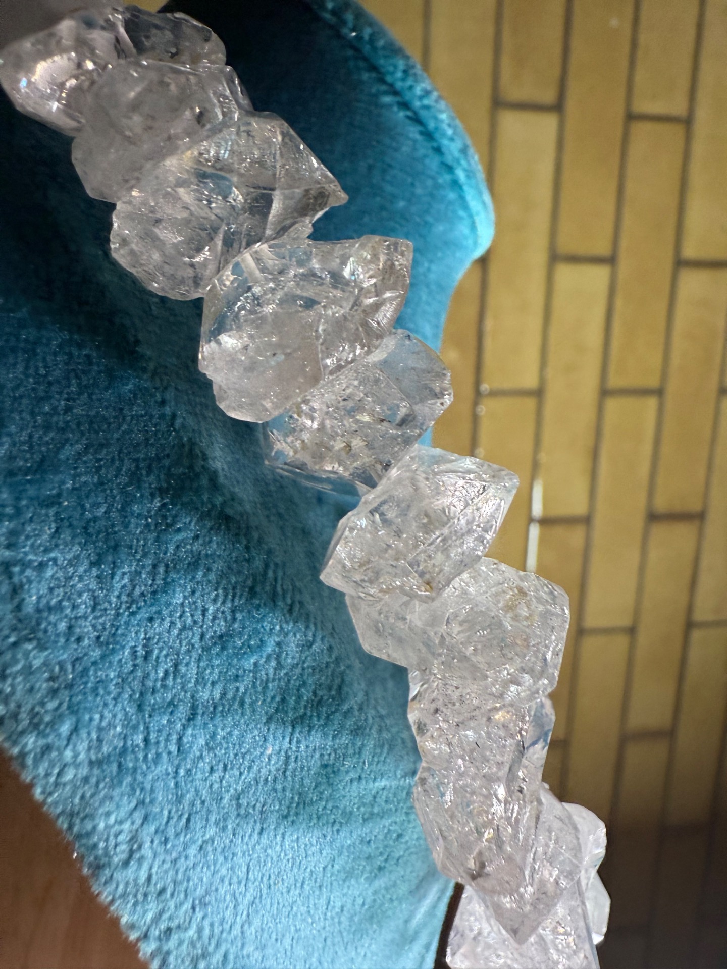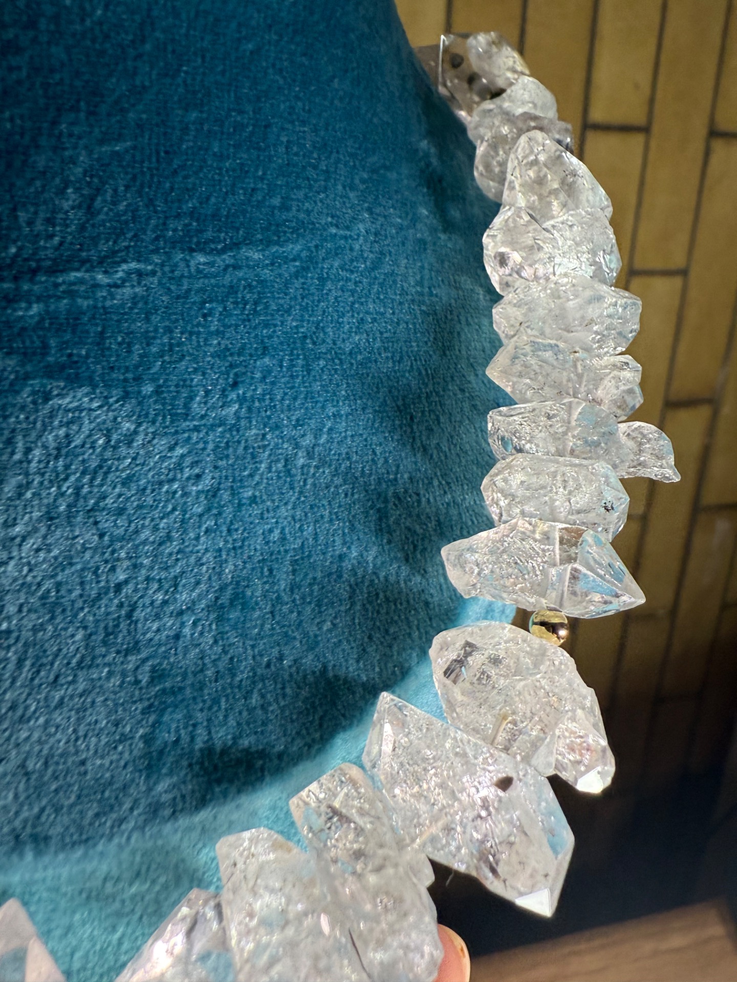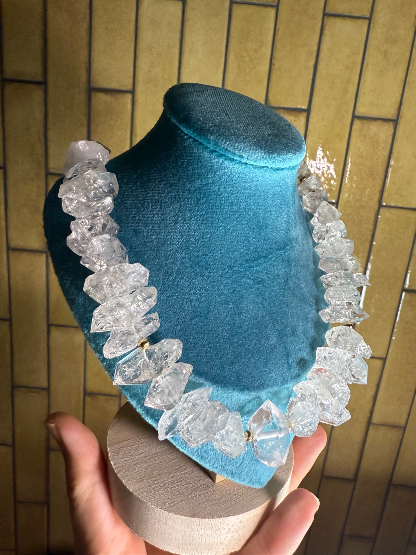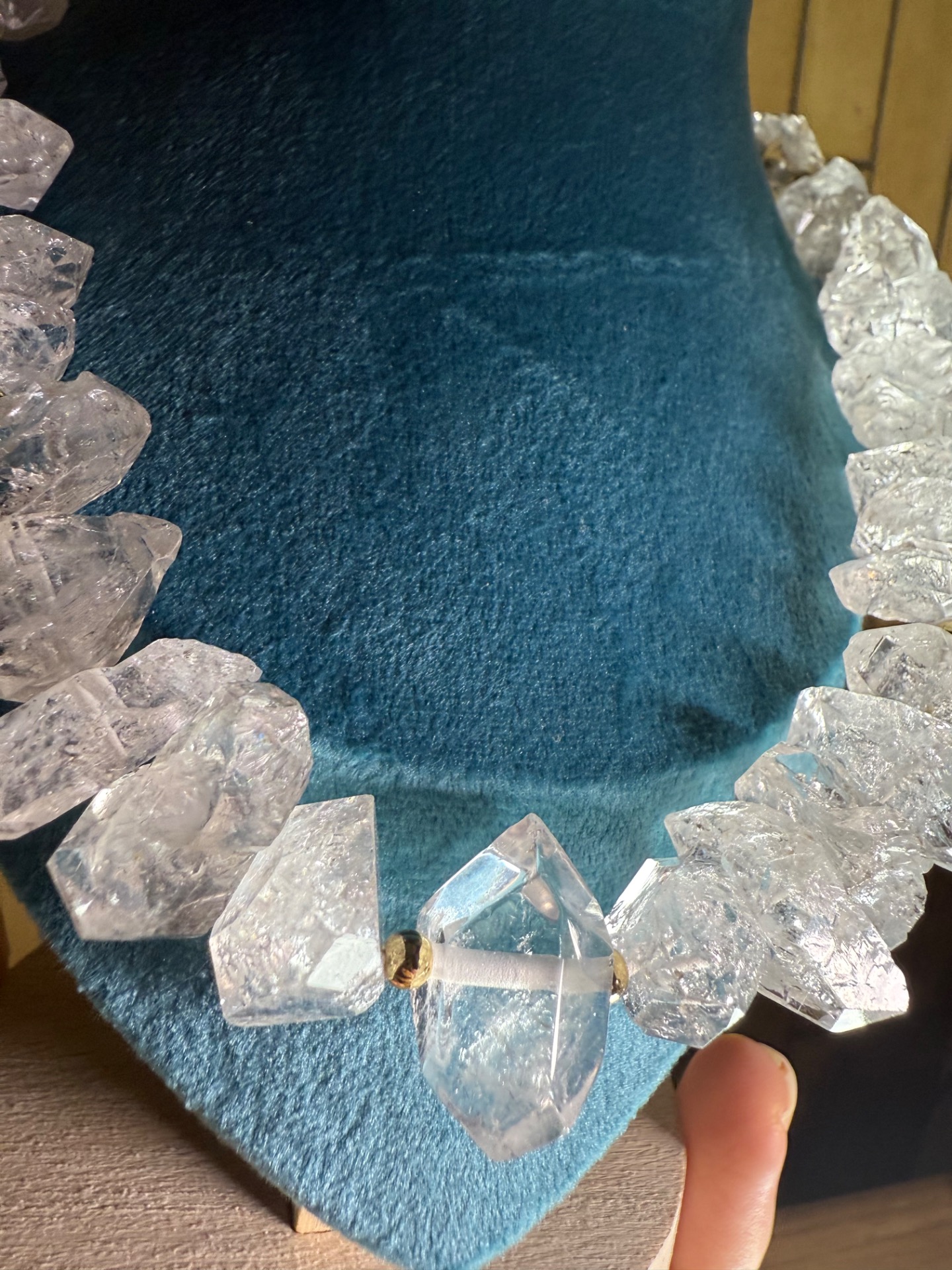 V centre náhrdelníka sa nachádza obojstranný, prirodzene formovaný kryštál, ktorý je výnimočný svojou čírosťou a silnou energiou. Obklopujú ho surové herkimer diamanty, ktoré si zachovali svoju autentickú štruktúru, prirodzený lesk aj charakteristické vnútorné inklúzie. Práve tieto drobné detaily robia každý kus originálnym a neopakovateľným.