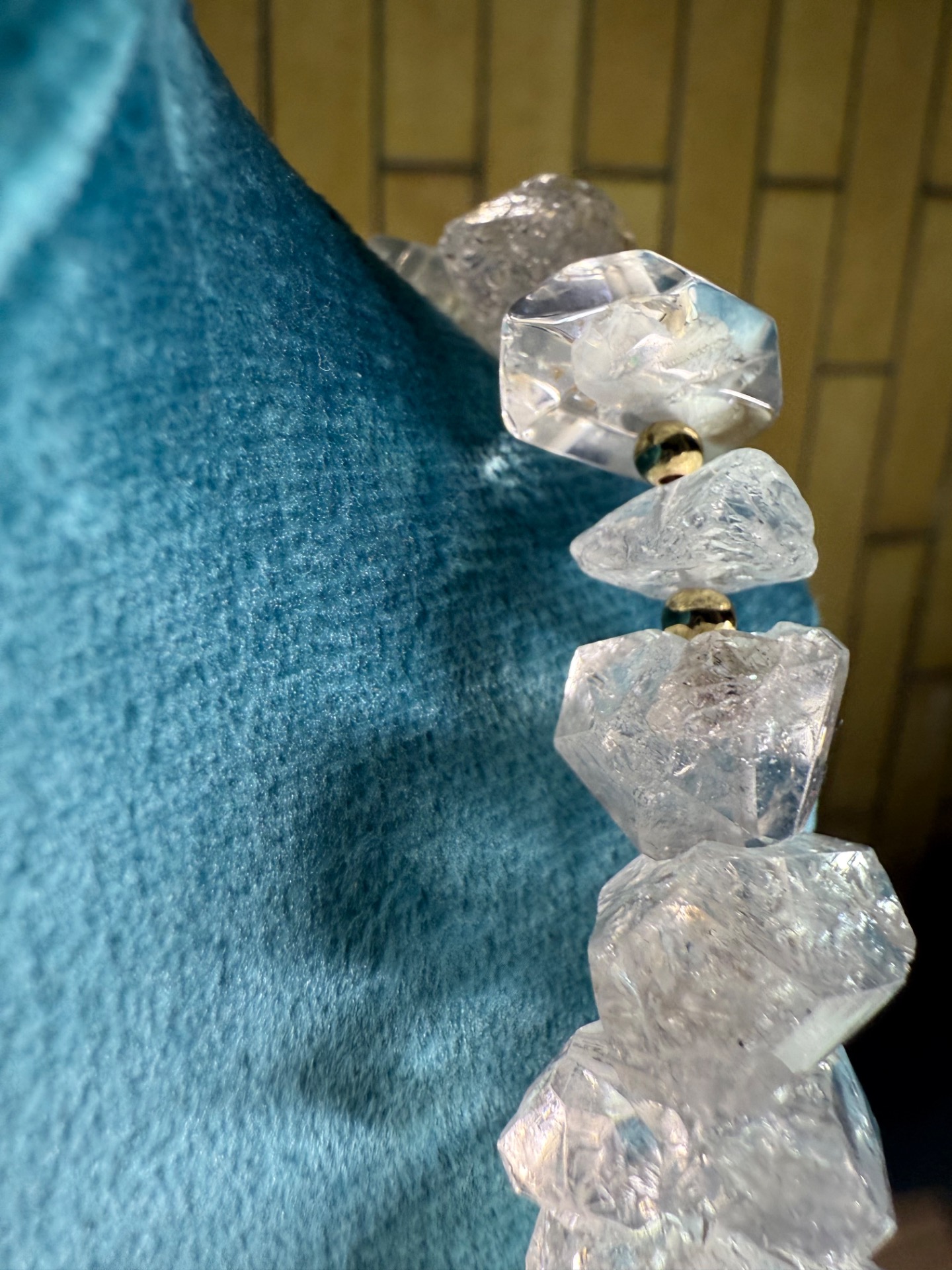 Náhrdelník má dĺžku 46 cm, je vyhotovený ručne z prírodných herkimer diamantov a doplnený o nerezové komponenty v zlatom odtieni vrátane zapínania.