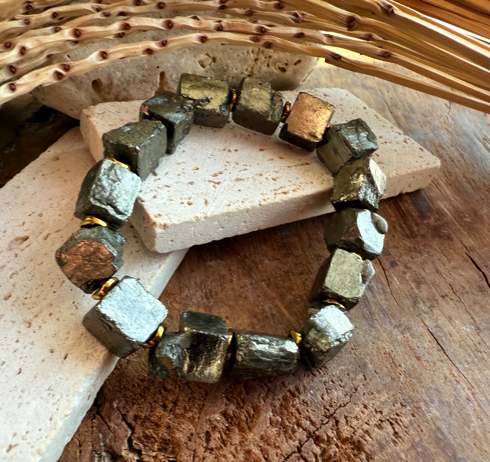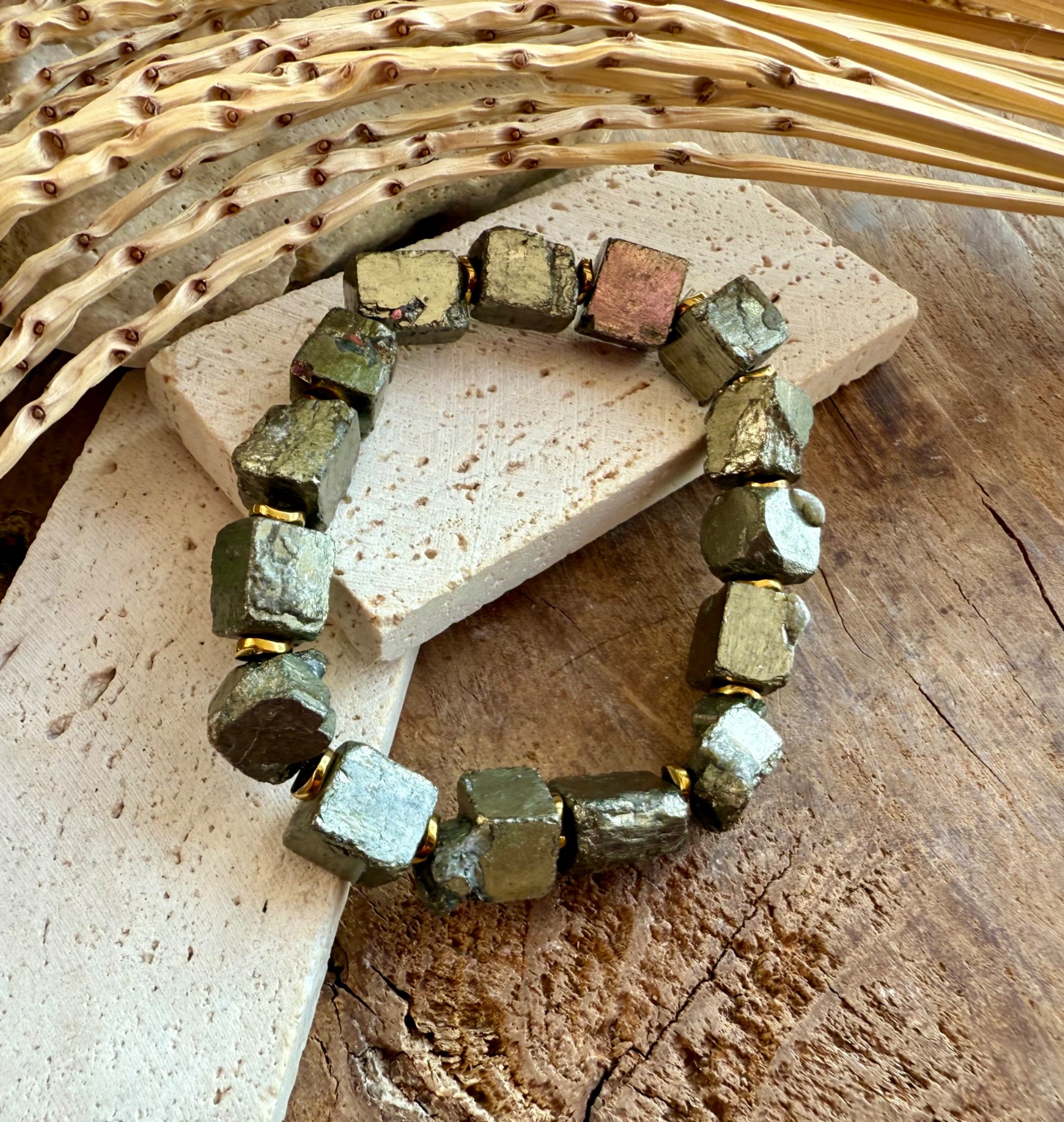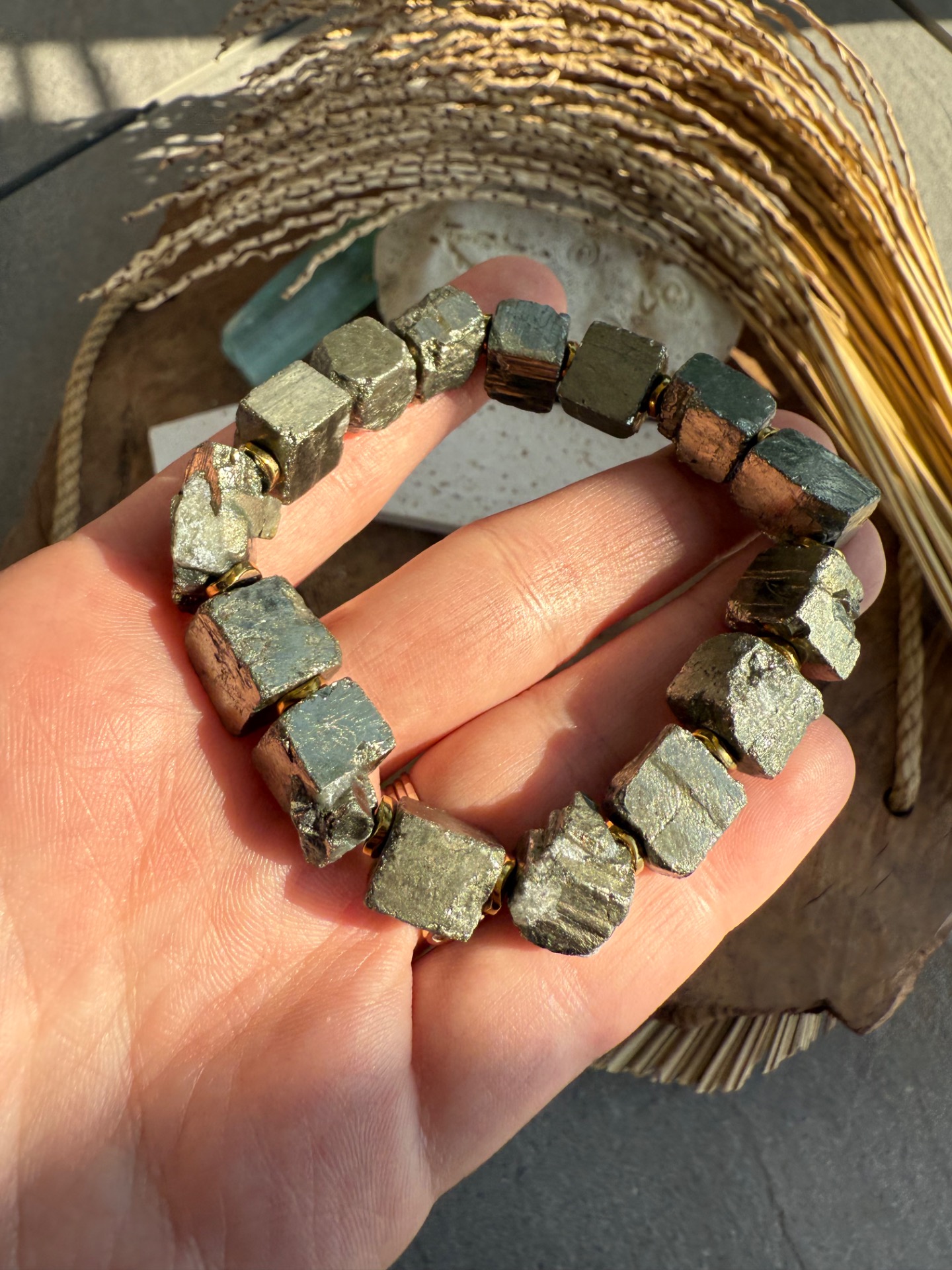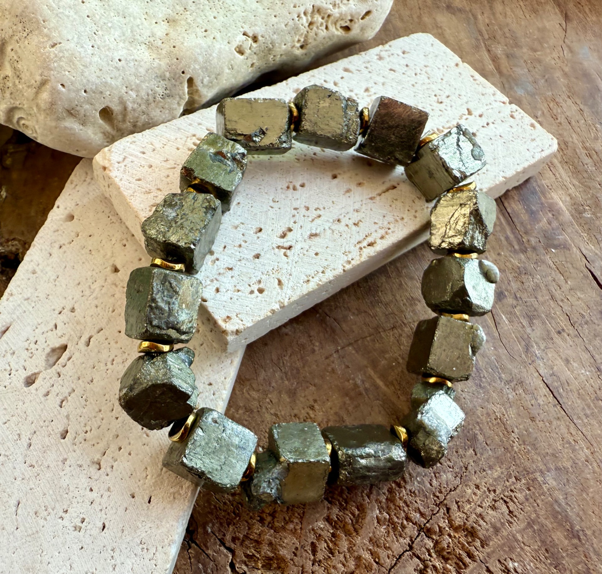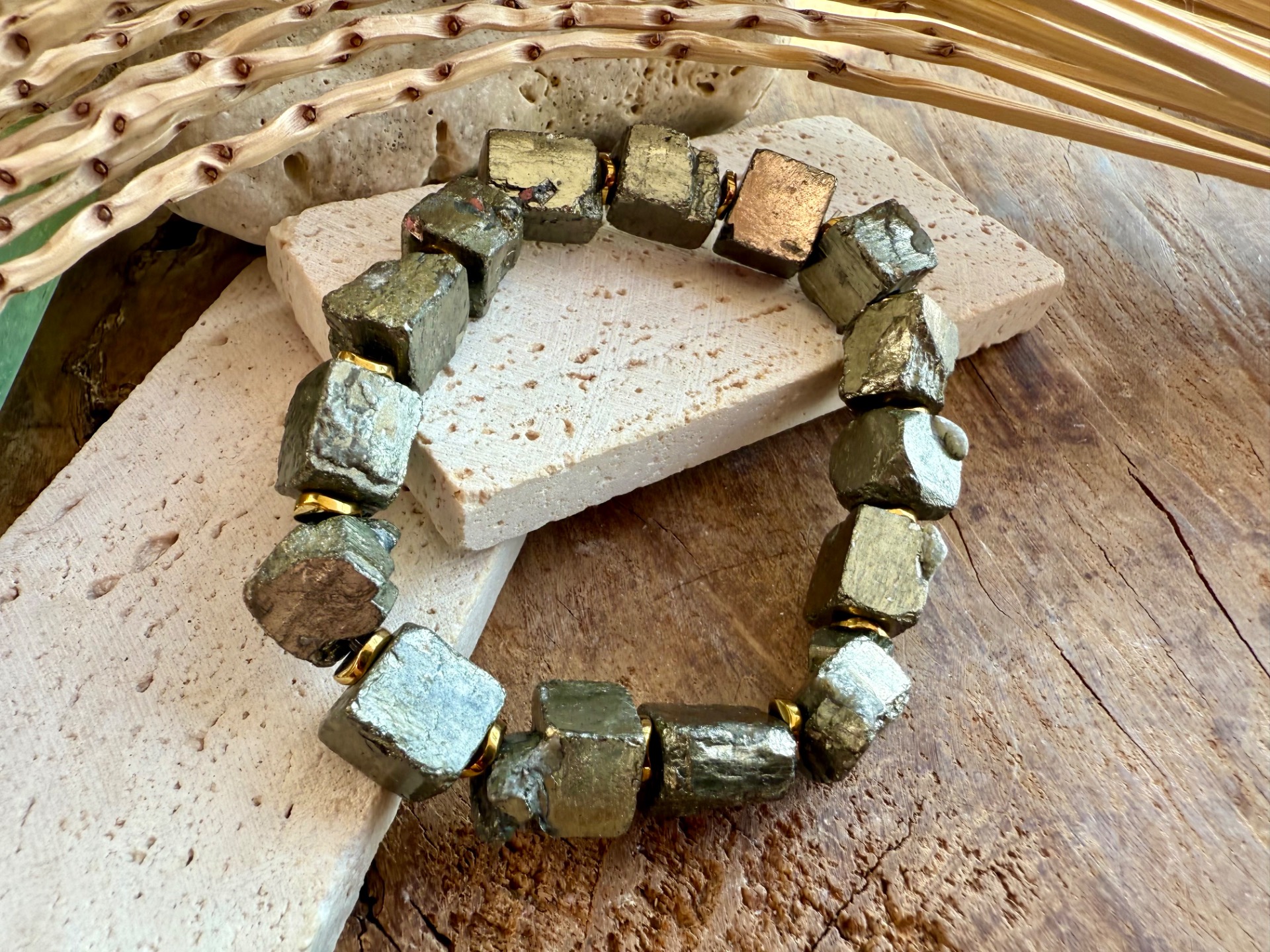 Masívny náramok z prírodného pyritu vytvorený z autentických surových kociek, ktoré si zachovali svoj prirodzený kryštálový tvar. Pyrit je známy svojím charakteristickým kovovým leskom v odtieňoch zlata a bronzu, vďaka ktorému pôsobí šperk výrazne, luxusne a zároveň veľmi prírodne.
