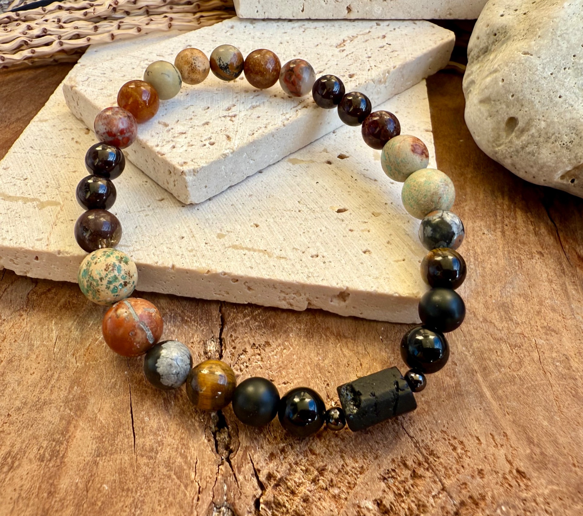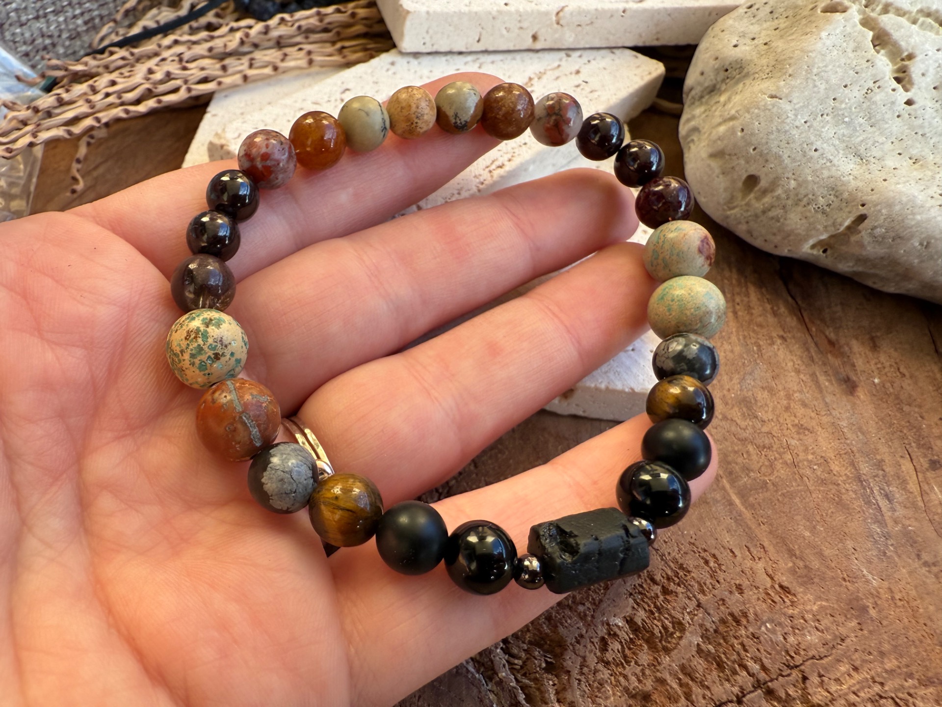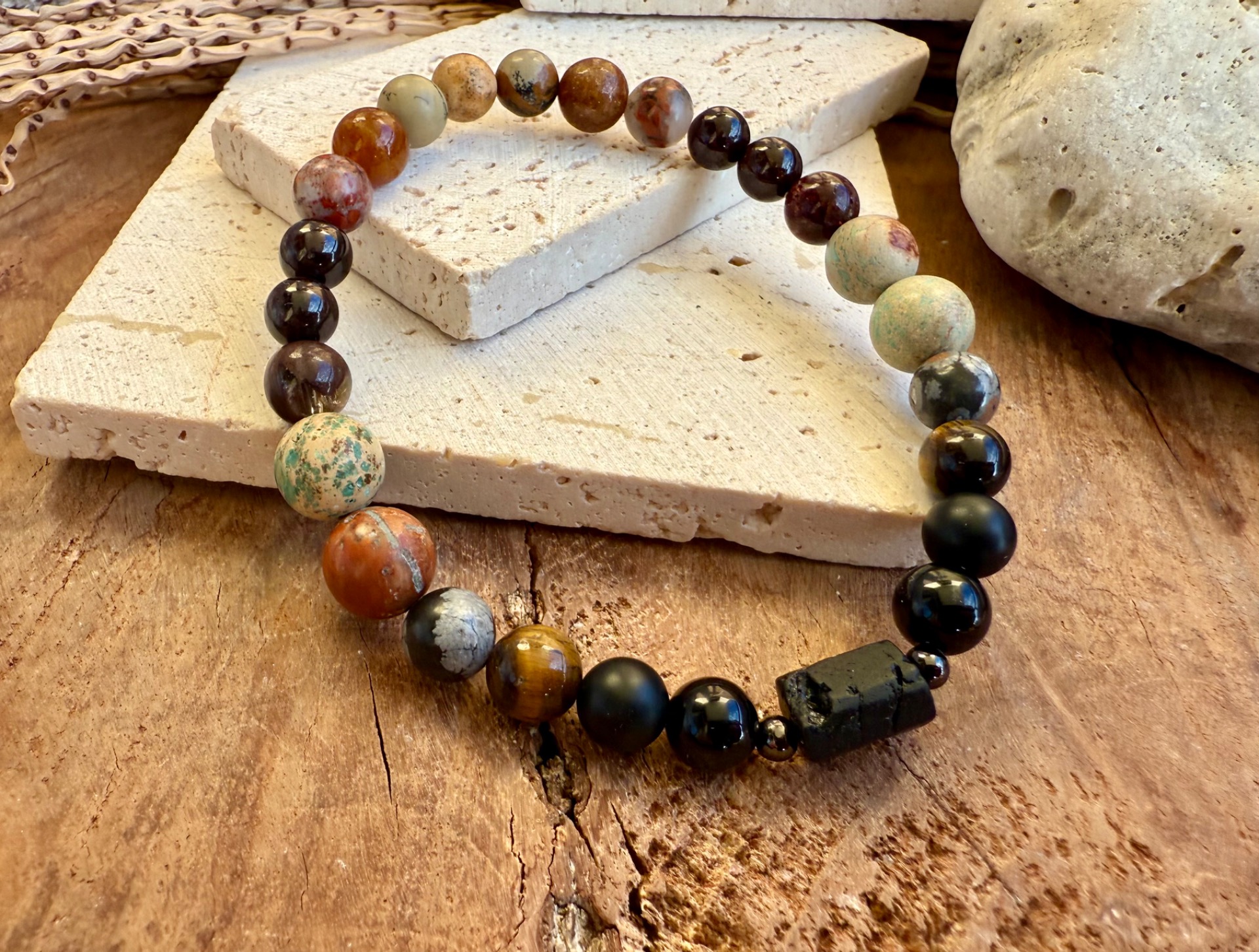 Silný pánsky náramok vytvorený z kombinácie surového turmalínu, granátu, jaspisu, achátu a obsidiánu. Každý kameň má inú veľkosť a charakter, čo dodáva náramku prirodzený, autentický vzhľad a výraznú energiu.