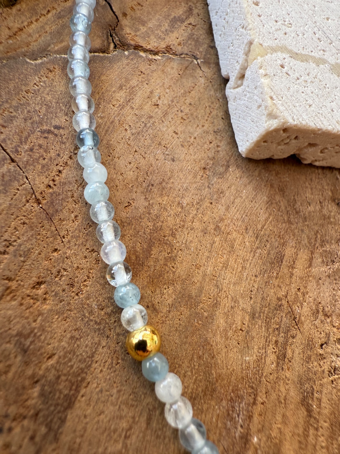 Matné korálky ruženínu zjemňuje svetlomodrý akvamarín, ktorý vnáša do šperku čistotu a pokoj – ako ranné nebo odrážajúce sa na hladine vody.