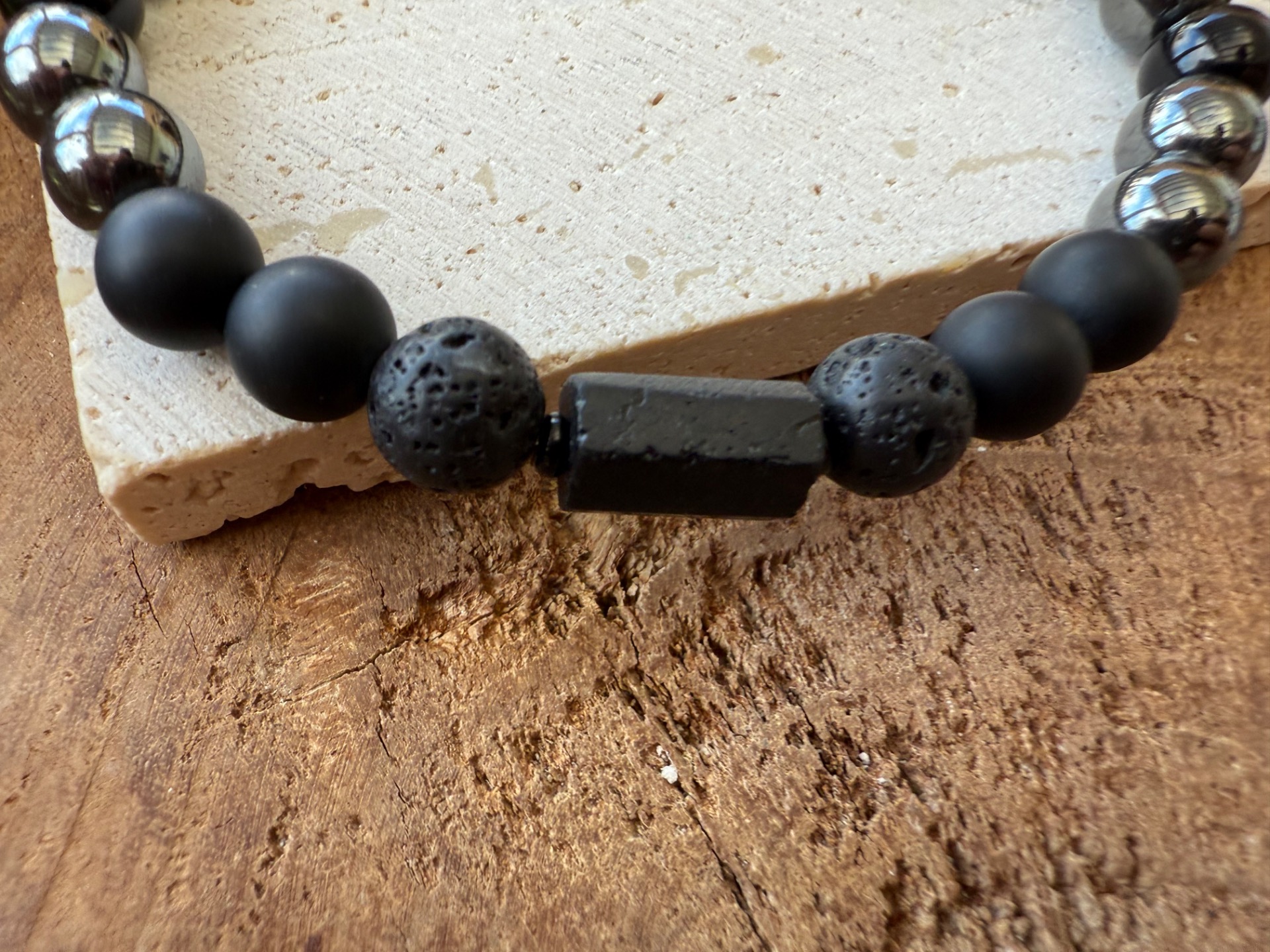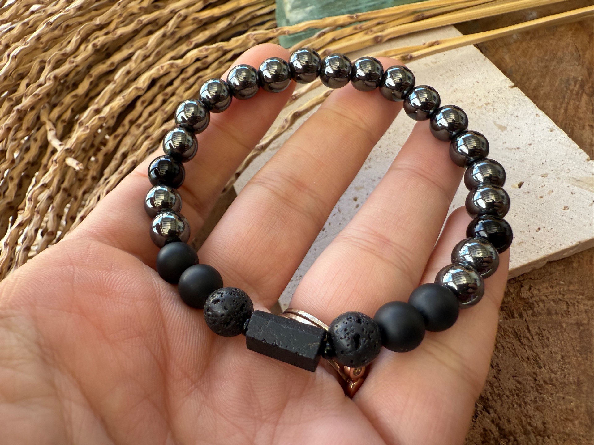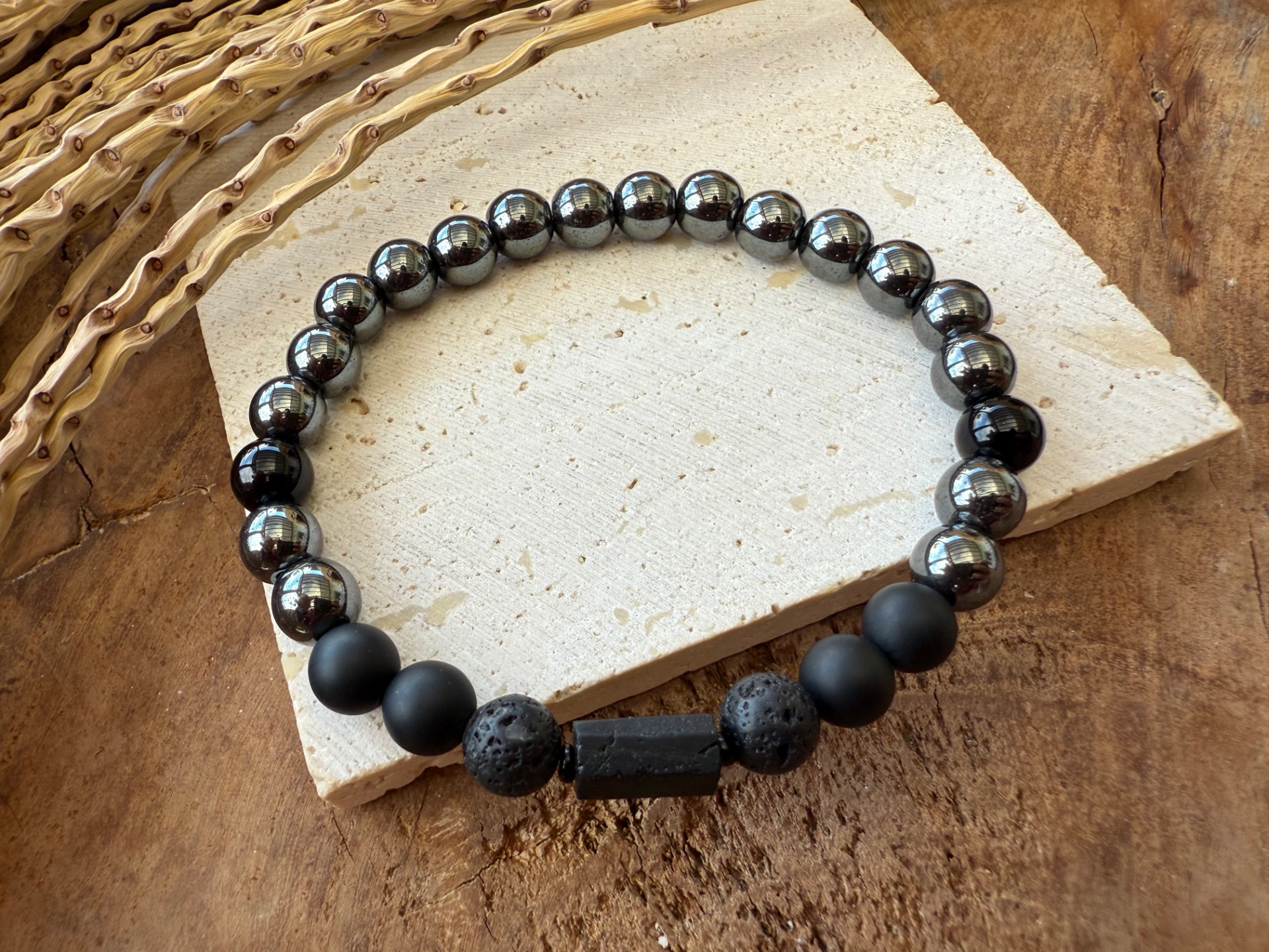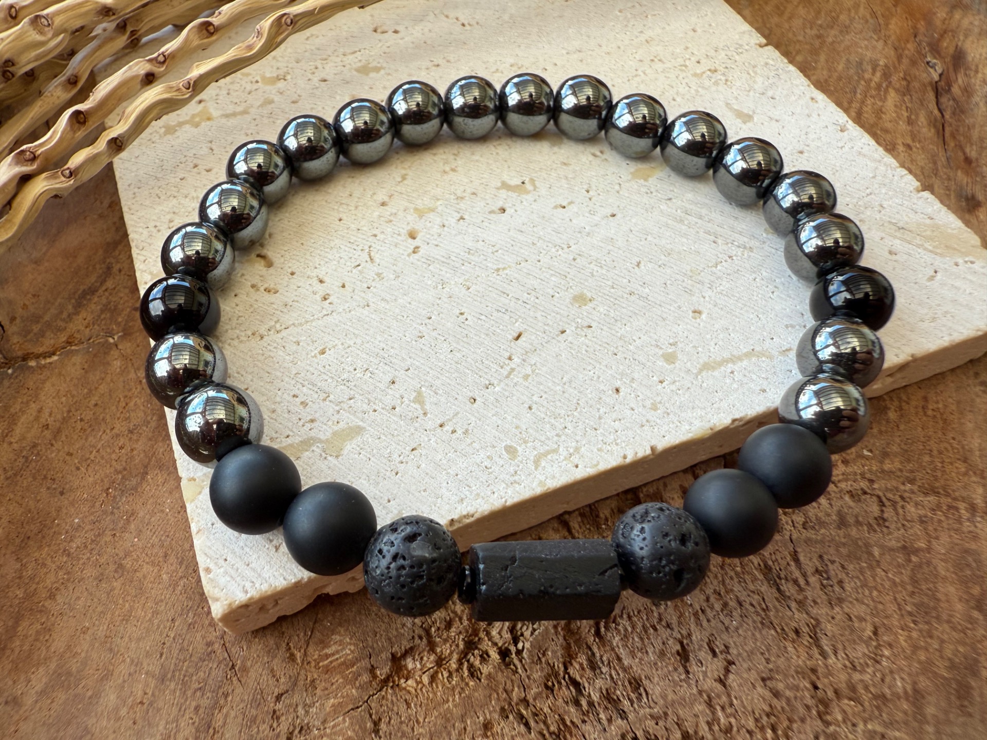 Tento náramok je stvorený pre muža, ktorý vie, kým je — alebo sa k tomu práve prebúdzha. Kombinácia tmavých, zemitých kameňov spája vnútornú silu, odvahu a stabilitu. Každý z minerálov v sebe nesie ukotvenie, ochranu a pokoj, ktoré ti pomáhajú stáť pevne aj v náročných obdobiach.