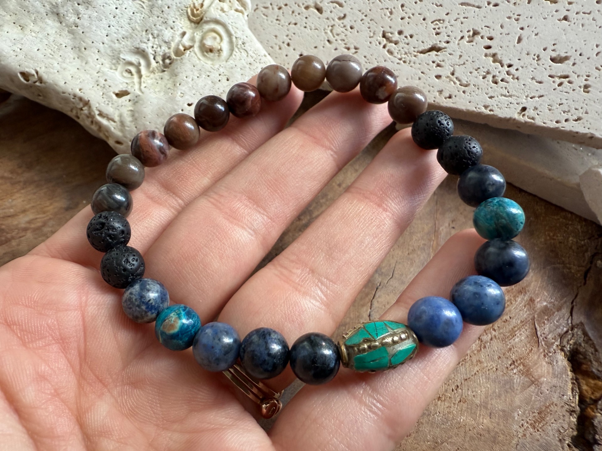 Ručne vytvorený z kombinácie hnedého achátu, lávového kameňa, shattuckitu, sodalitu a doplnený o nepálsku korálku vpredu – symbol múdrosti a duchovnej ochrany.