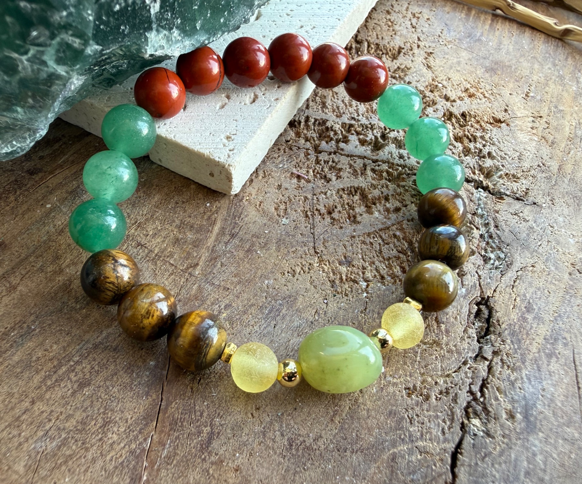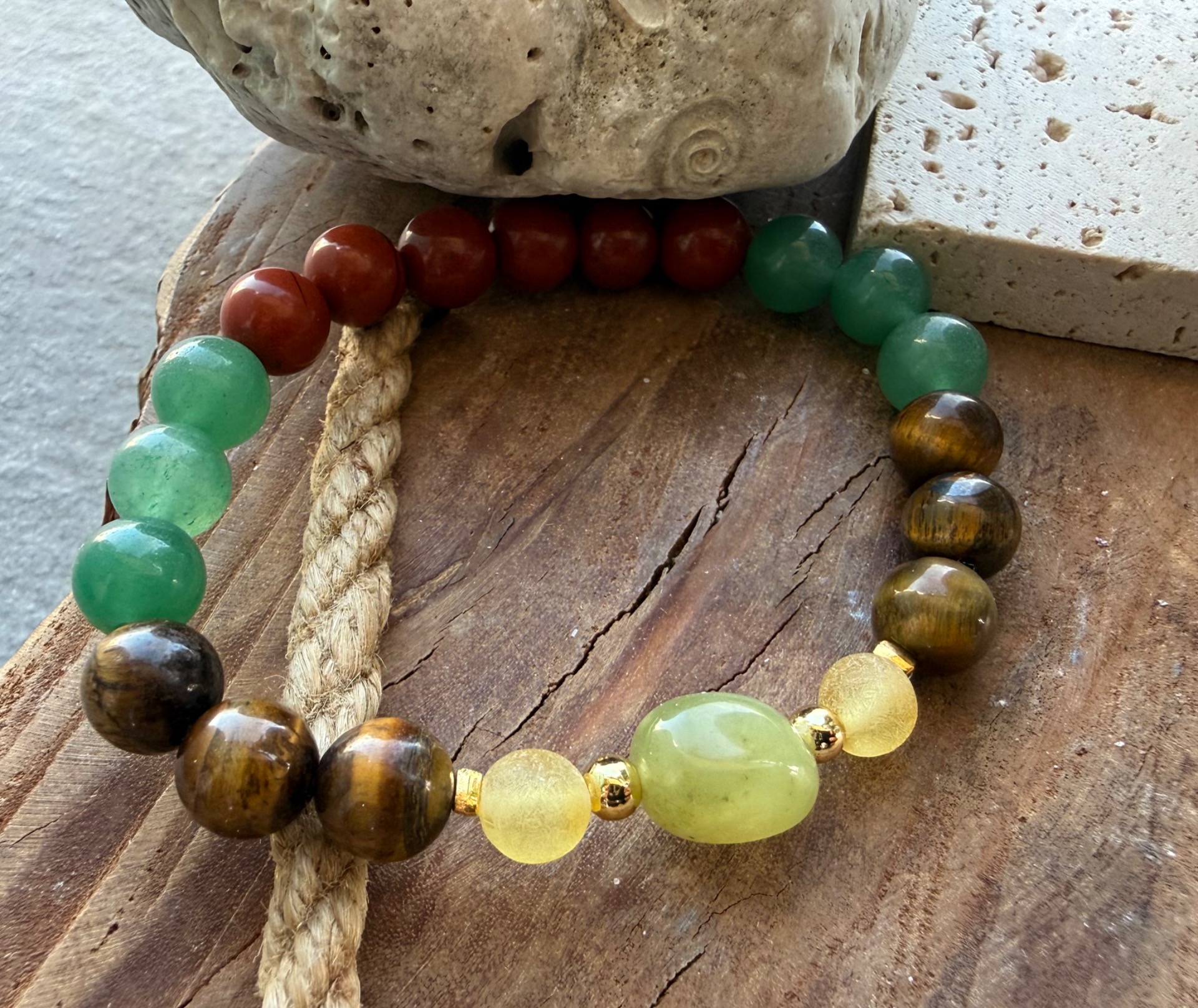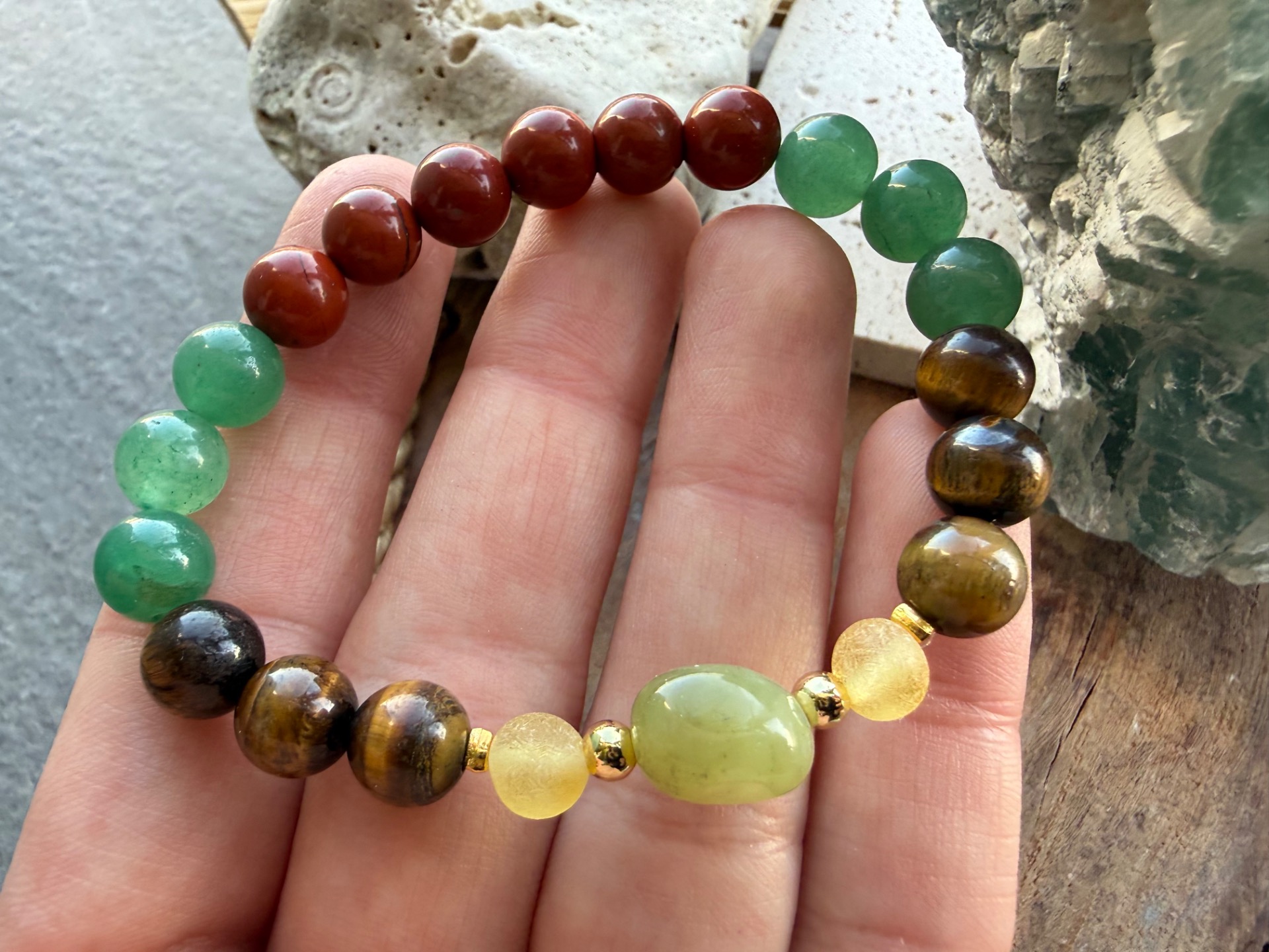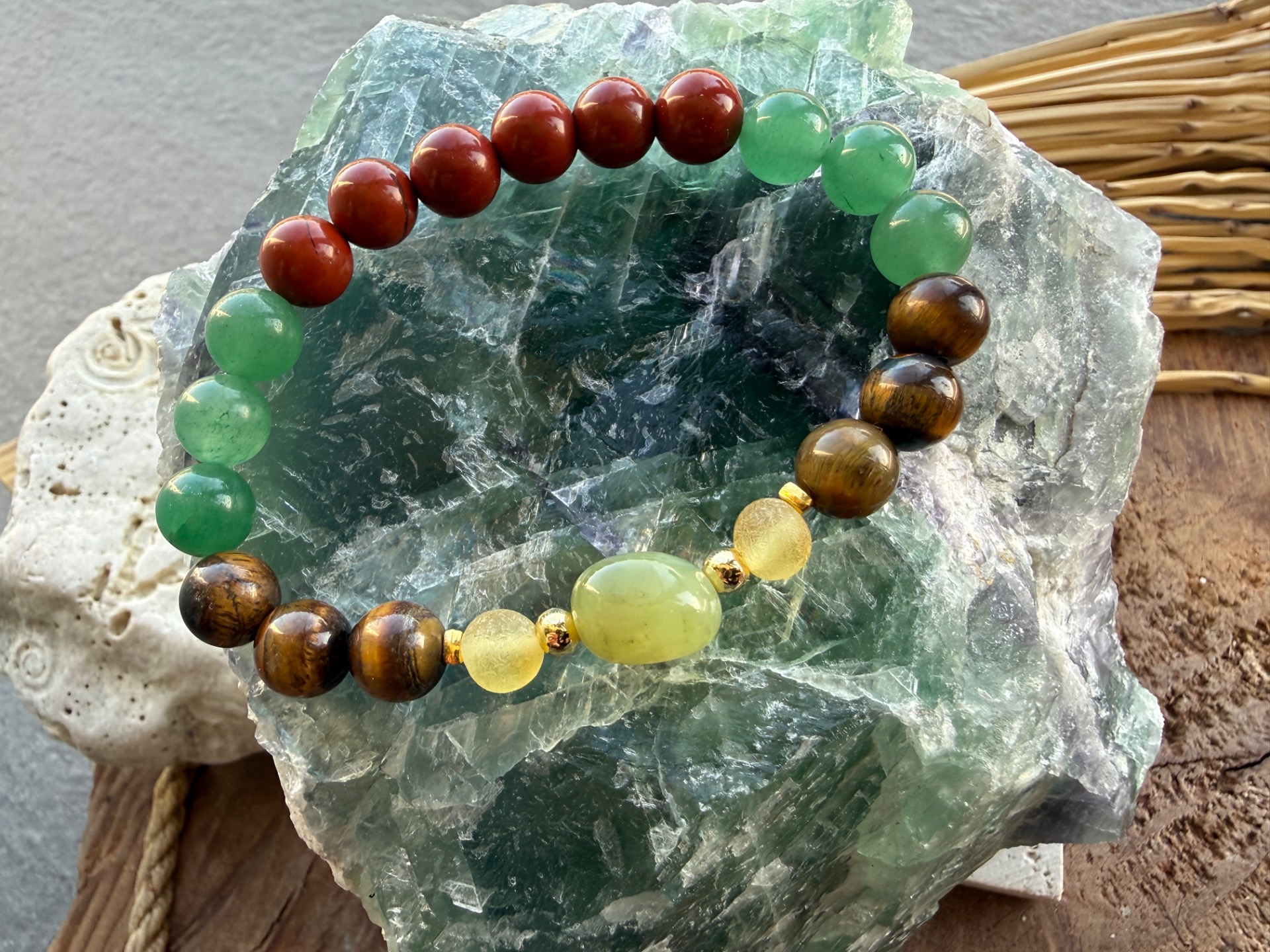 Jedinečný náramok vytvorený z harmonickej kombinácie minerálov, ktoré sú oddávna spájané s energiou hojnosti, vitality, ochrany a šťastia. Každý kameň v sebe nesie vlastný príbeh a spolu vytvárajú silný energetický celok pre podporu radosti, sebavedomia a pozitívneho naladenia.