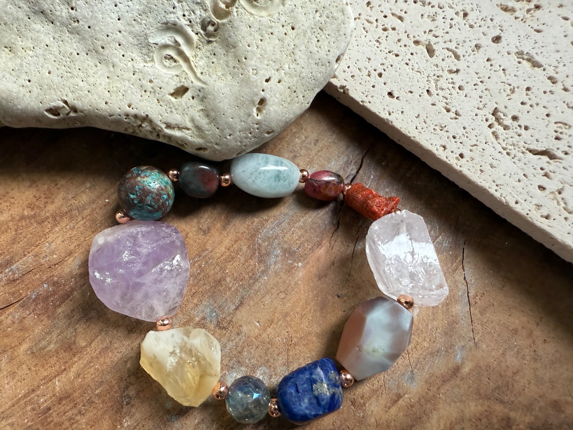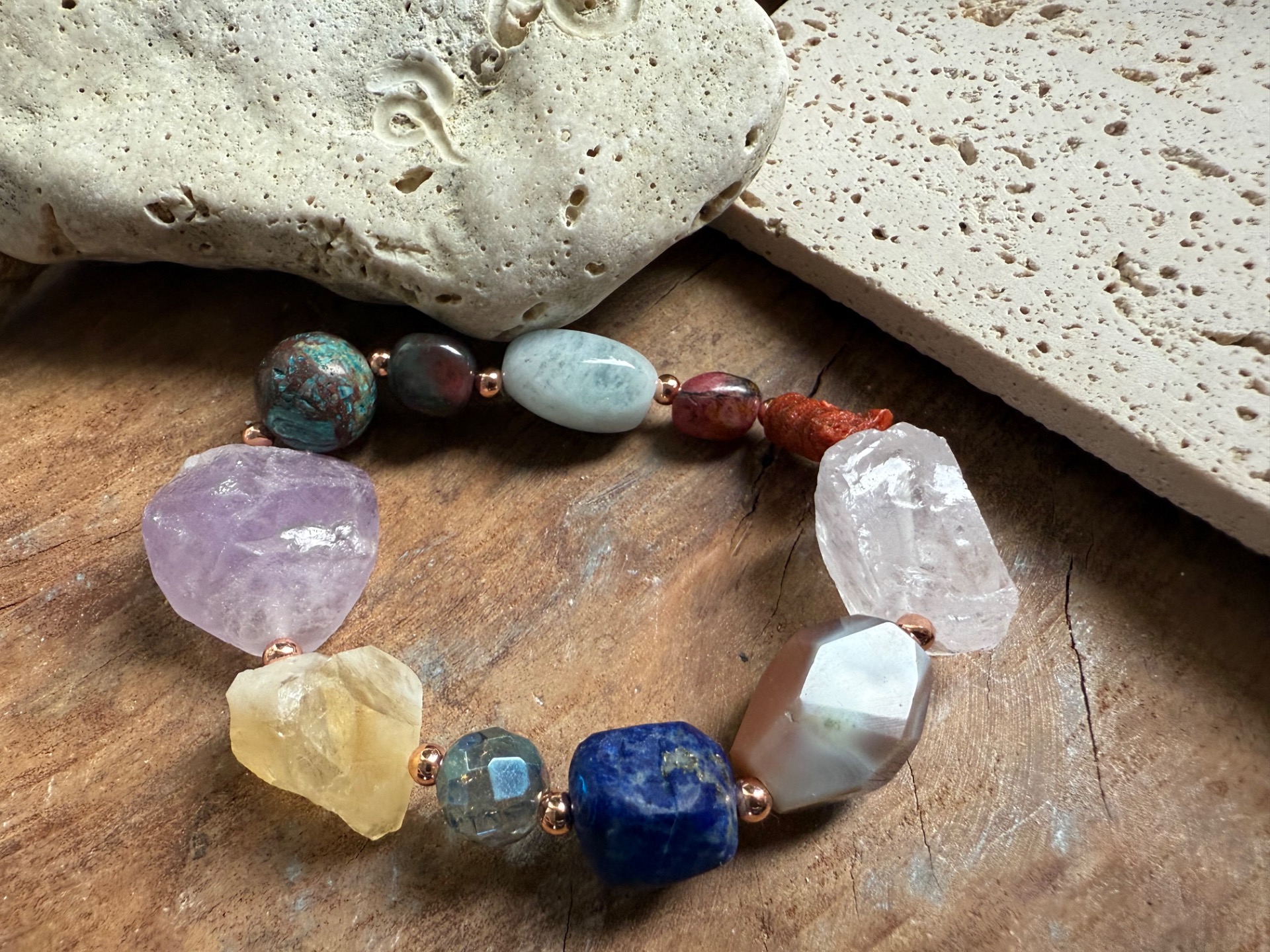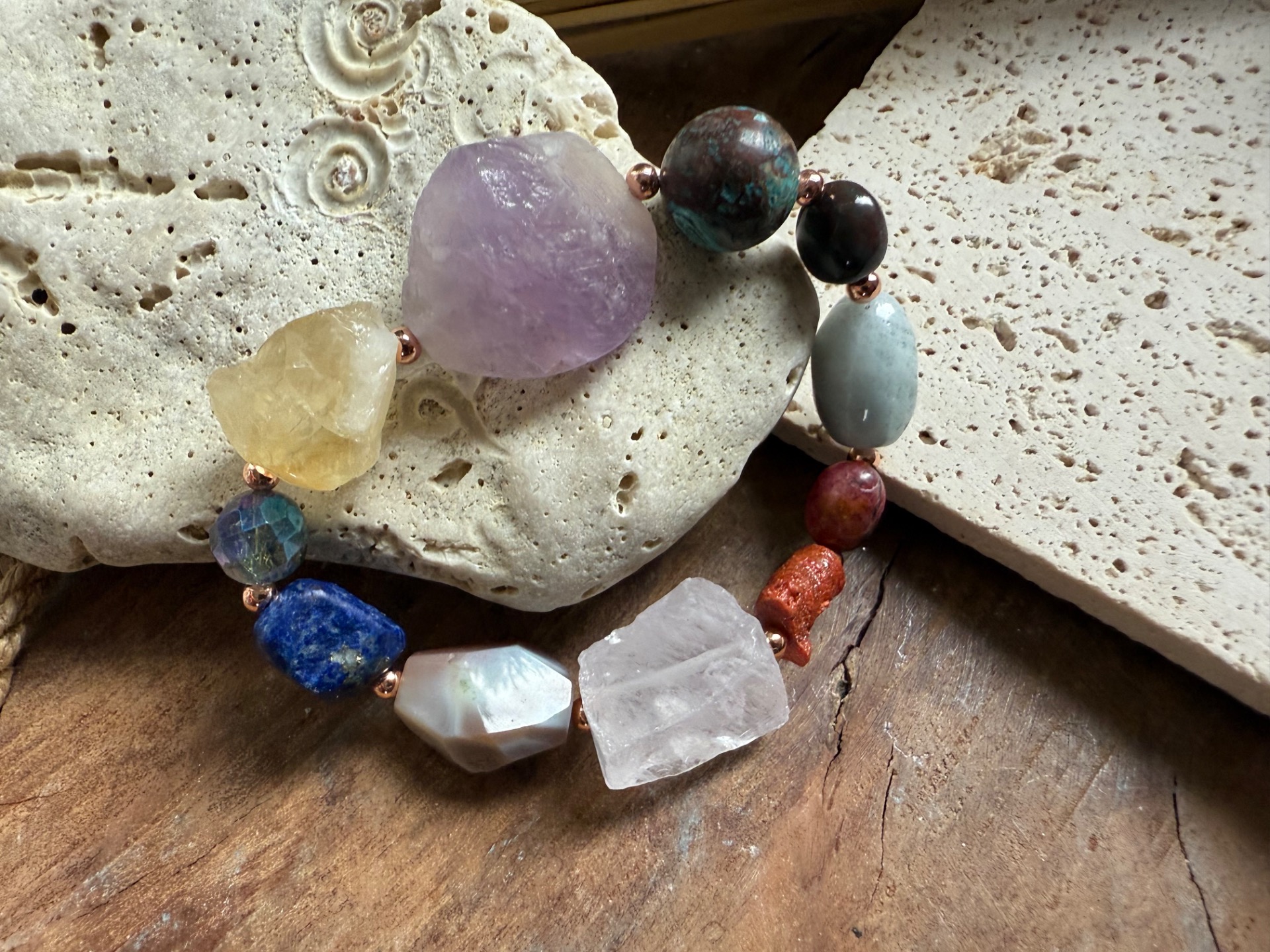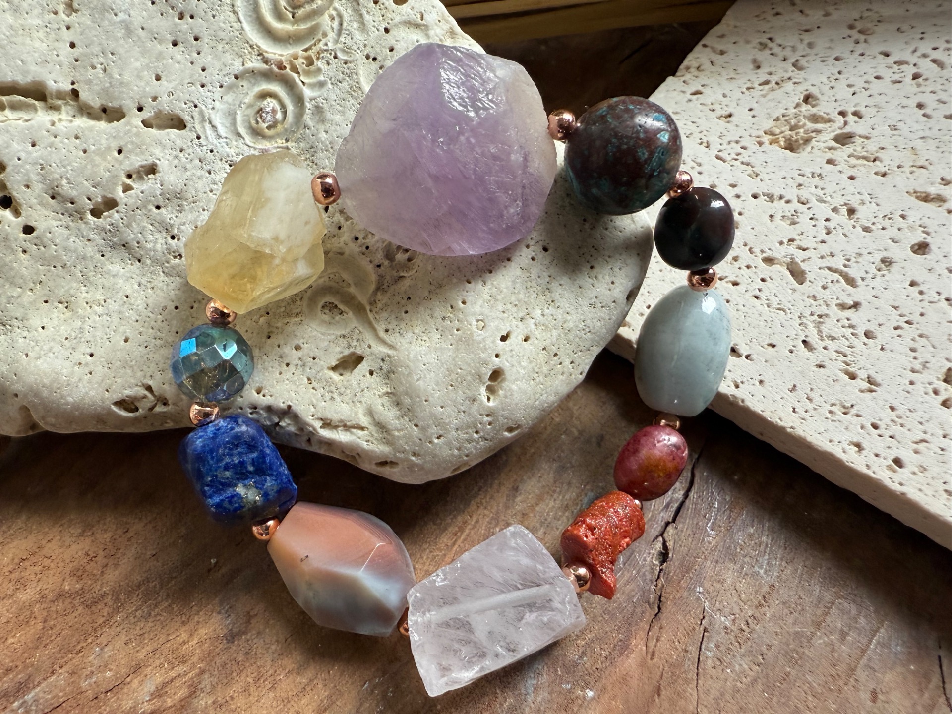 V jedinom kúsku sa stretáva modrý jaspis, lapis lazuli, bocvanský achát, surový citrín, ametyst, drodolid, akvamarín, horský krištáľ a granát. Každý z nich je jedinečný, s vlastnou textúrou a tvarom – žiadne dve korálky nie sú rovnaké.