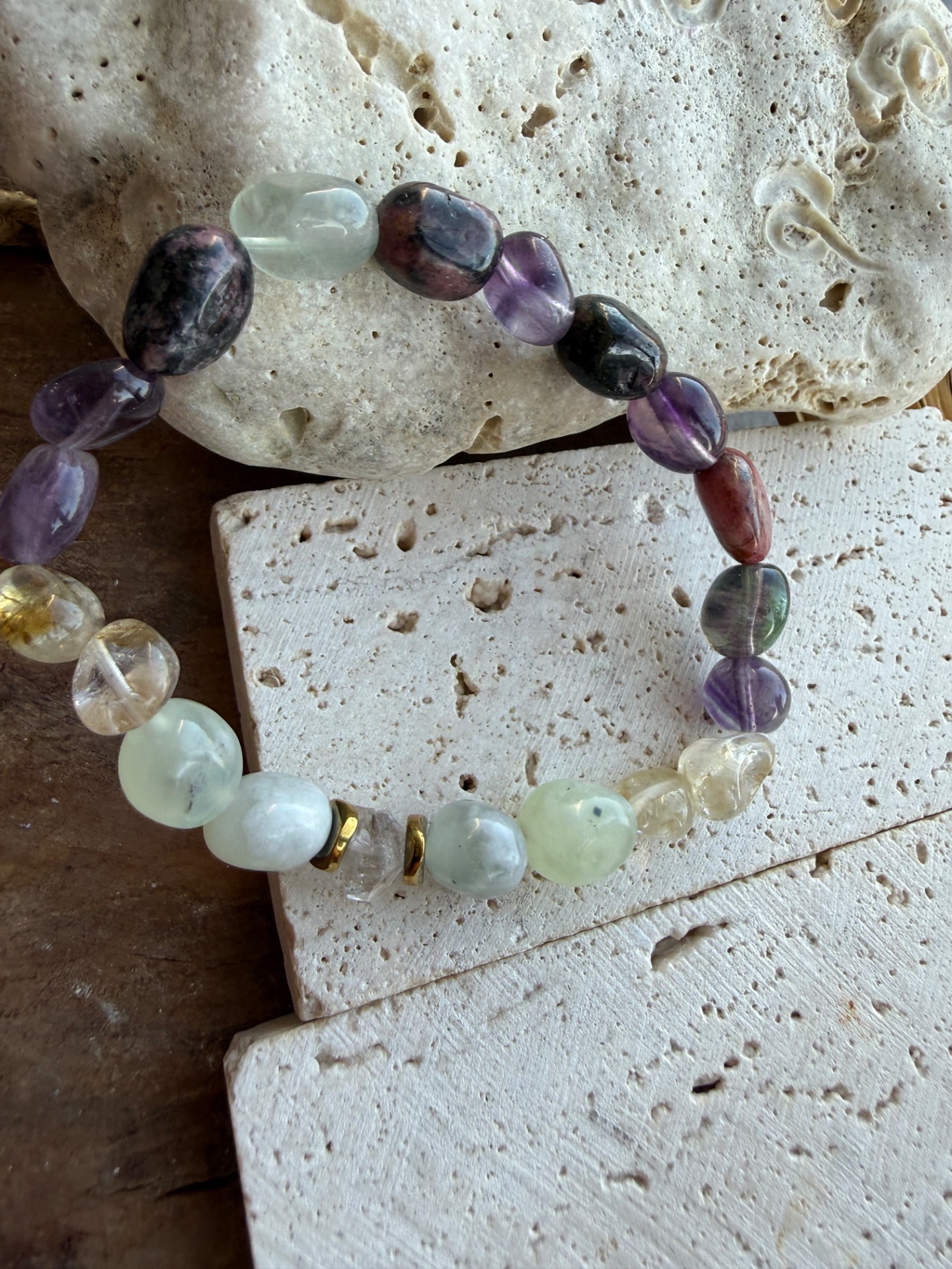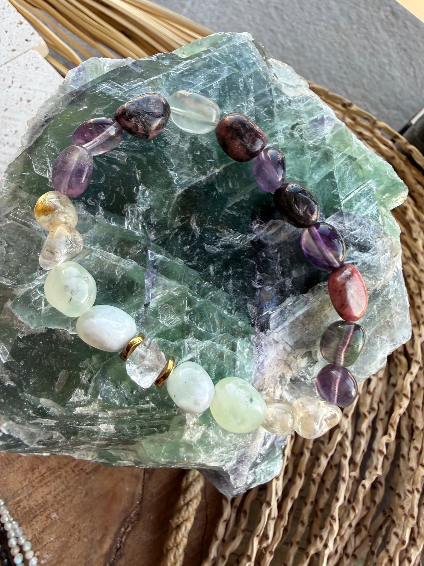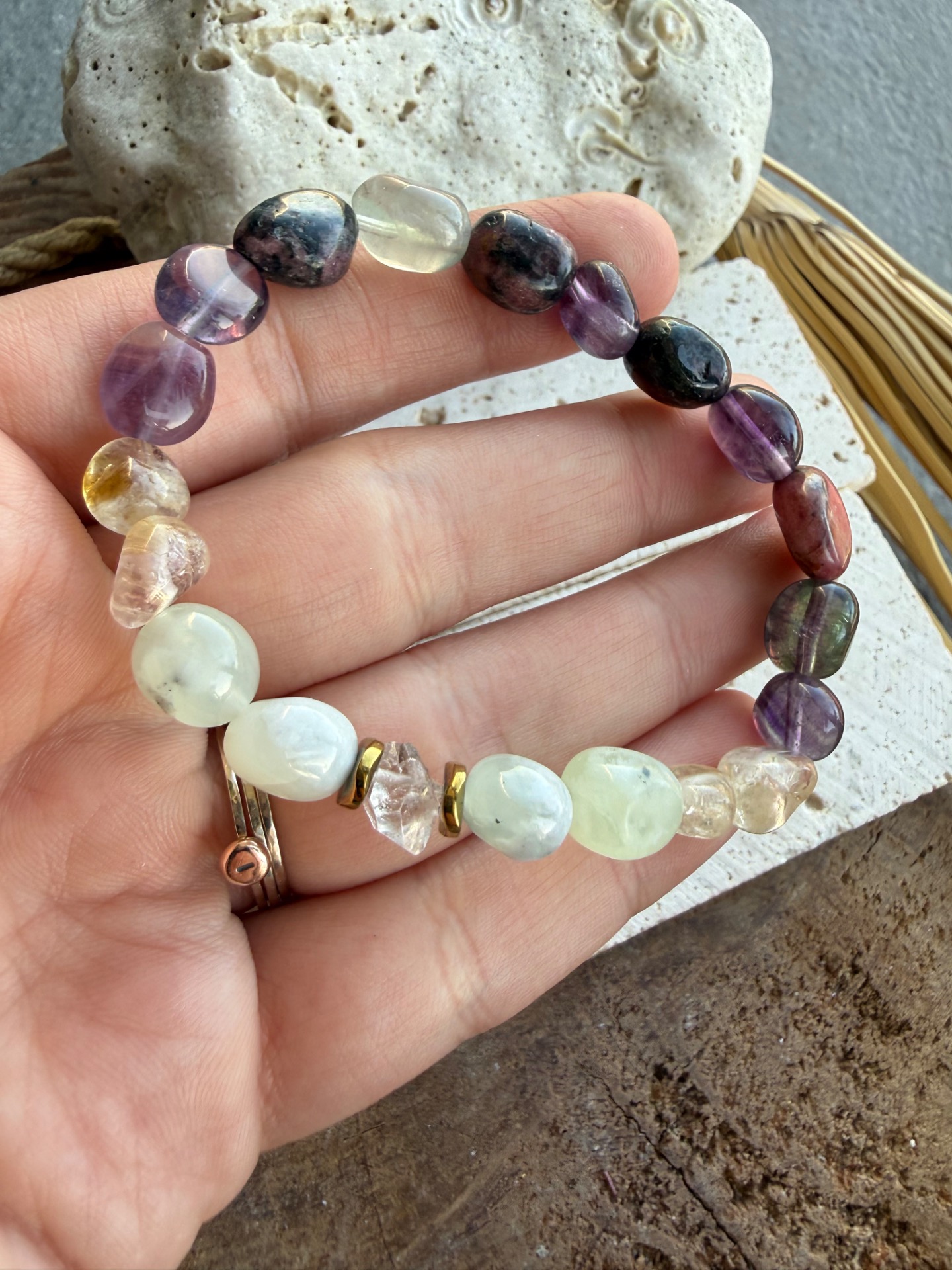 Originálny náramok vytvorený z nepravidelných nugetov minerálov, ktoré spolu vytvárajú jemnú, no zároveň silnú harmonickú energiu. Kombinácia fluoritu, citrínu, jadeitu, rodonitu a Herkimer krištáľu podporuje vnútornú rovnováhu, pokoj mysle a pozitívne naladenie.