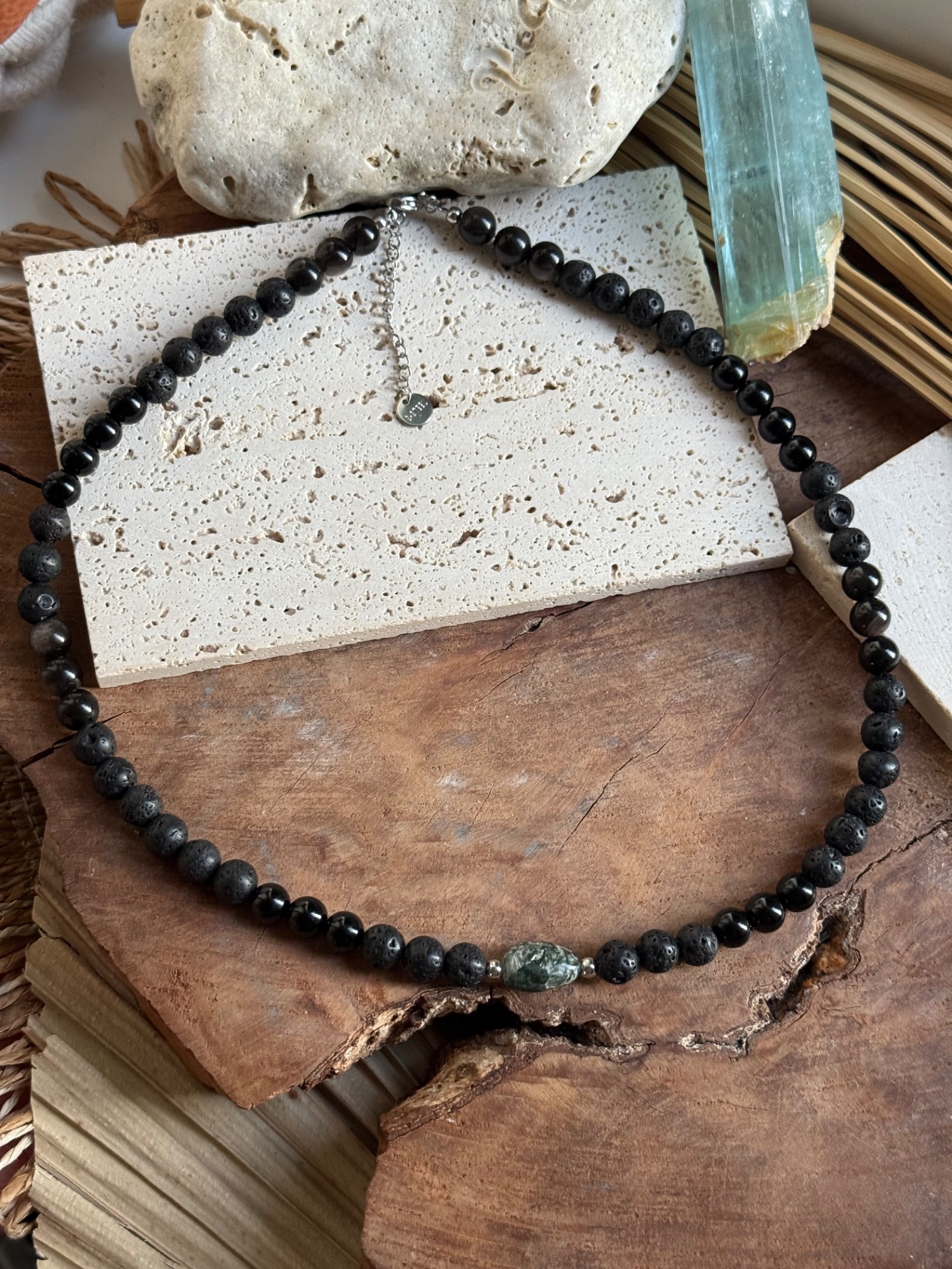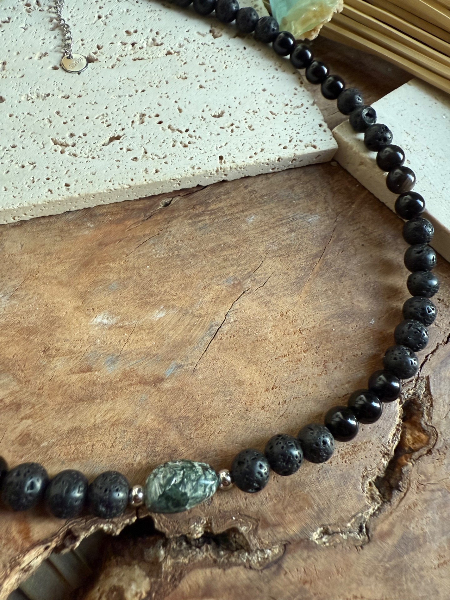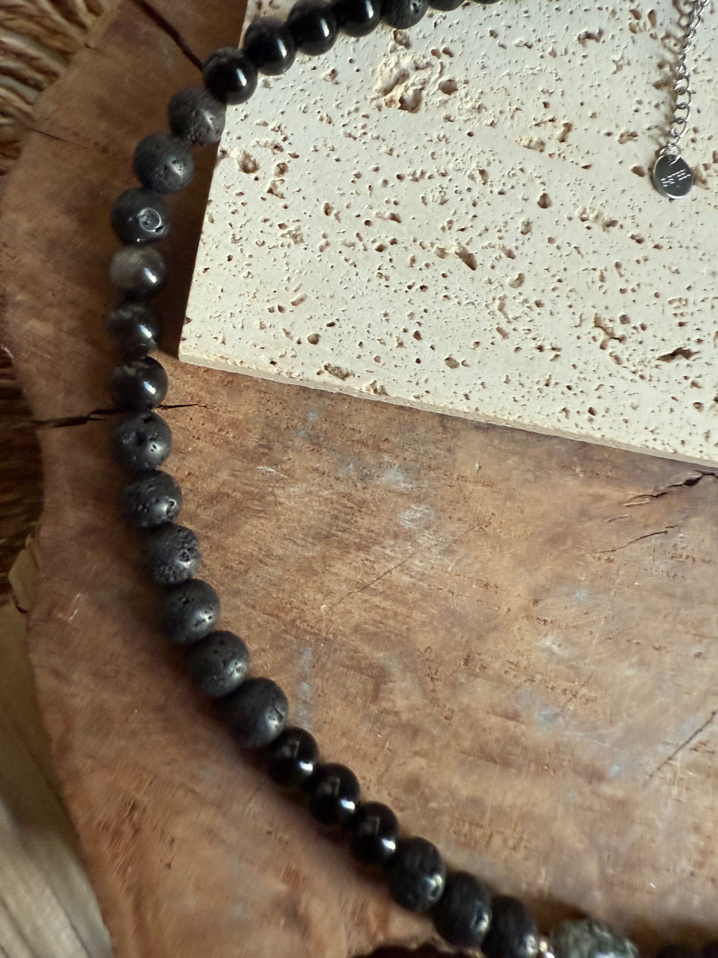 Pánsky náhrdelník zo serafinintu, lávového kameňa, obsidiánu a ónyxu (8 mm)