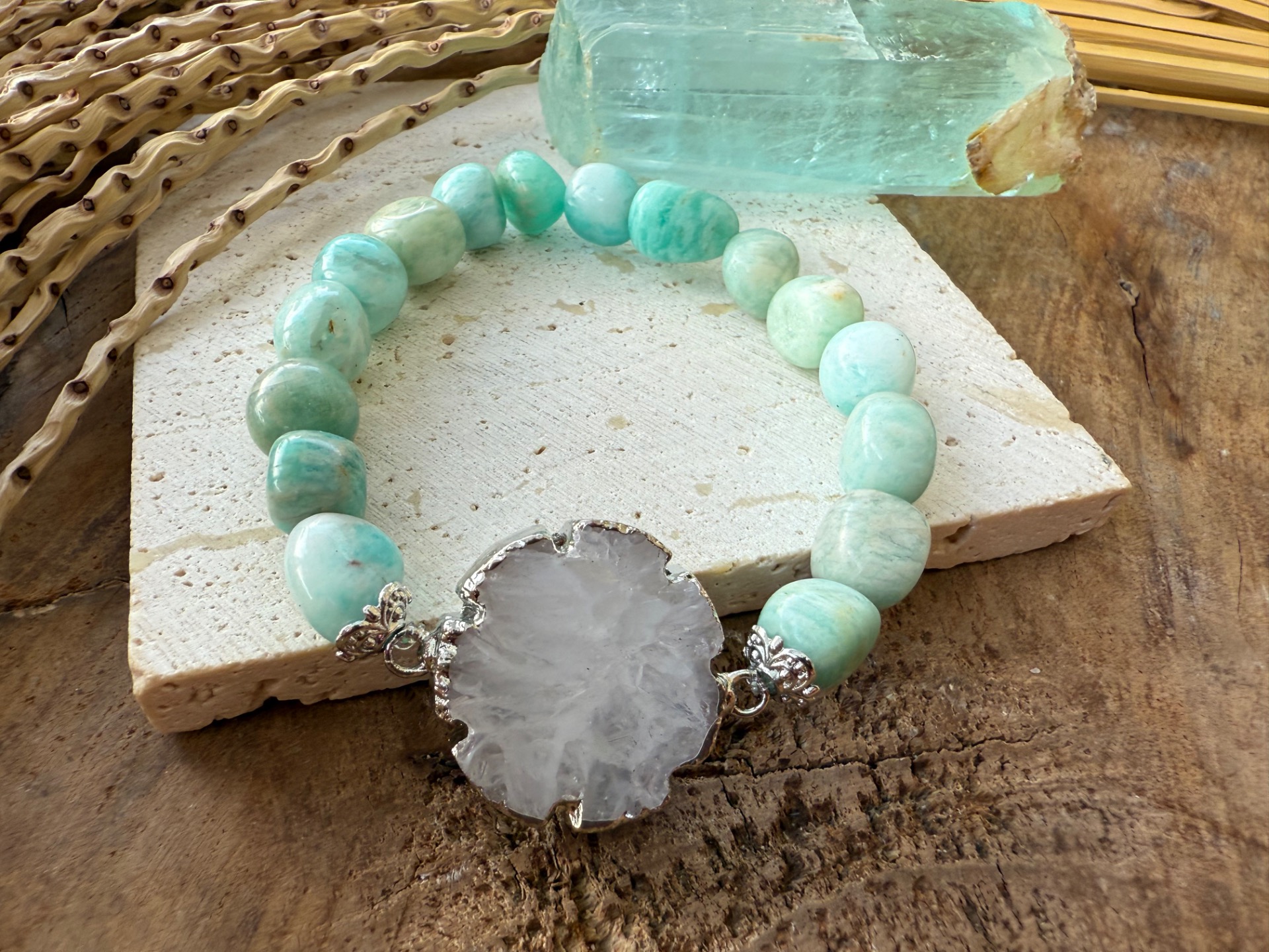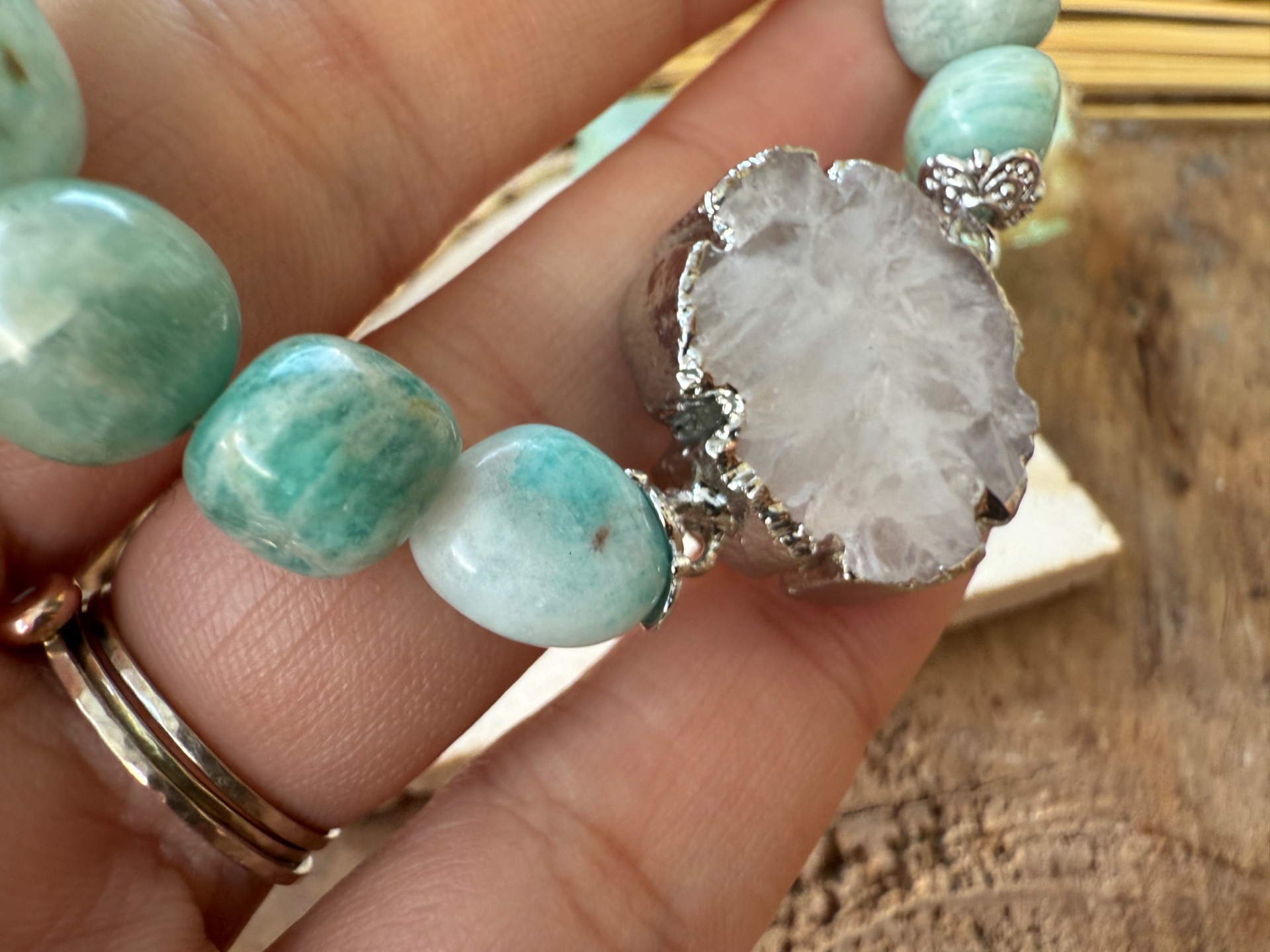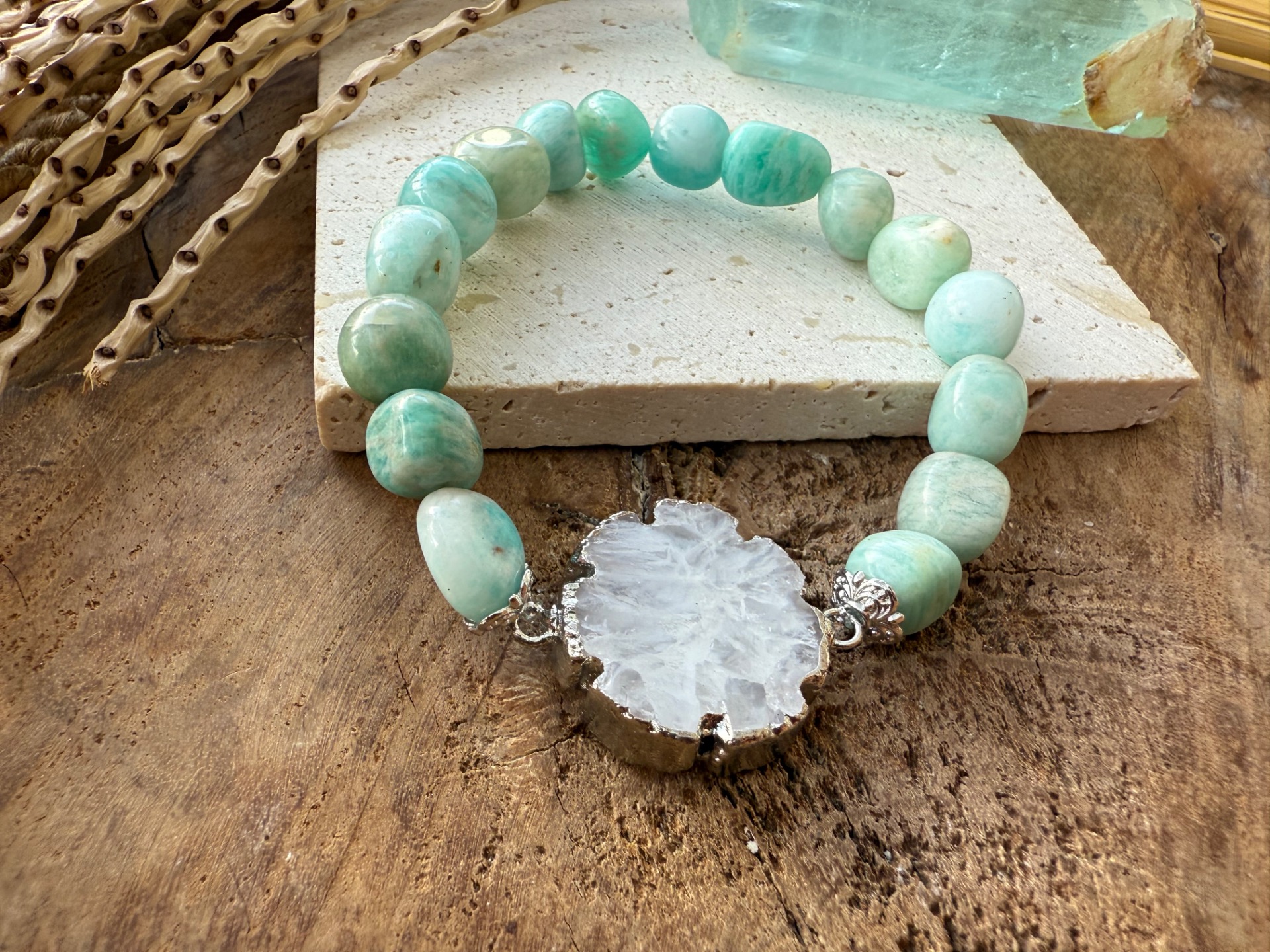 Náramok z dvojkombinácie minerálov achát drúza biela v striebornom okove.
