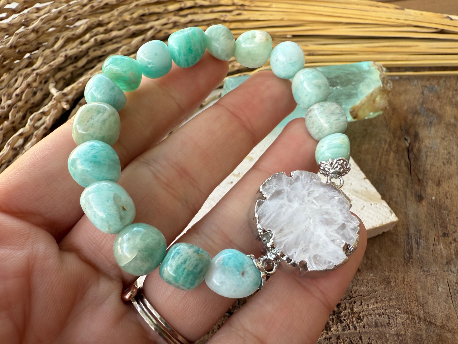 Amazonit uzdravuje a otvára srdečnú aj krčnú čakru, čím pomáha rozvíjať milostnú komunikáciu. Otvára tiež tretie oko a zvyšuje intuíciu. Kameň rozptyľuje negatívne energie a uvoľňuje bloky v nervovom systéme. Je prospešný pri liečbe osteoporózy, zubného kazu, nedostatku vápnika. Napomáha udržovať v rovnováhe metabolizmus narušený uvedenými problémami. Amazonit rovnako prináša úľavu v prípade svalových kŕčov. Významnou vlastnosťou je schopnosť ochrany pred zdravotnými rizikami vyplývajúcimi z použitia mikrovlnej rúry a ďalších zdrojov elektromagnetického smogu.