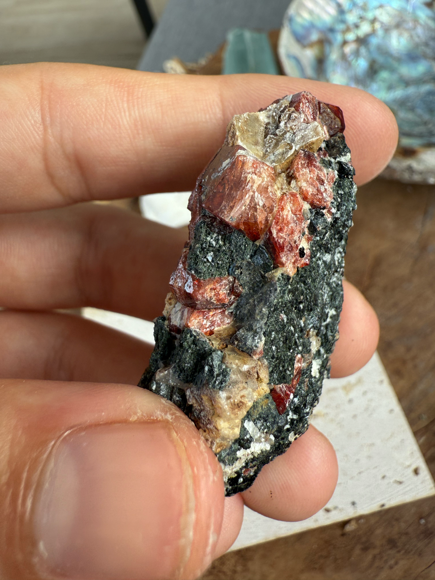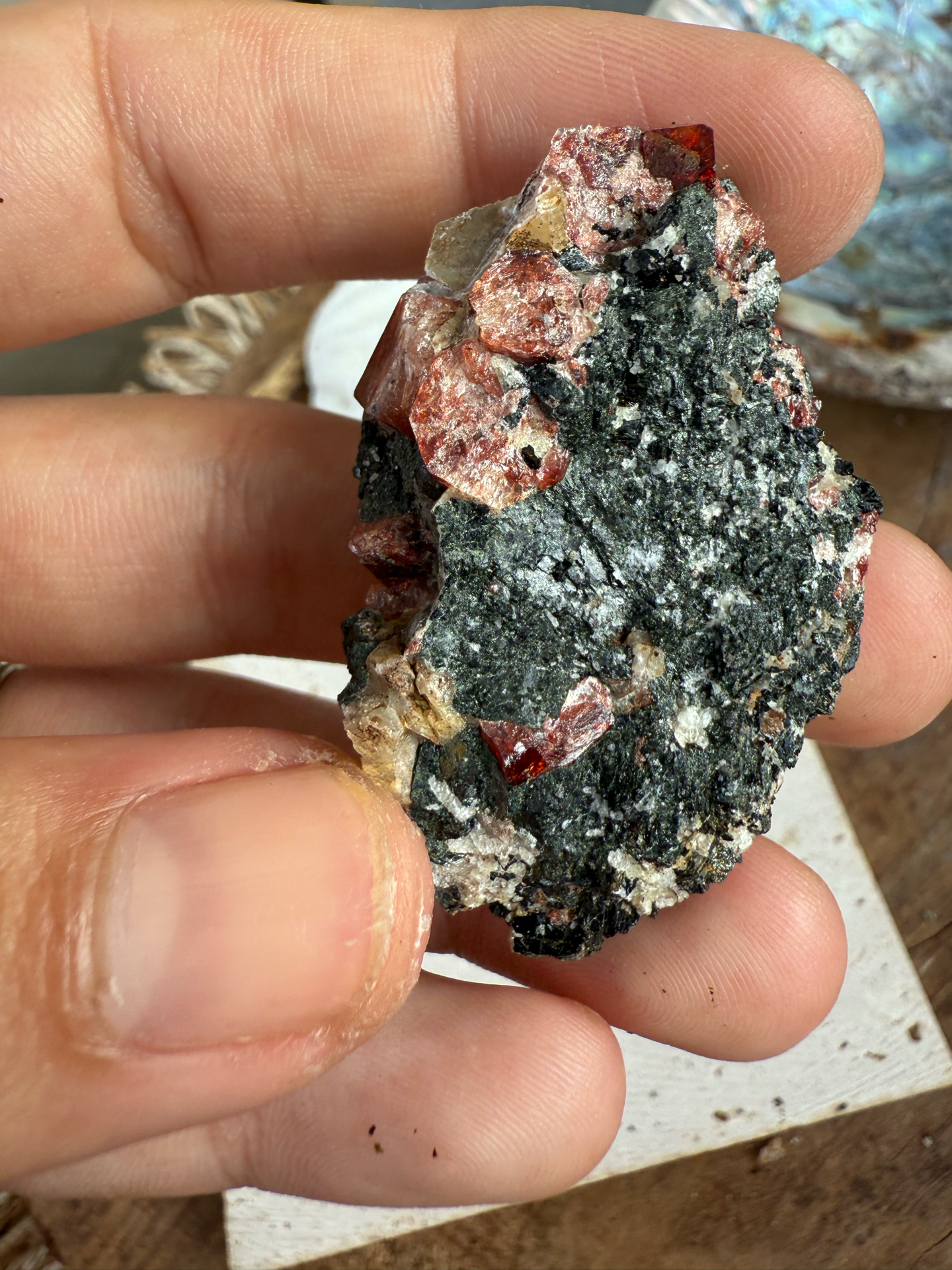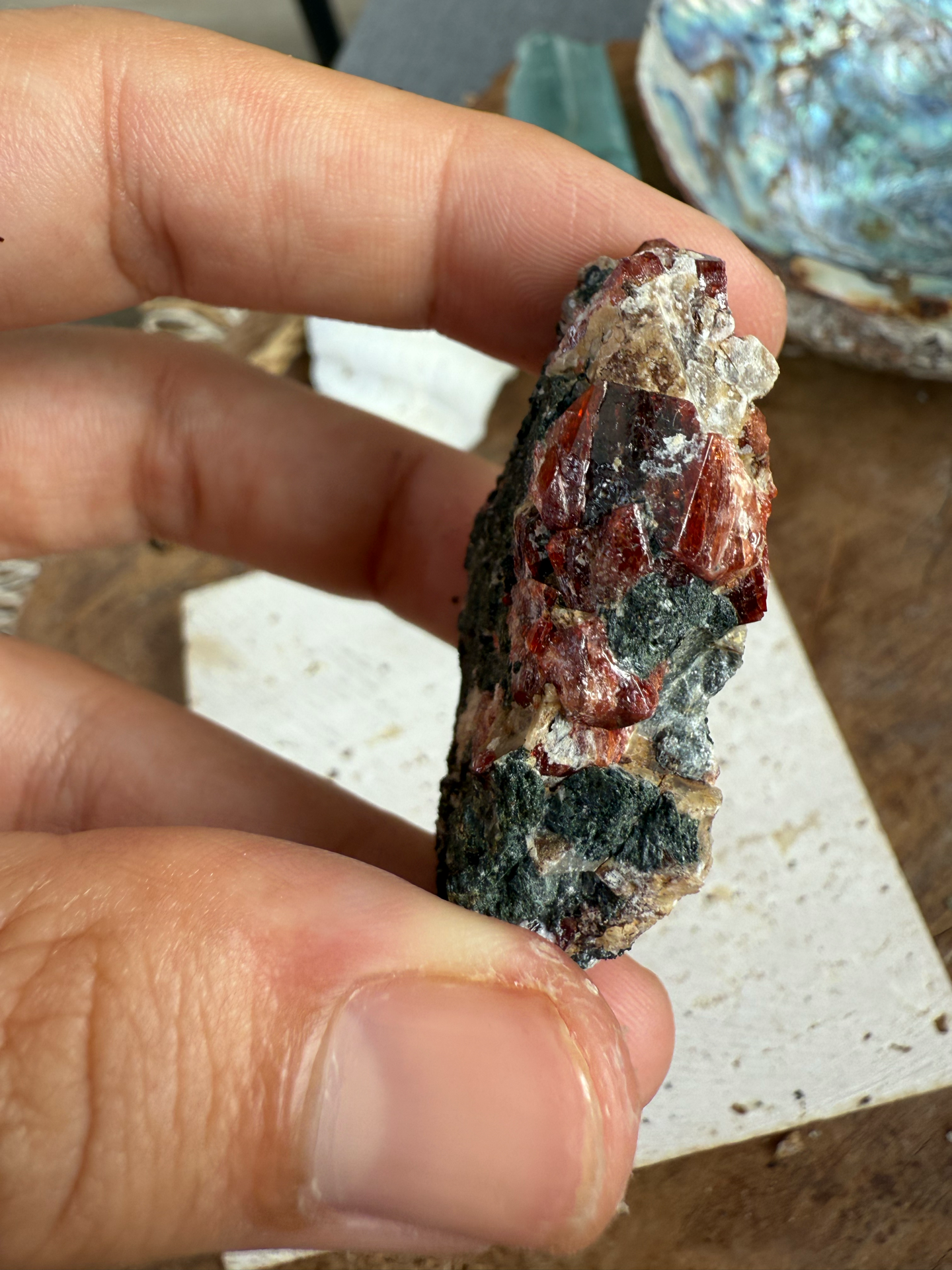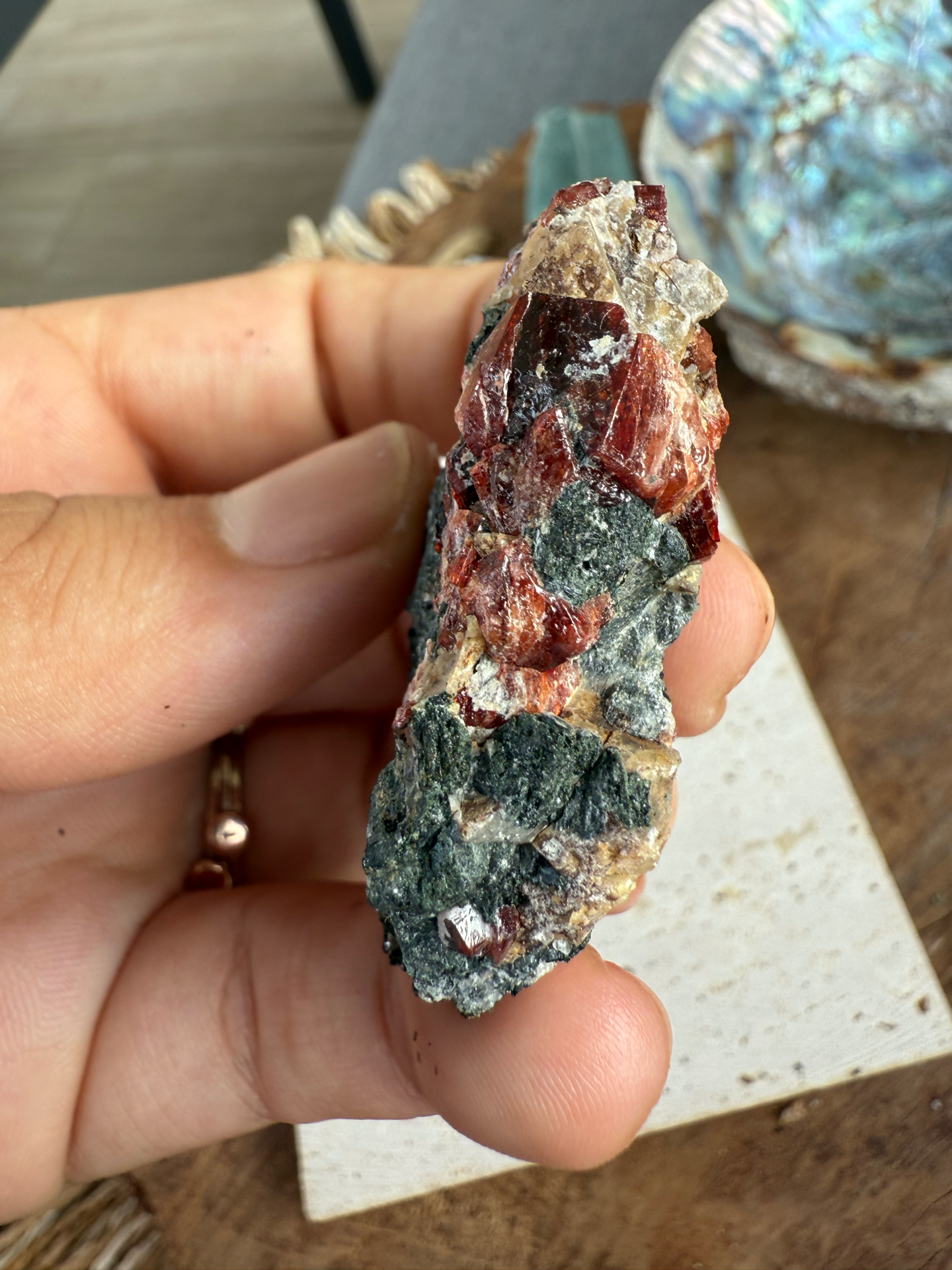 Jeho sýte červeno-krvavé odtiene žiaria v kontraste s horninou, z ktorej sa zrodil. Tento minerál v matrici pôsobí mimoriadne surovo, silno a pravdivo – ako by v sebe niesol samotný dych Zeme.