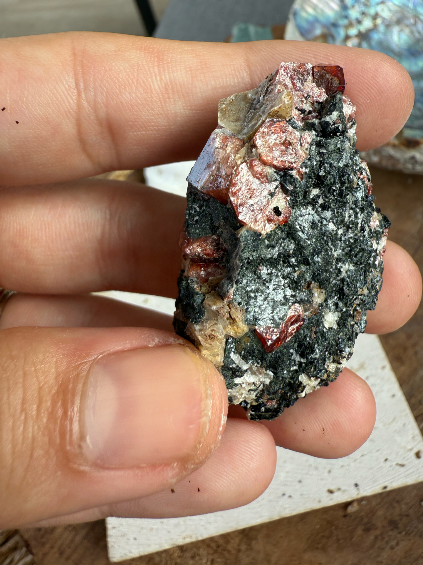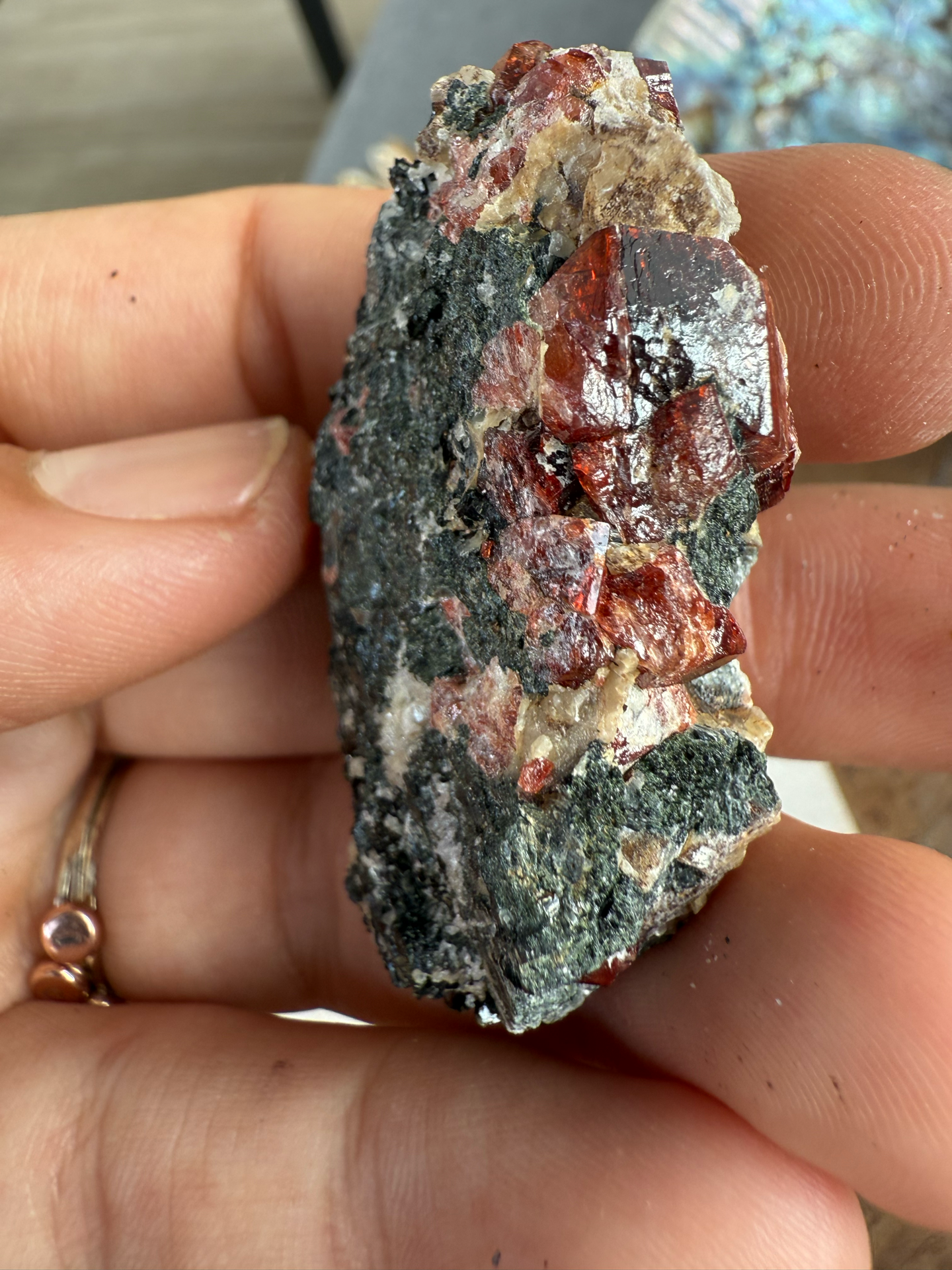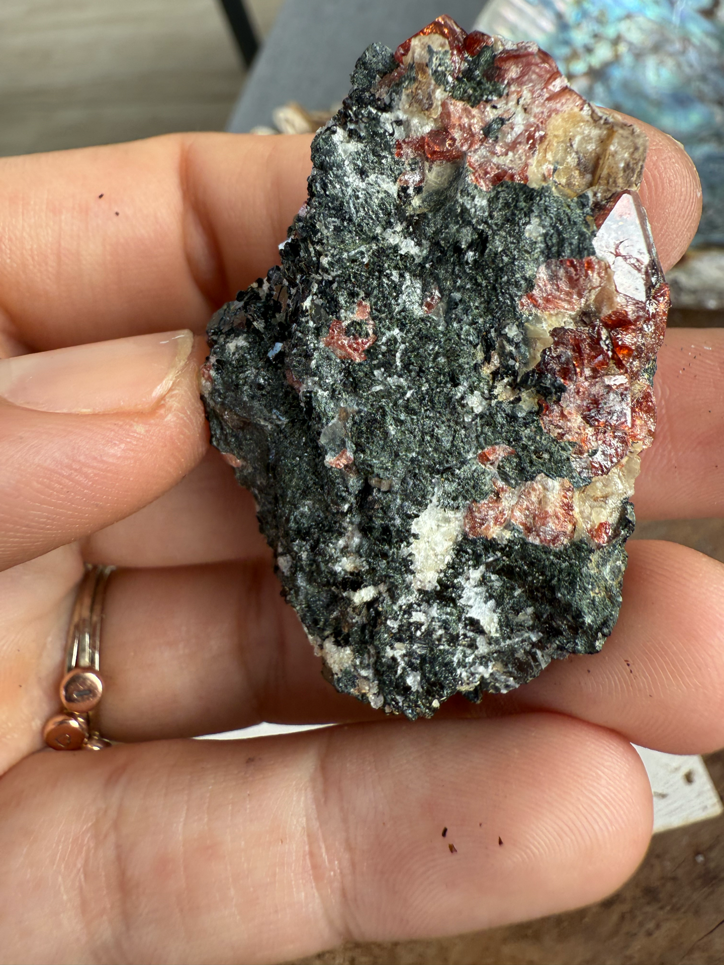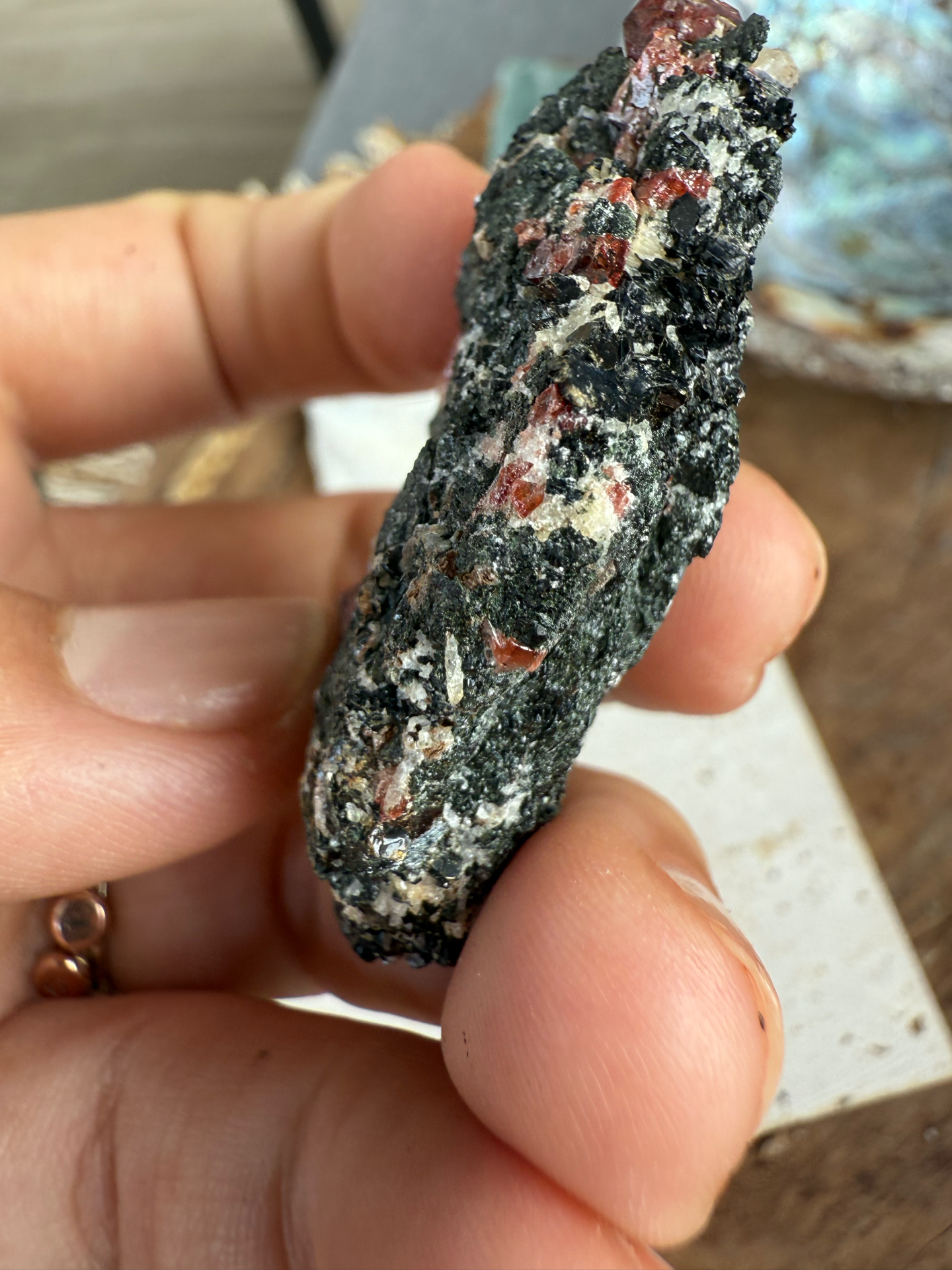 Jeho sýte červeno-krvavé odtiene žiaria v kontraste s horninou, z ktorej sa zrodil. Tento minerál v matrici pôsobí mimoriadne surovo, silno a pravdivo – ako by v sebe niesol samotný dych Zeme.