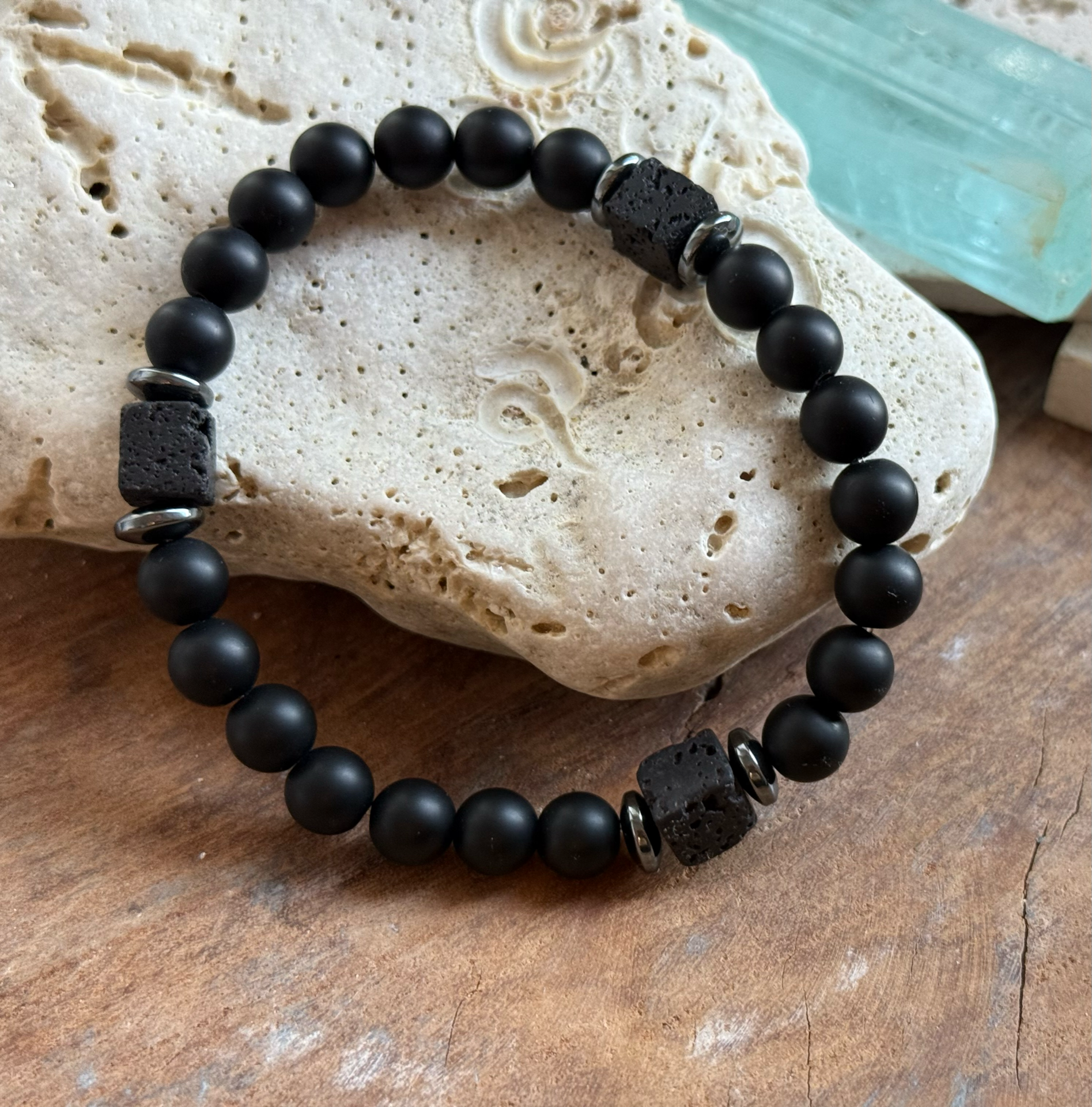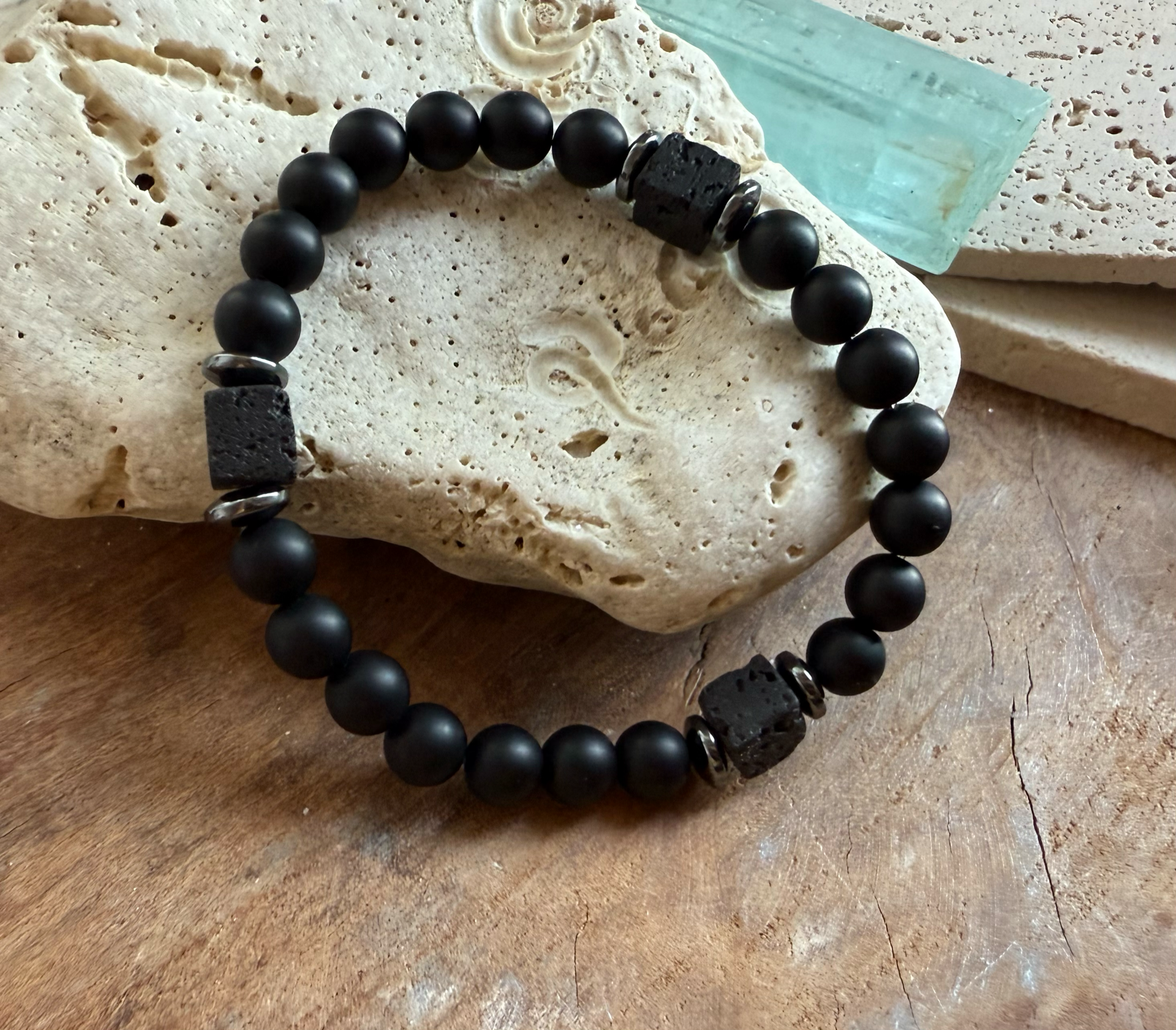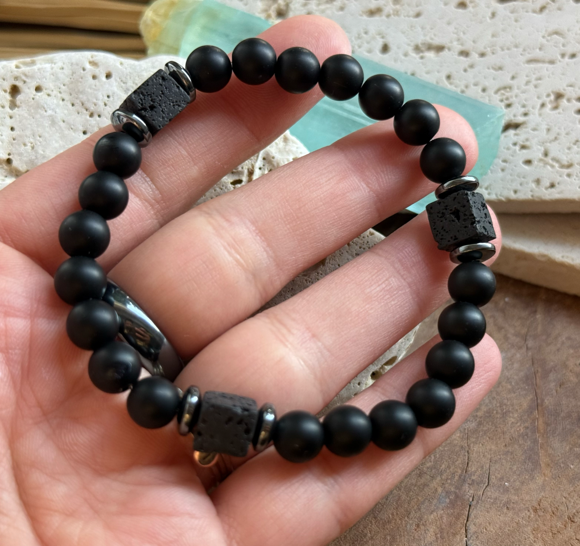 Tento pánsky náramok je určený mužom, ktorí hľadajú ochranu, rovnováhu a spojenie s vlastnou vnútornou silou. Kombinuje 8 mm matný achát s tromi láva kockami umiestnenými rovnomerne po náramku, čím vzniká harmonický a zároveň výrazný dizajn. Láva dodáva šperku autentický a prírodný vzhľad a energeticky pôsobí ako ochranný talizman.