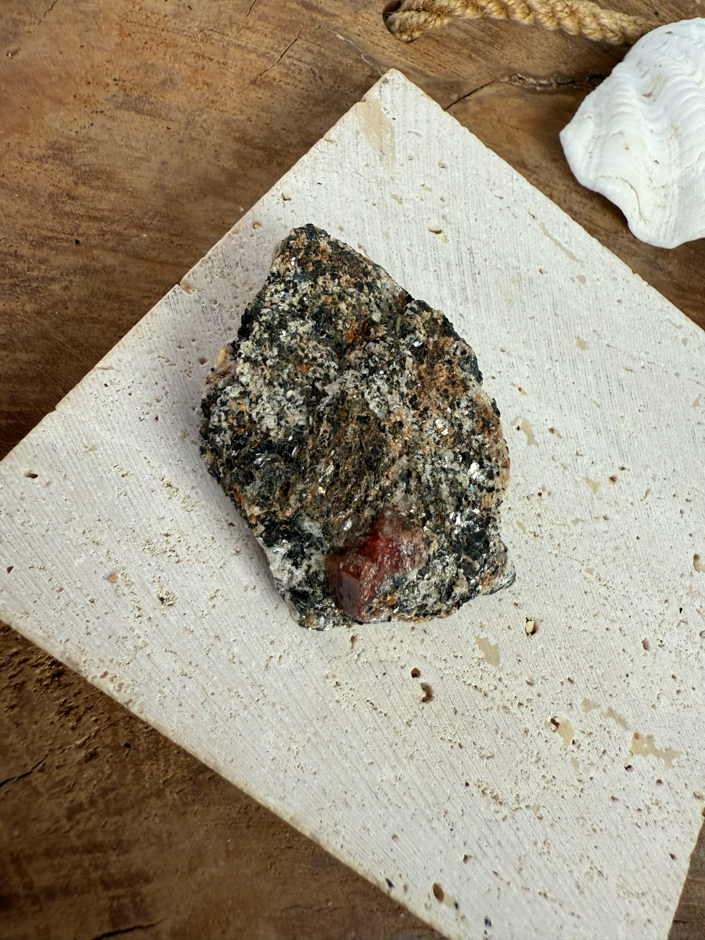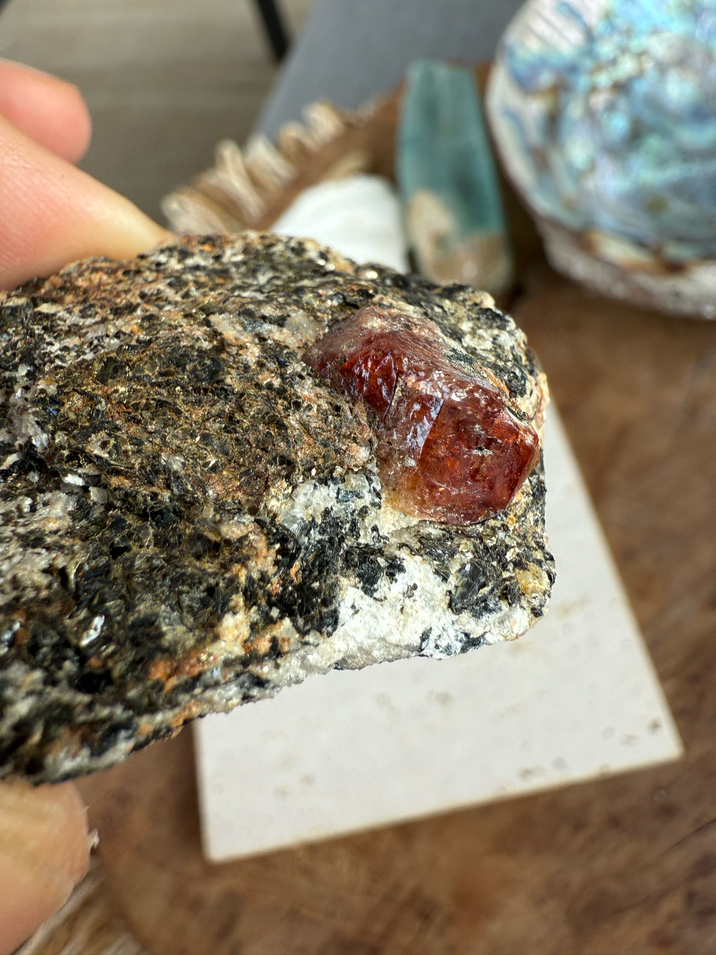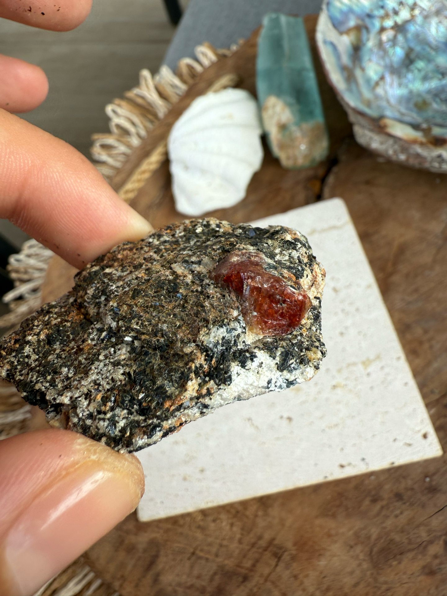 Jeho sýte červeno-krvavé odtiene žiaria v kontraste s horninou, z ktorej sa zrodil. Tento minerál v matrici pôsobí mimoriadne surovo, silno a pravdivo – ako by v sebe niesol samotný dych Zeme.