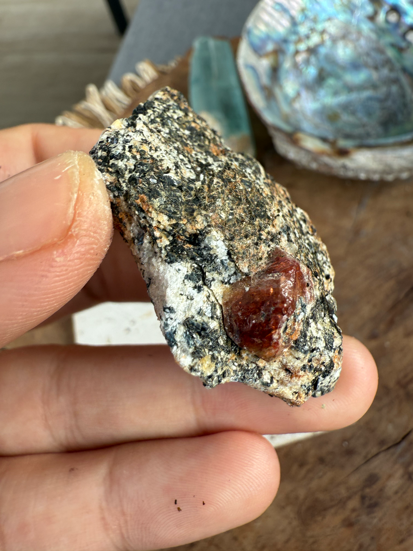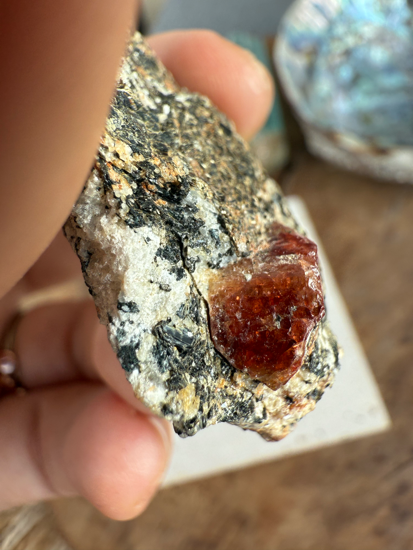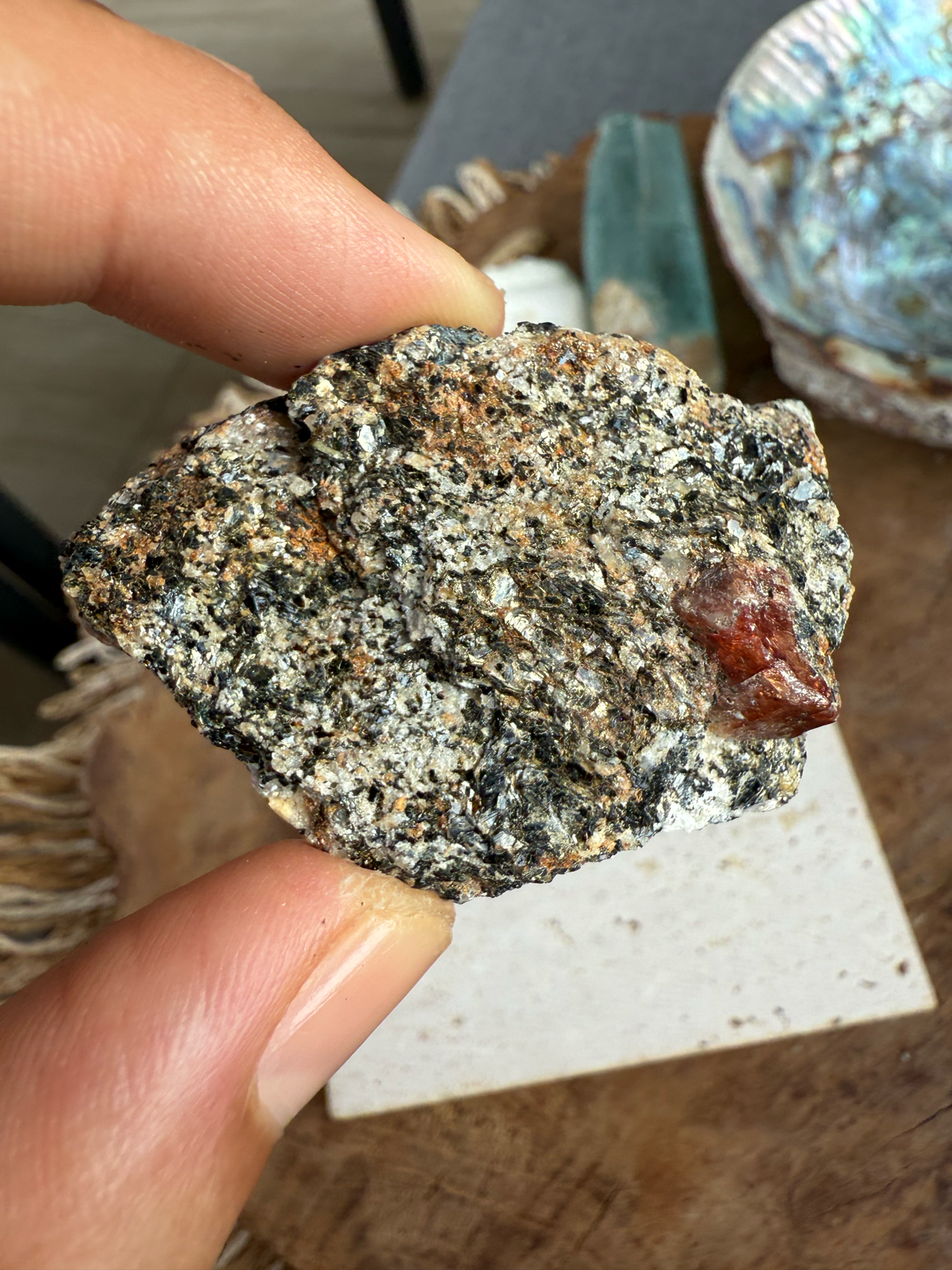 Jeho sýte červeno-krvavé odtiene žiaria v kontraste s horninou, z ktorej sa zrodil. Tento minerál v matrici pôsobí mimoriadne surovo, silno a pravdivo – ako by v sebe niesol samotný dych Zeme.