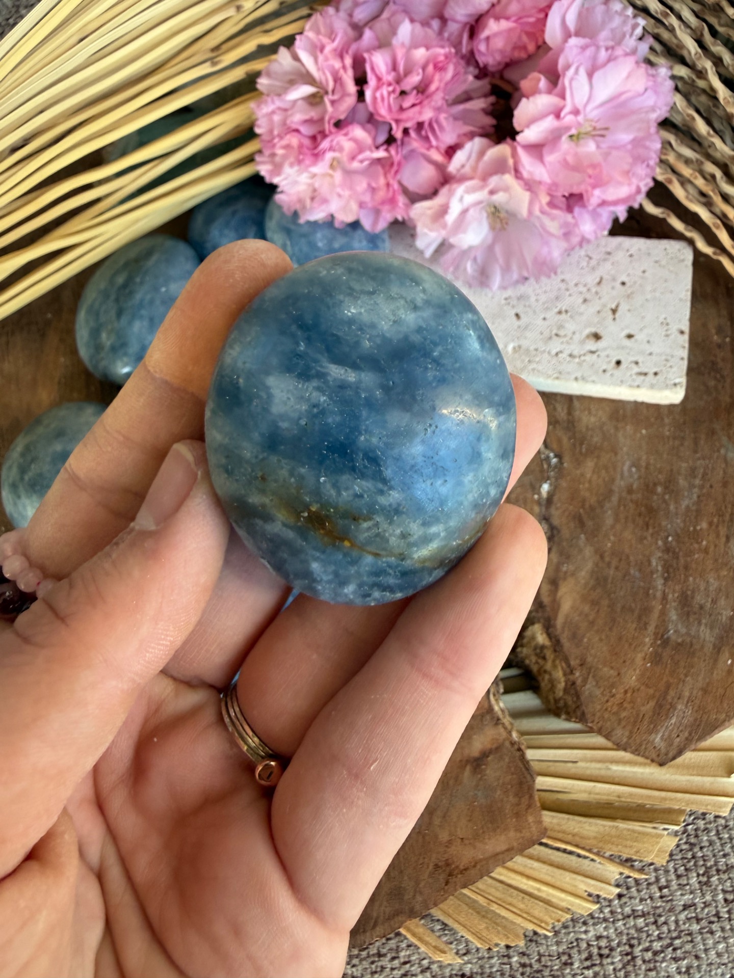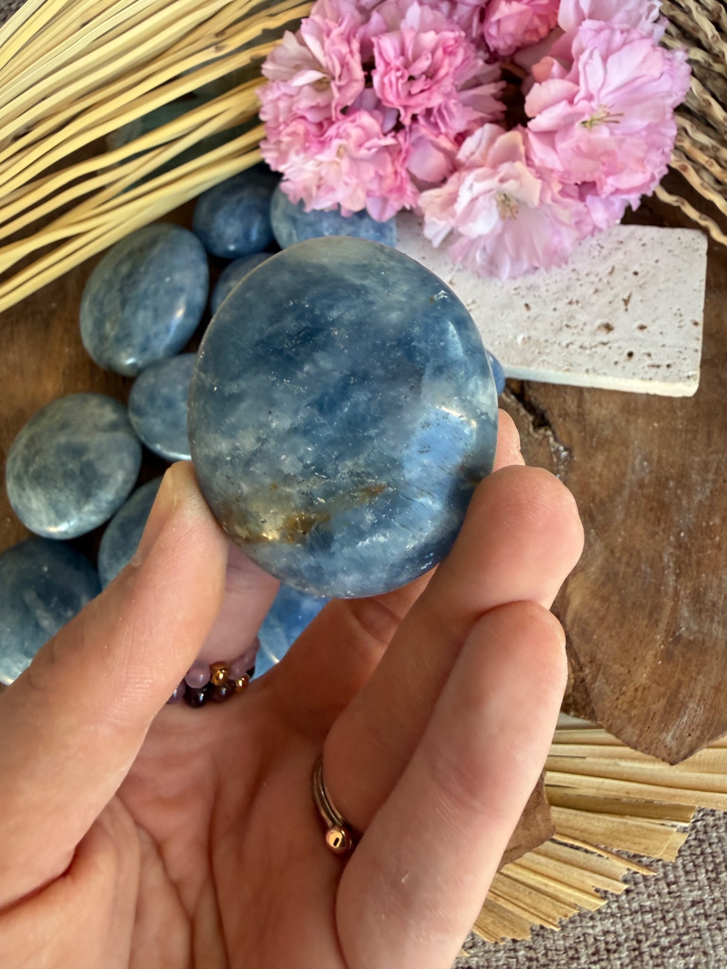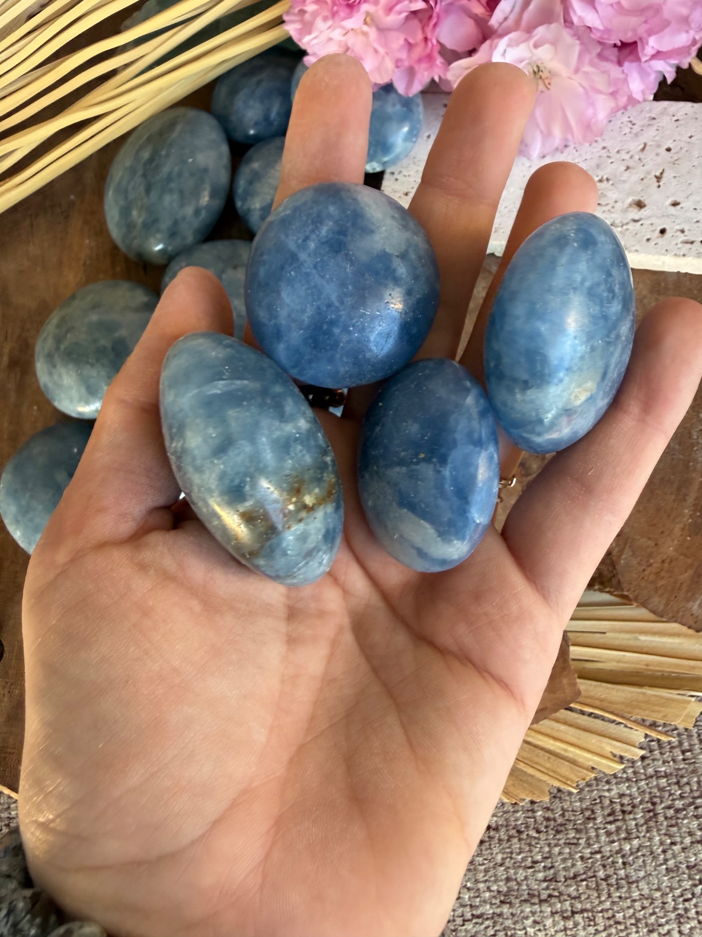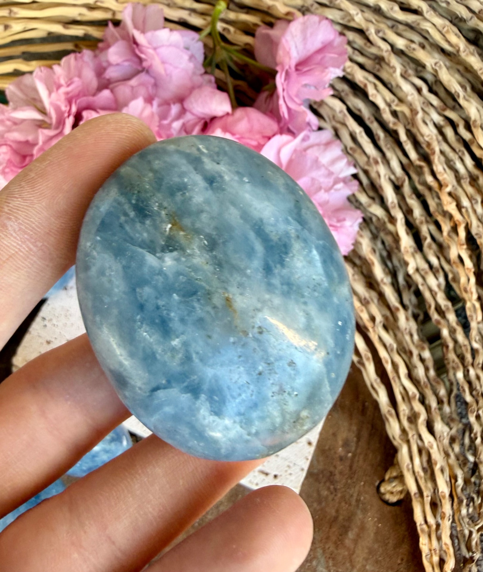 Tento jemný modrý kalcit v tvare hmatky je príjemný, hladký a prirodzene zaoblený kameň, ktorý perfektne padne do ruky. Jeho svetlomodrá až mliečna farba pôsobí upokojujúco a zároveň veľmi čisto, ako jemná energia vody a pokoja.