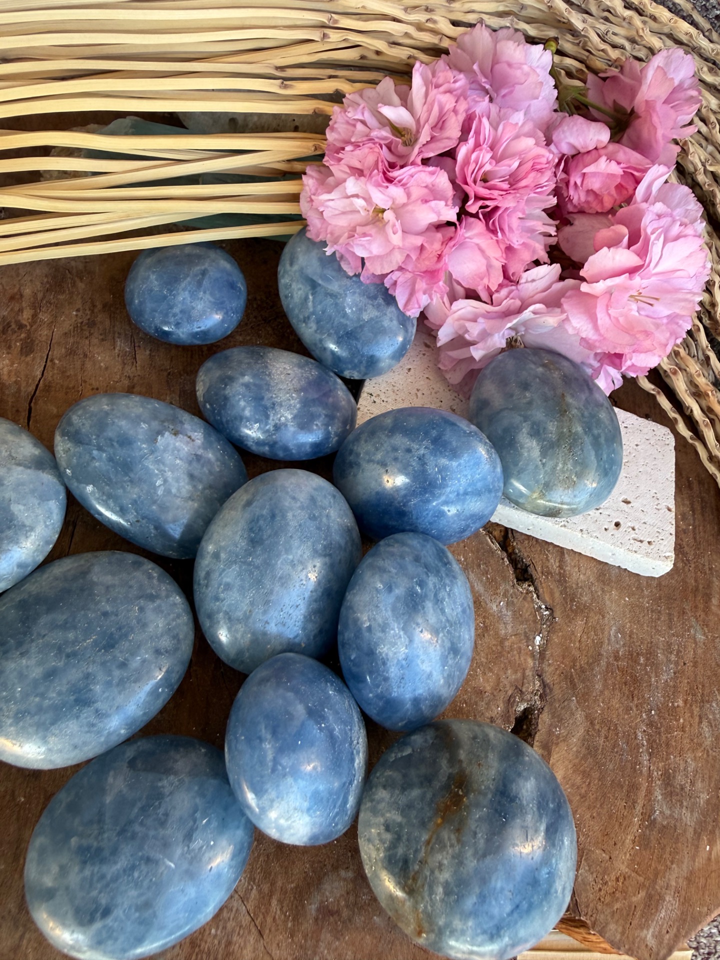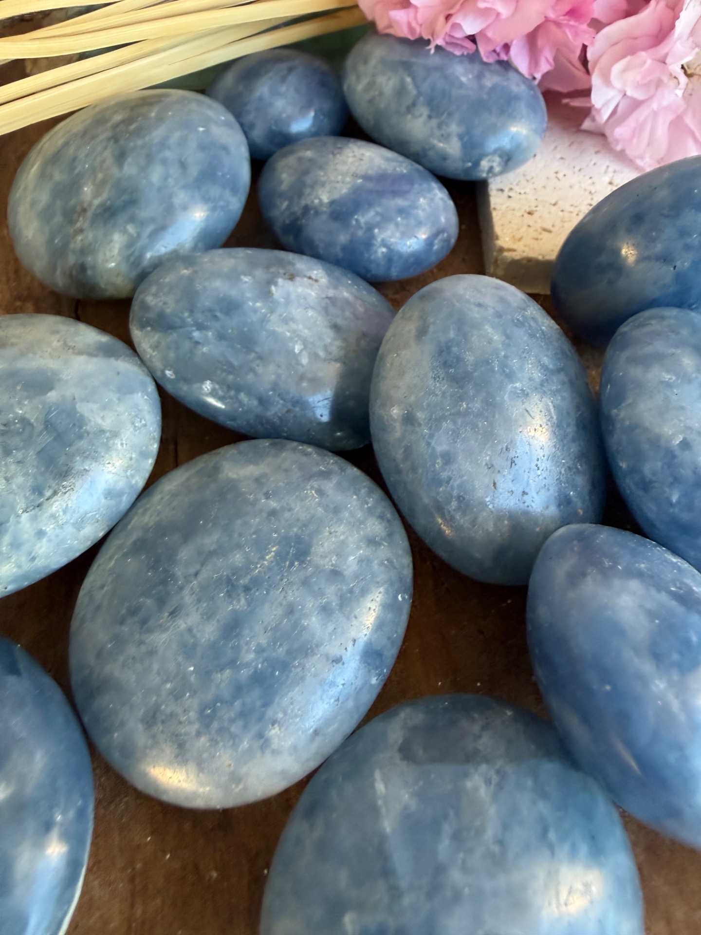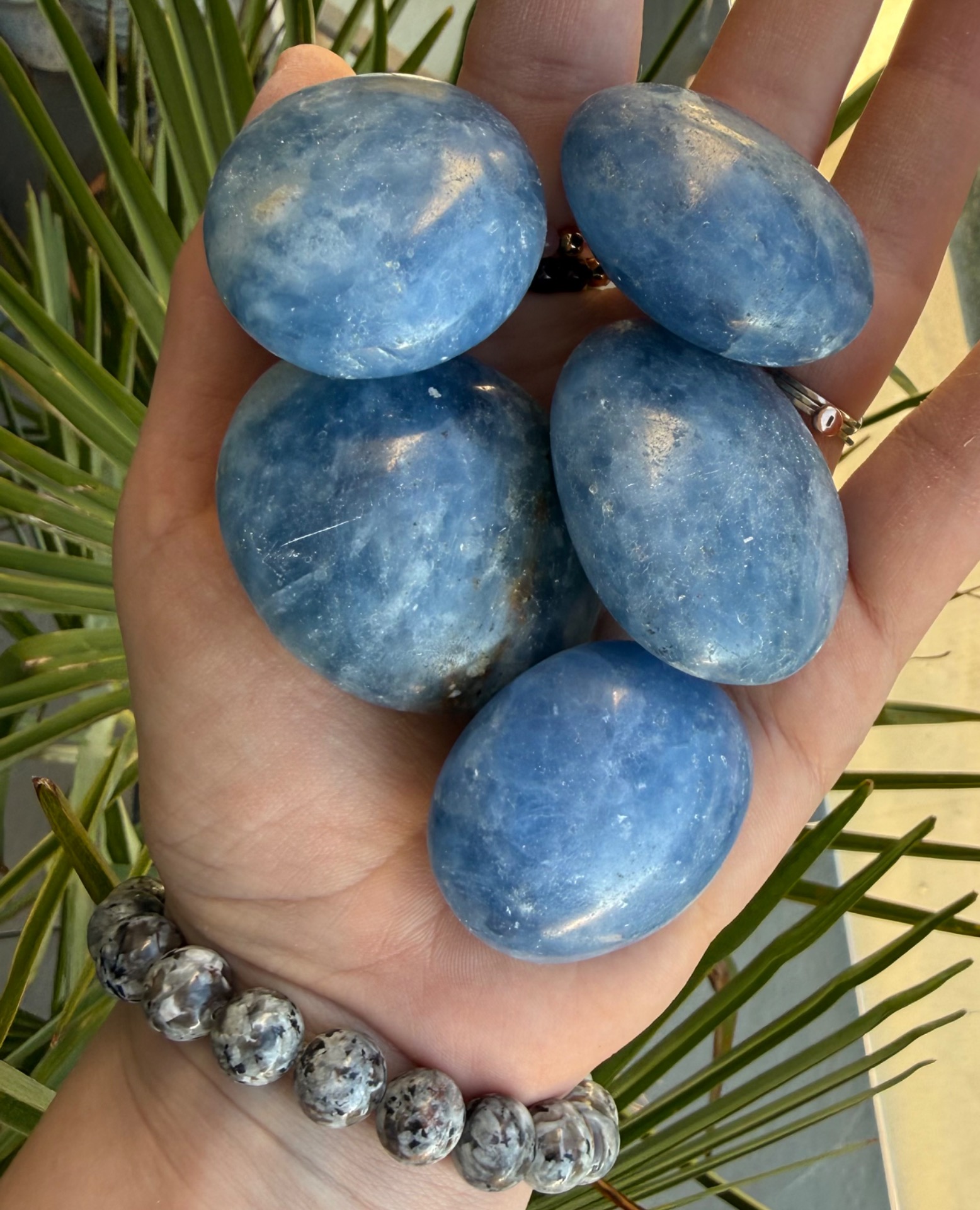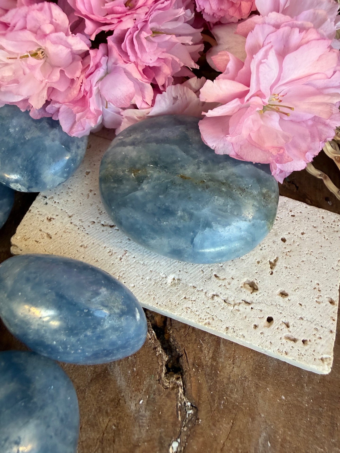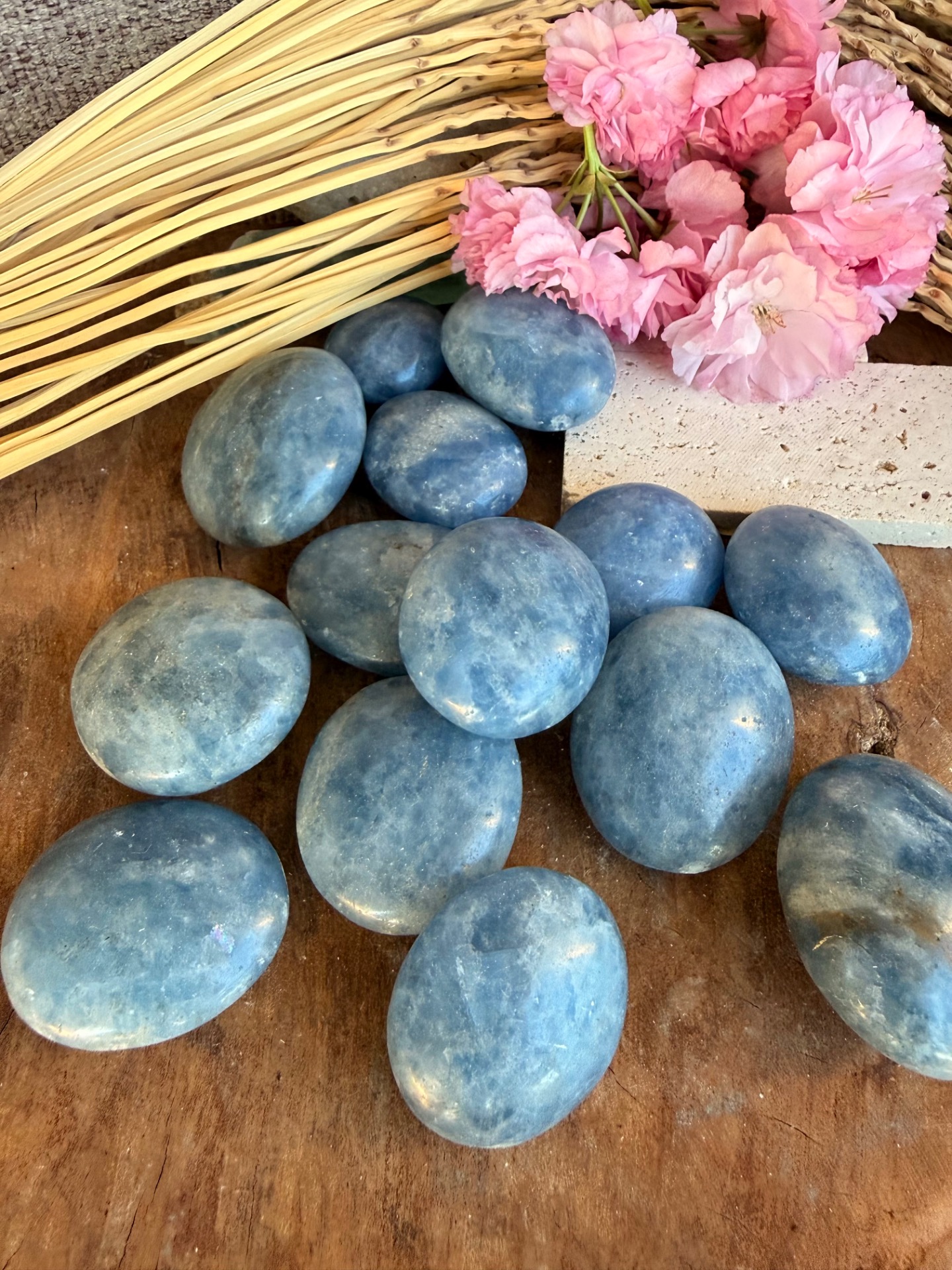 Tento jemný modrý kalcit v tvare hmatky je príjemný, hladký a prirodzene zaoblený kameň, ktorý perfektne padne do ruky. Jeho svetlomodrá až mliečna farba pôsobí upokojujúco a zároveň veľmi čisto, ako jemná energia vody a pokoja.