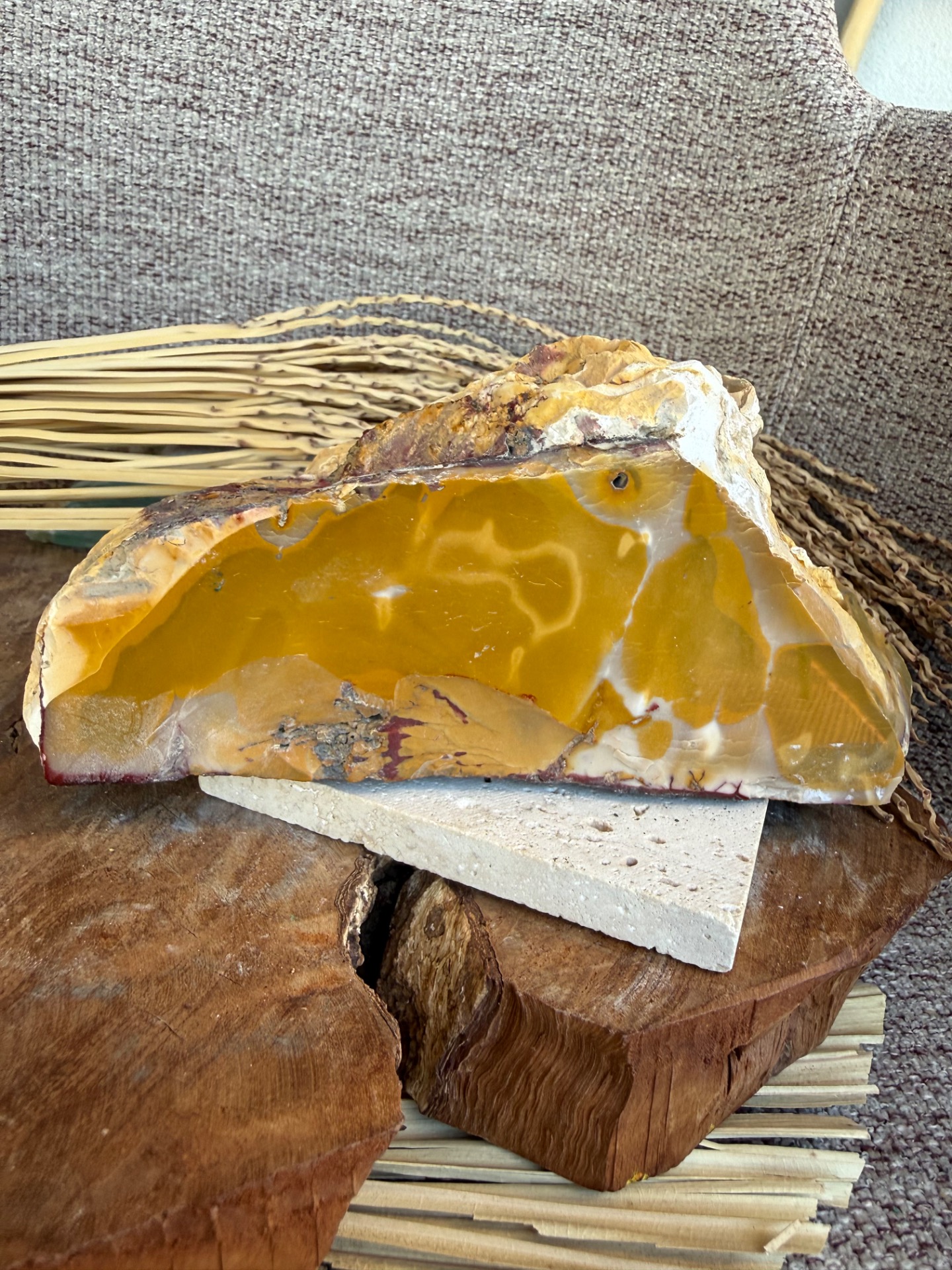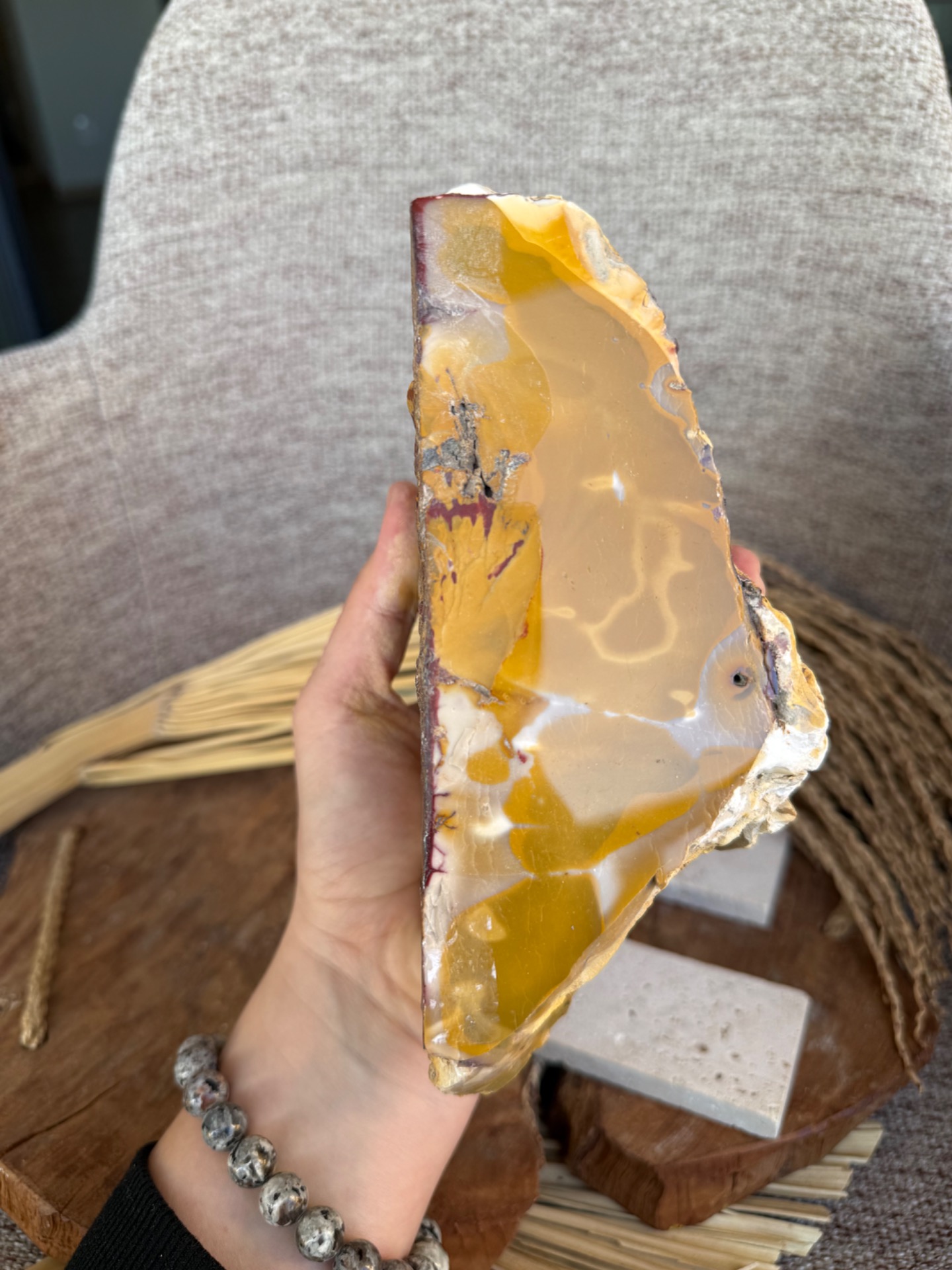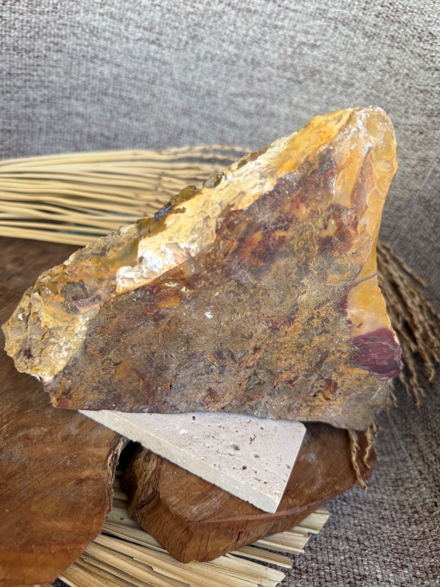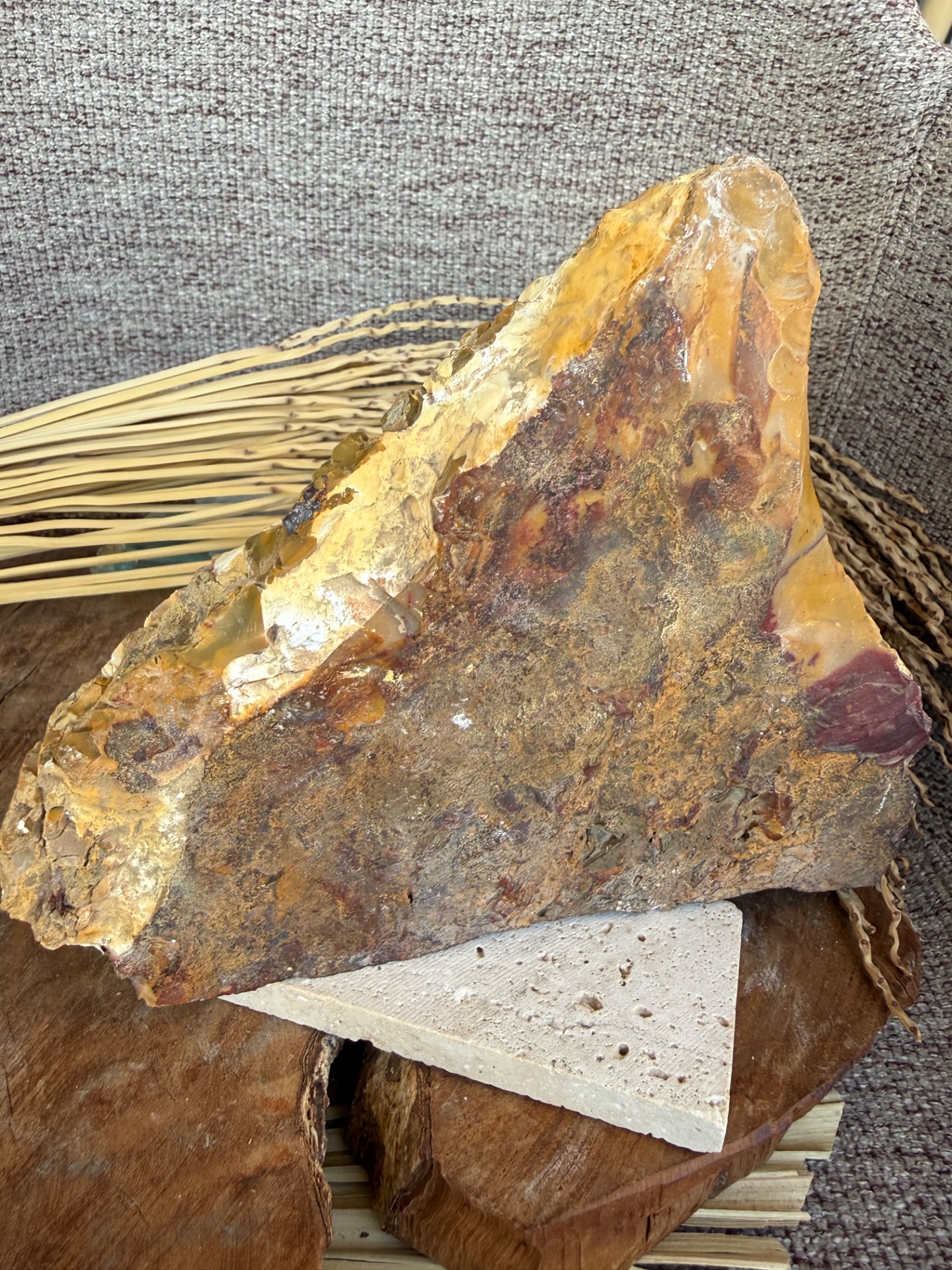Tento výnimočný mokait jaspis je výrazný, veľký voľne stojaci kus s nádhernou hrou farieb, kde sa spája sýta žltá, teplá červená a zemité prírodné tóny. Jedna strana je precízne leštená do hladka, vďaka čomu vynikne intenzívna žltá farba a kresba kameňa, zatiaľ čo zvyšok zostáva úplne surový – autentický, prírodný a nedotknutý.