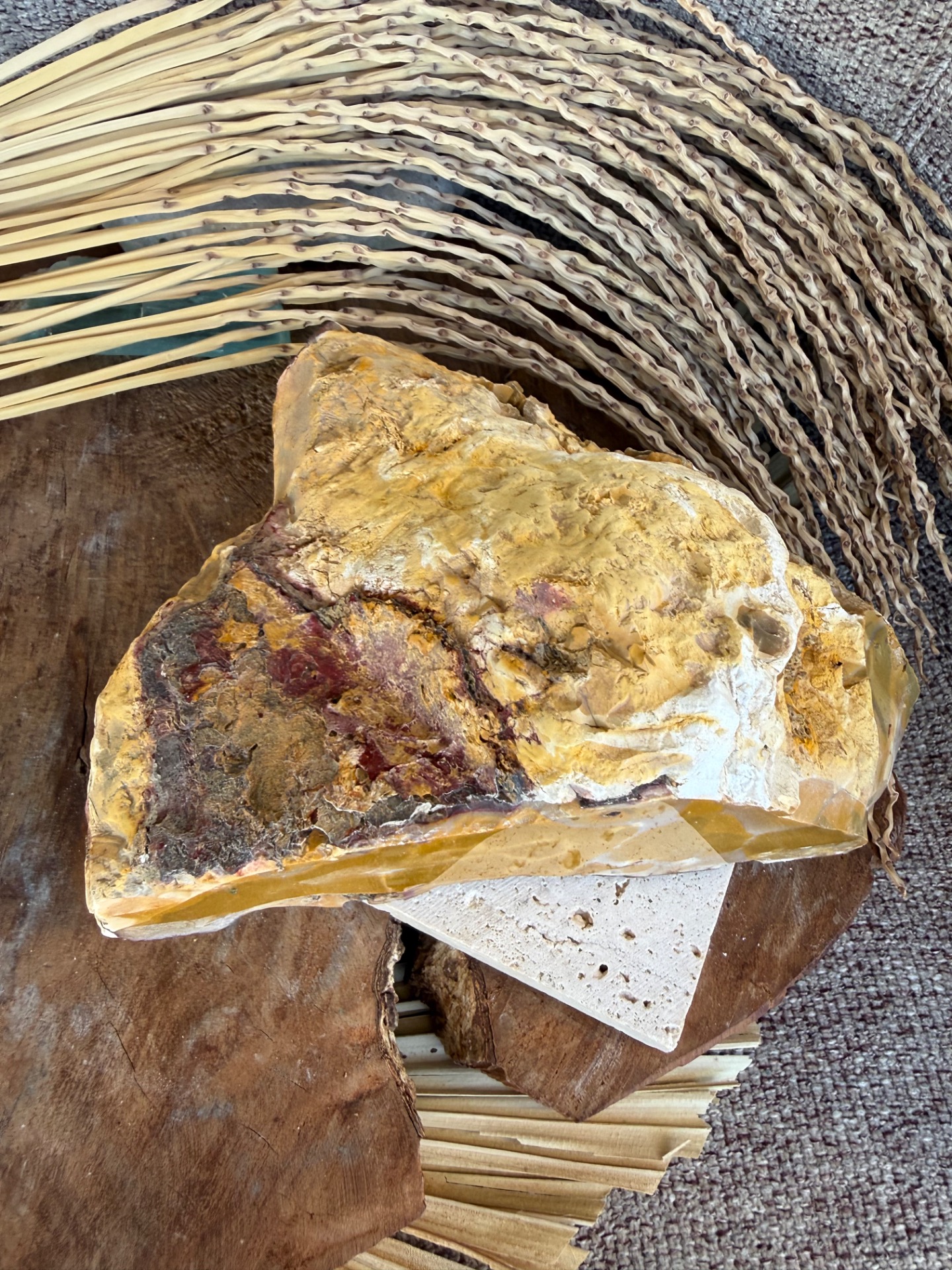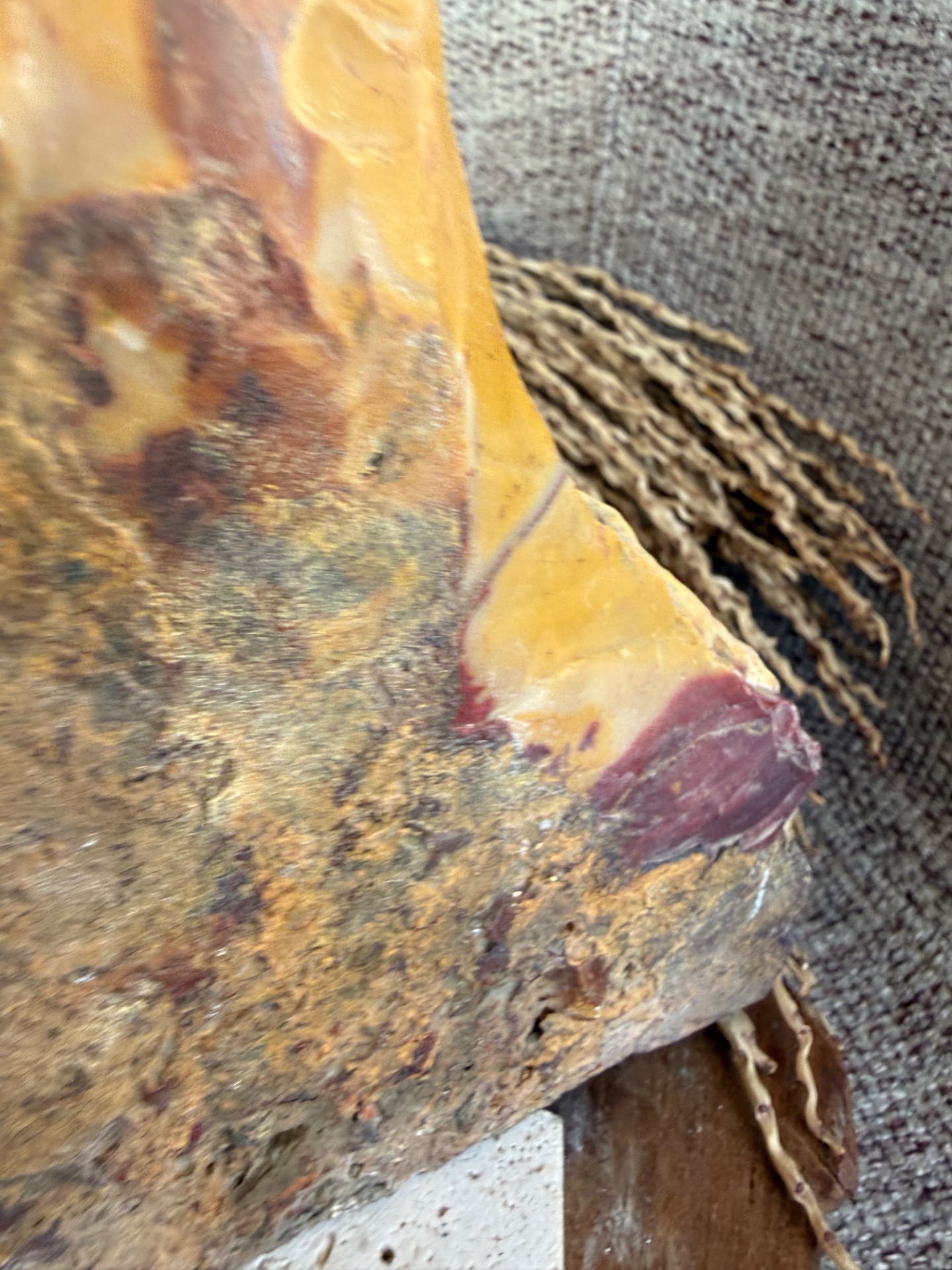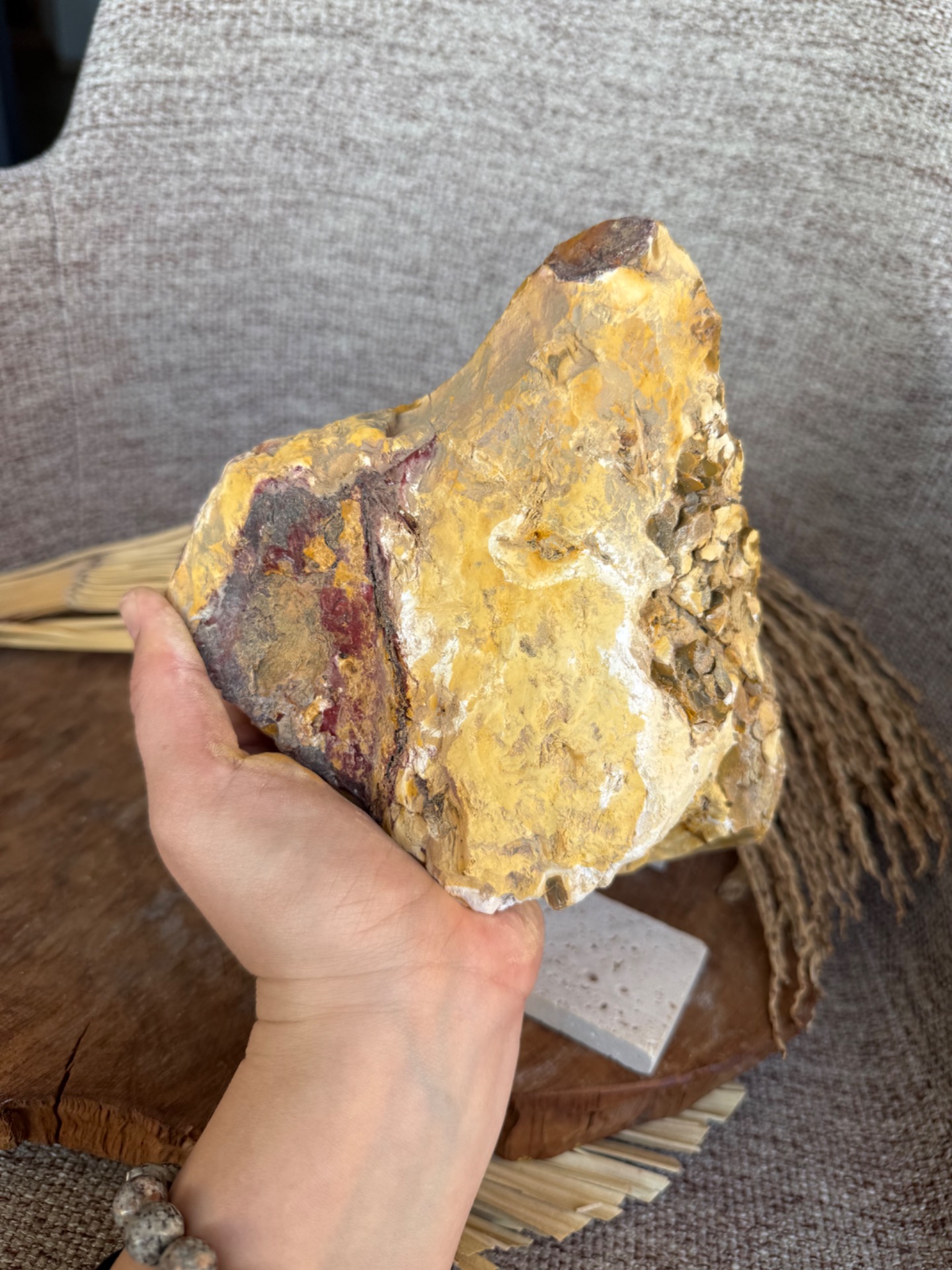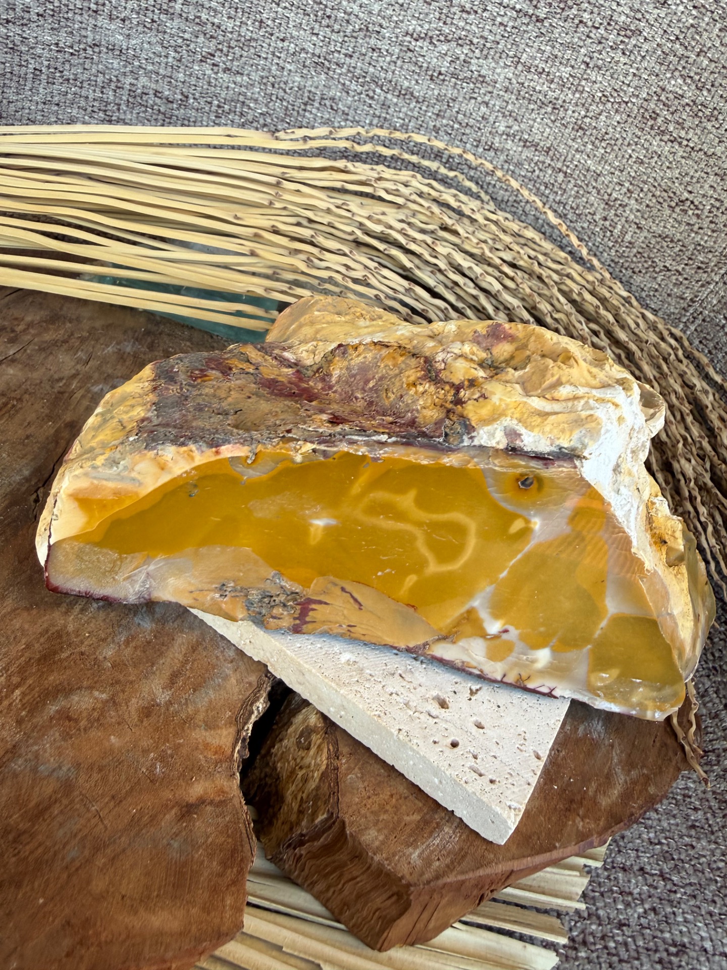 Tento výnimočný mokait jaspis je výrazný, veľký voľne stojaci kus s nádhernou hrou farieb, kde sa spája sýta žltá, teplá červená a zemité prírodné tóny. Jedna strana je precízne leštená do hladka, vďaka čomu vynikne intenzívna žltá farba a kresba kameňa, zatiaľ čo zvyšok zostáva úplne surový – autentický, prírodný a nedotknutý.