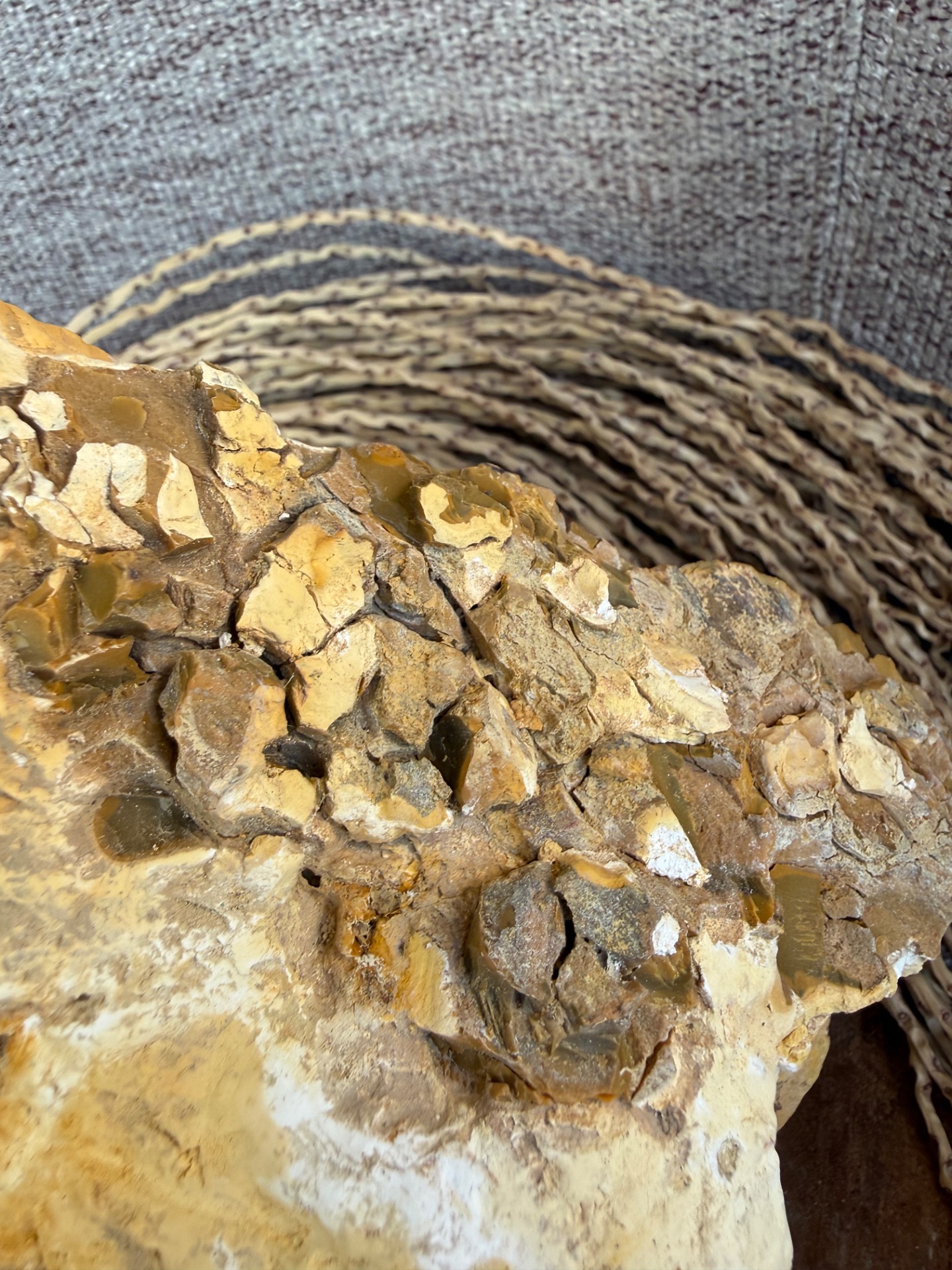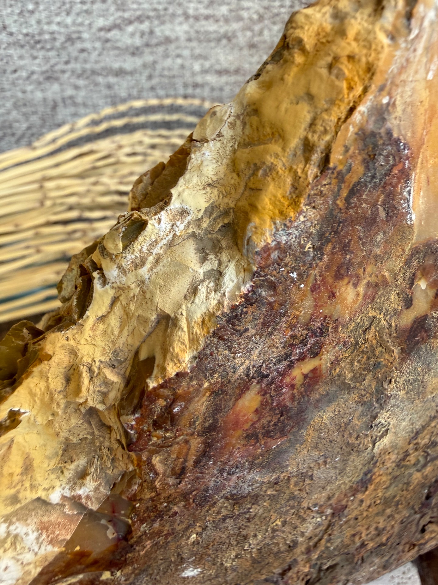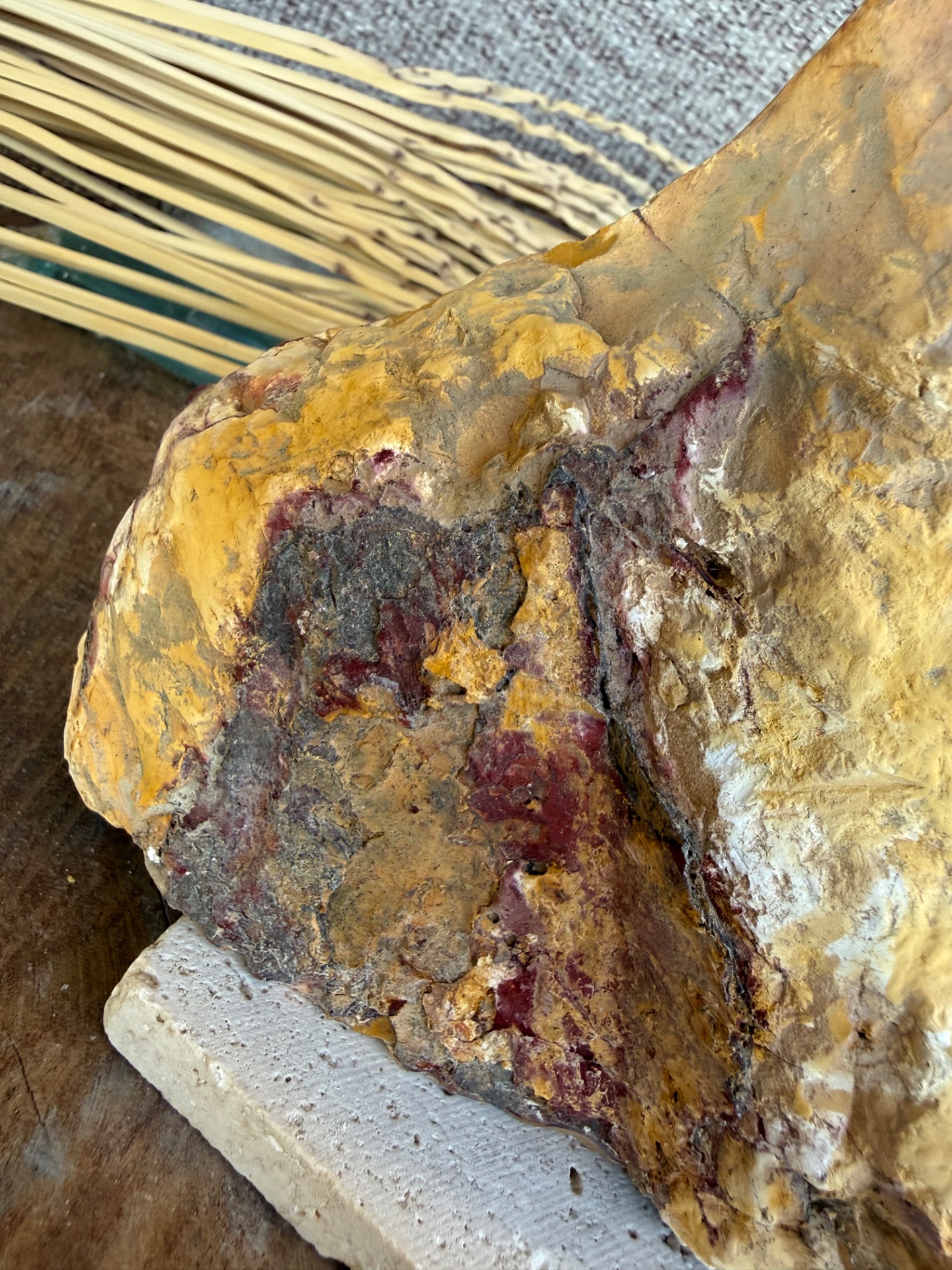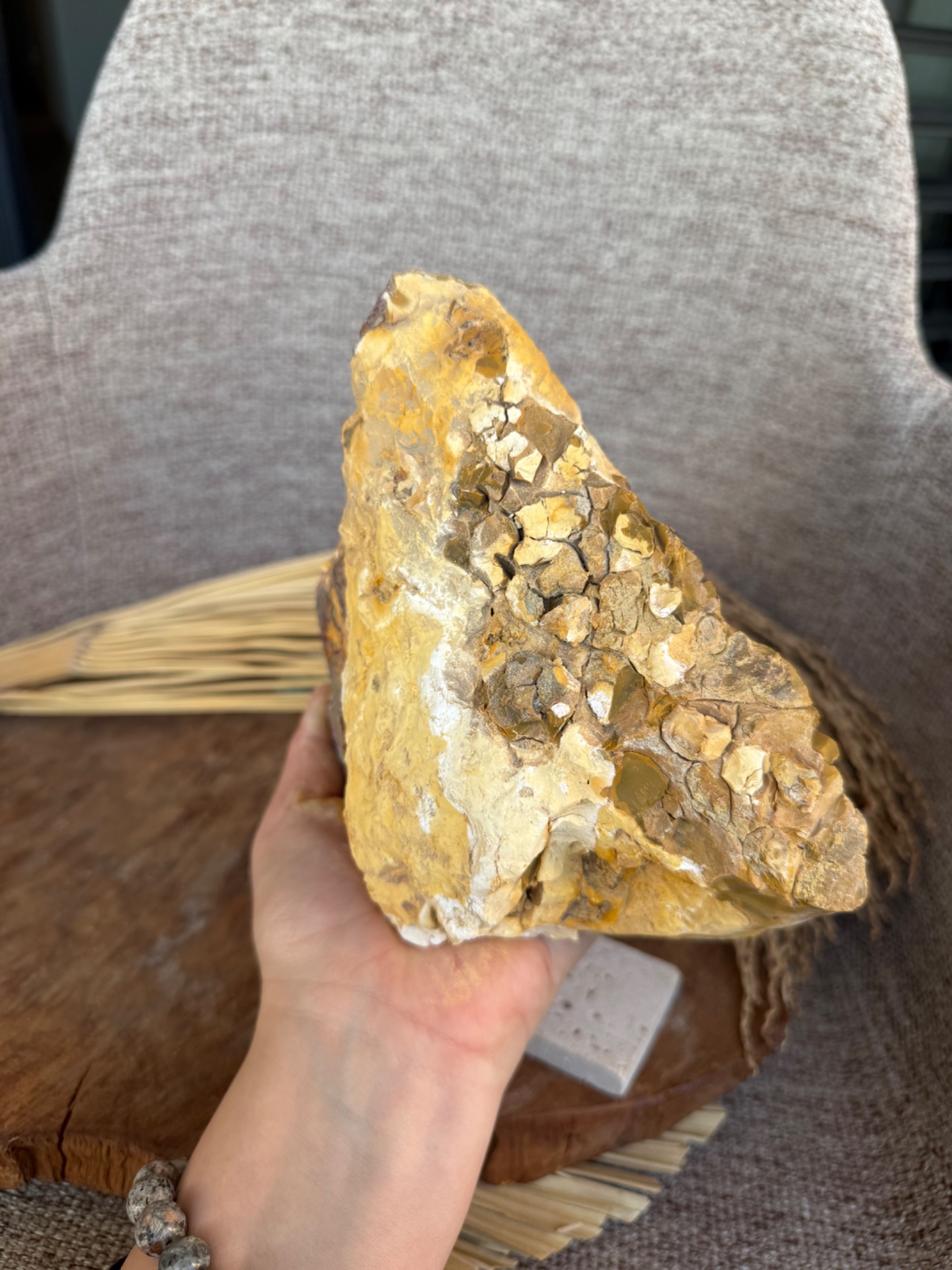Tento výnimočný mokait jaspis je výrazný, veľký voľne stojaci kus s nádhernou hrou farieb, kde sa spája sýta žltá, teplá červená a zemité prírodné tóny. Jedna strana je precízne leštená do hladka, vďaka čomu vynikne intenzívna žltá farba a kresba kameňa, zatiaľ čo zvyšok zostáva úplne surový – autentický, prírodný a nedotknutý.