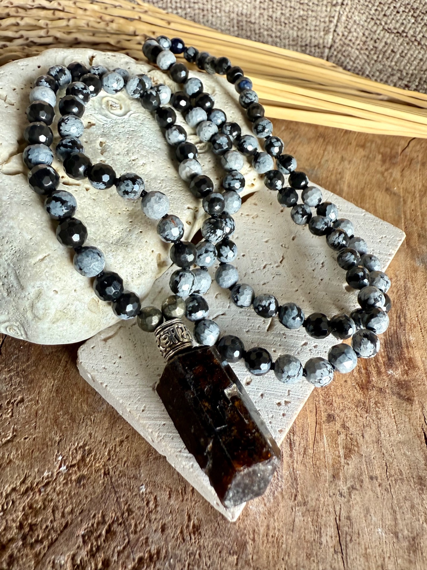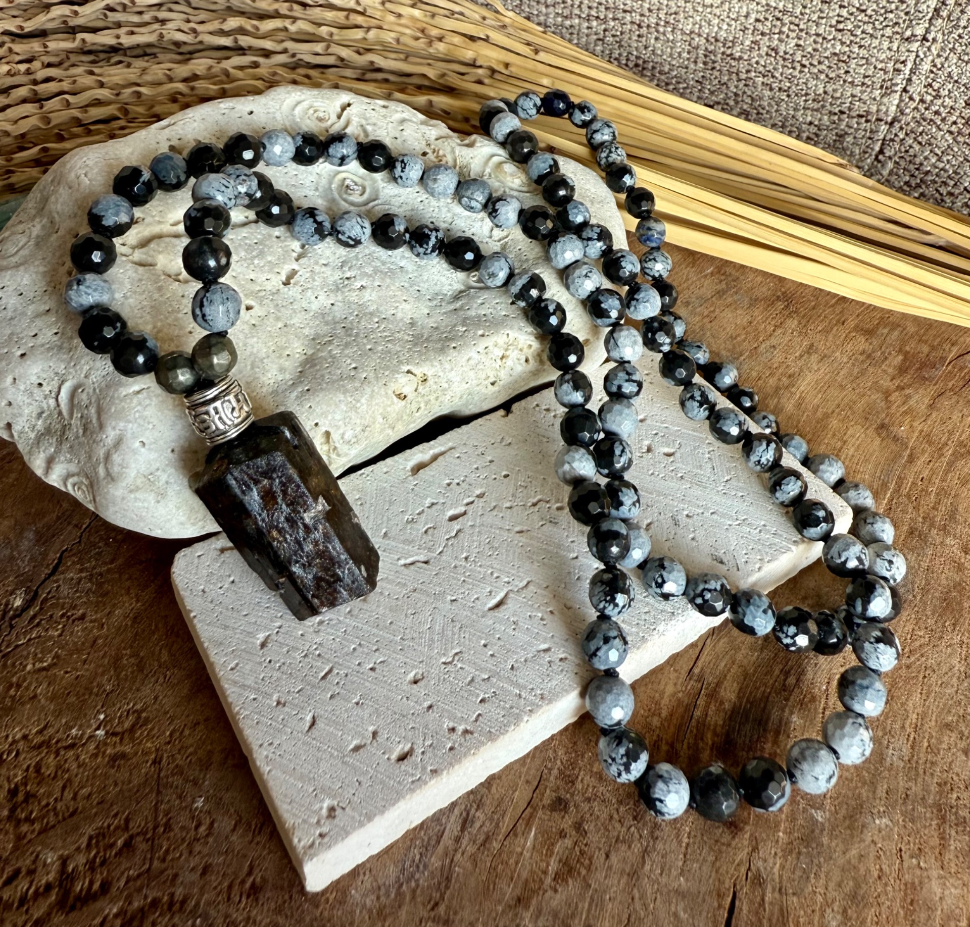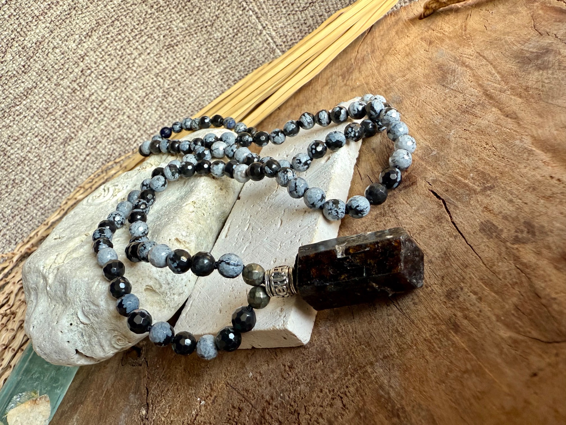Tento výnimočný náhrdelník je ručne vytvorený z fazetovaných korálok Snowflake Obsidian s priemerom 6 mm. Jemný výbrus korálok krásne zachytáva svetlo a zvýrazňuje prirodzenú kresbu typických "vločiek", ktoré robia každý kameň originálnym.