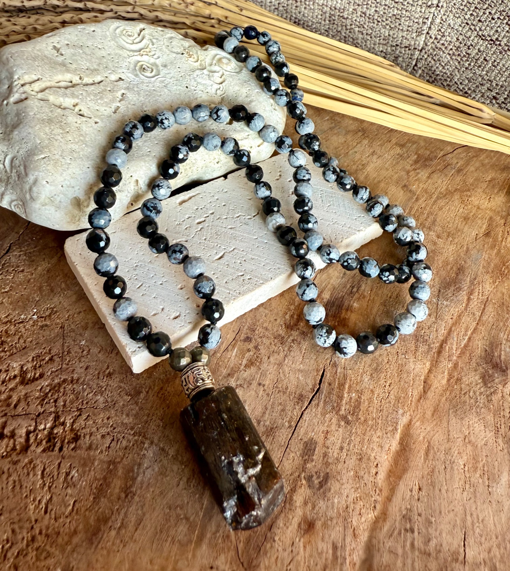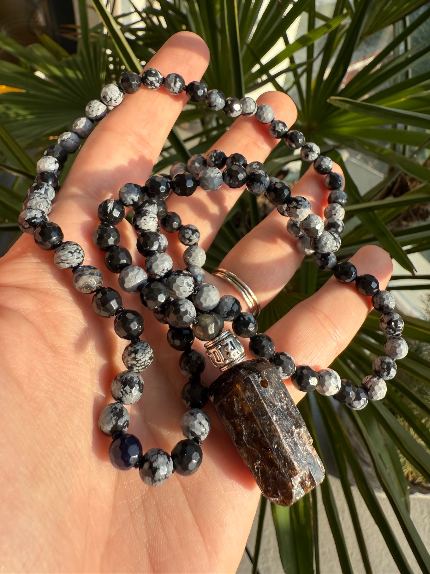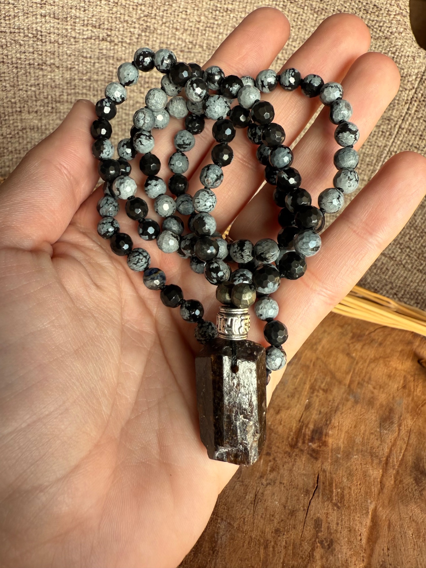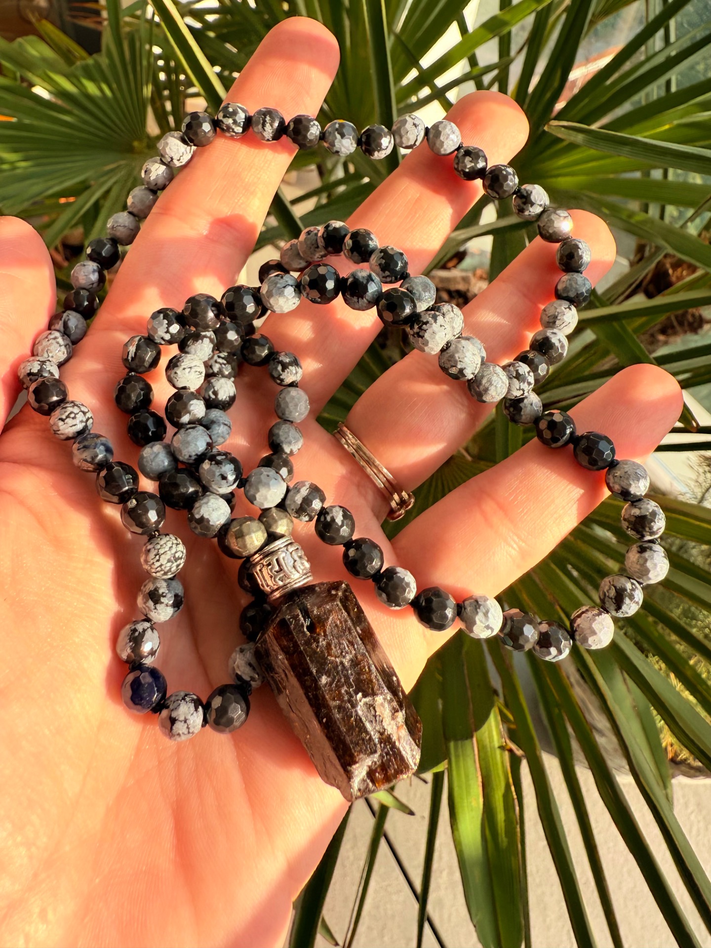 Tento výnimočný náhrdelník je ručne vytvorený z fazetovaných korálok Snowflake Obsidian s priemerom 6 mm. Jemný výbrus korálok krásne zachytáva svetlo a zvýrazňuje prirodzenú kresbu typických "vločiek", ktoré robia každý kameň originálnym.