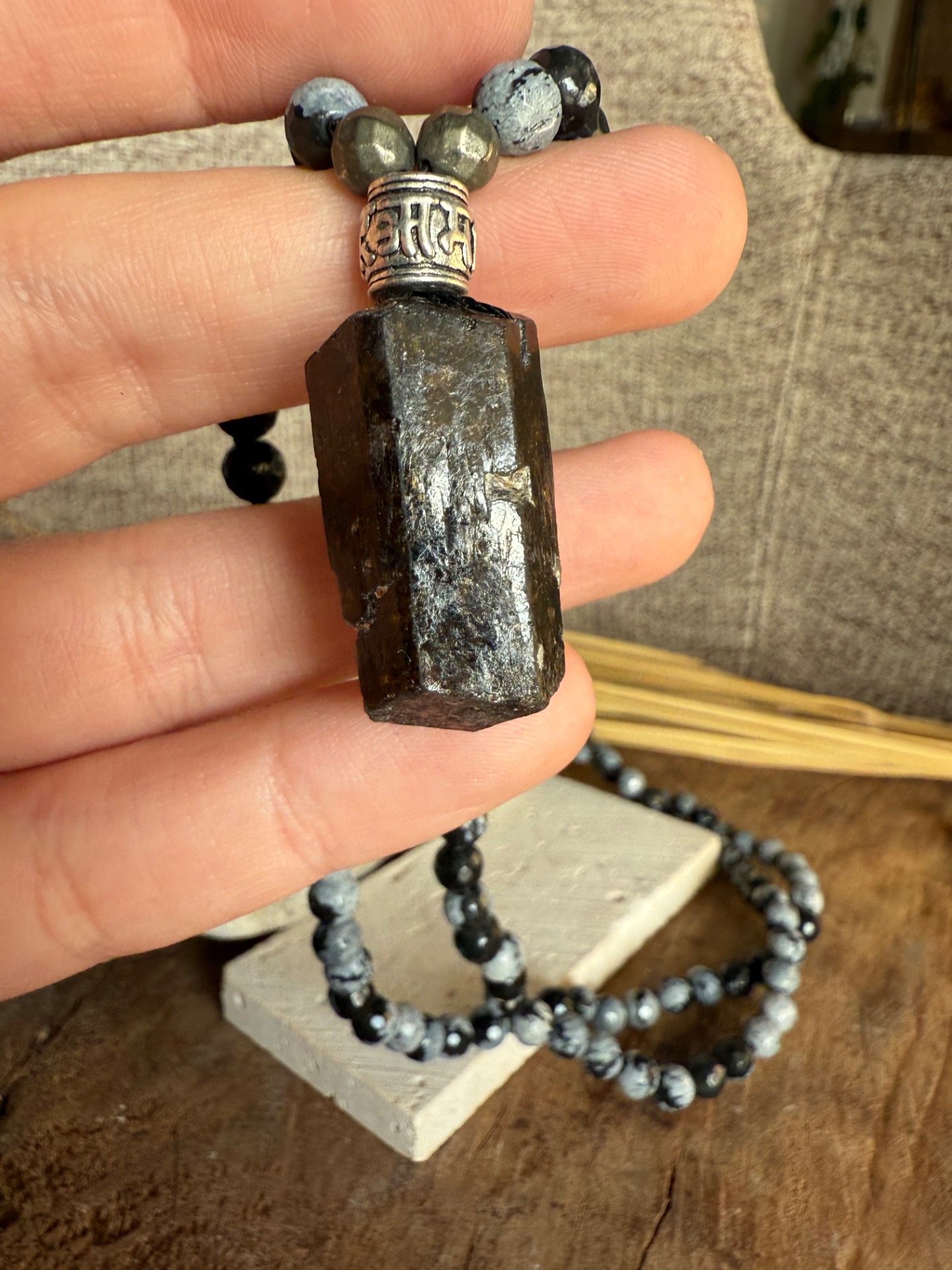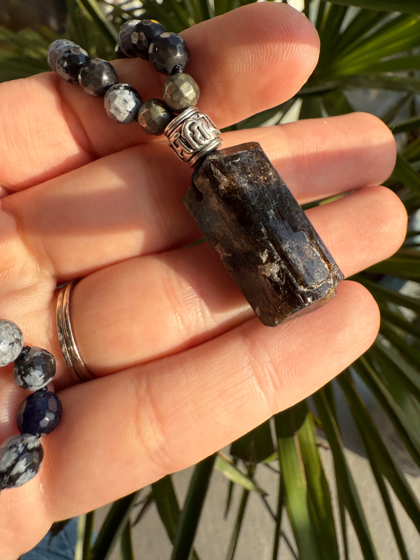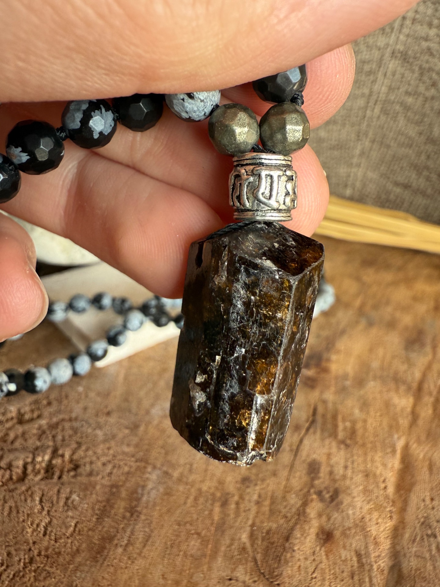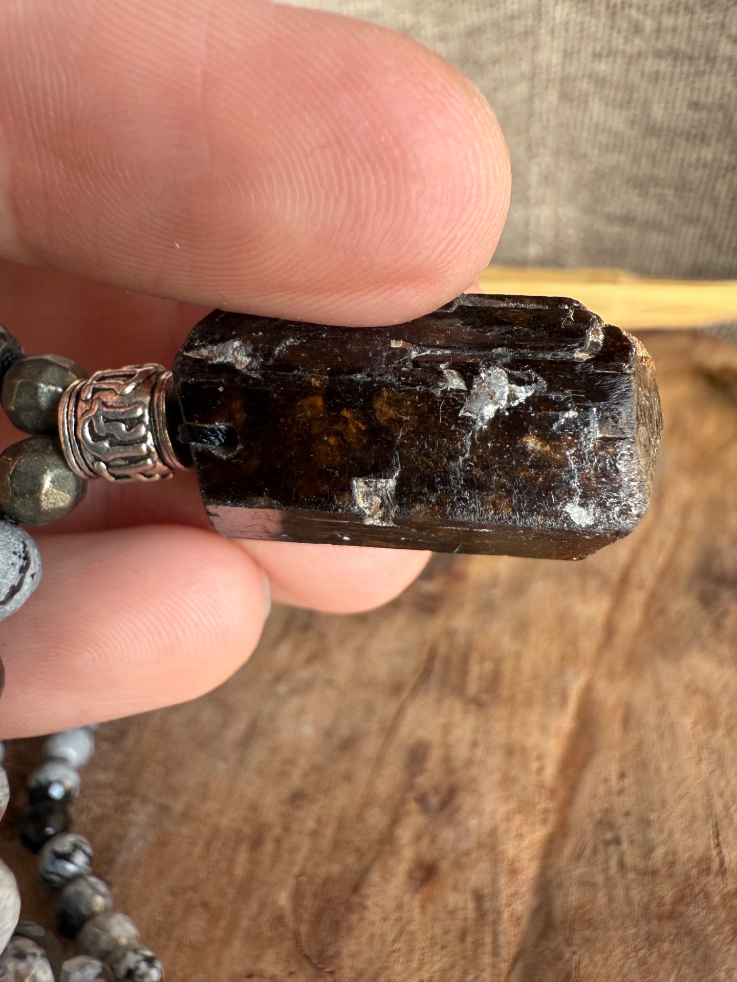 Dominantou náhrdelníka je surový kryštál Green Tourmaline, ktorý si zachováva svoju autentickú prírodnú podobu. Nad ním sa nachádza tibetská korálka doplnená o dva kamene Pyritu, ktoré symbolicky predstavujú silu, ochranu a stabilitu.